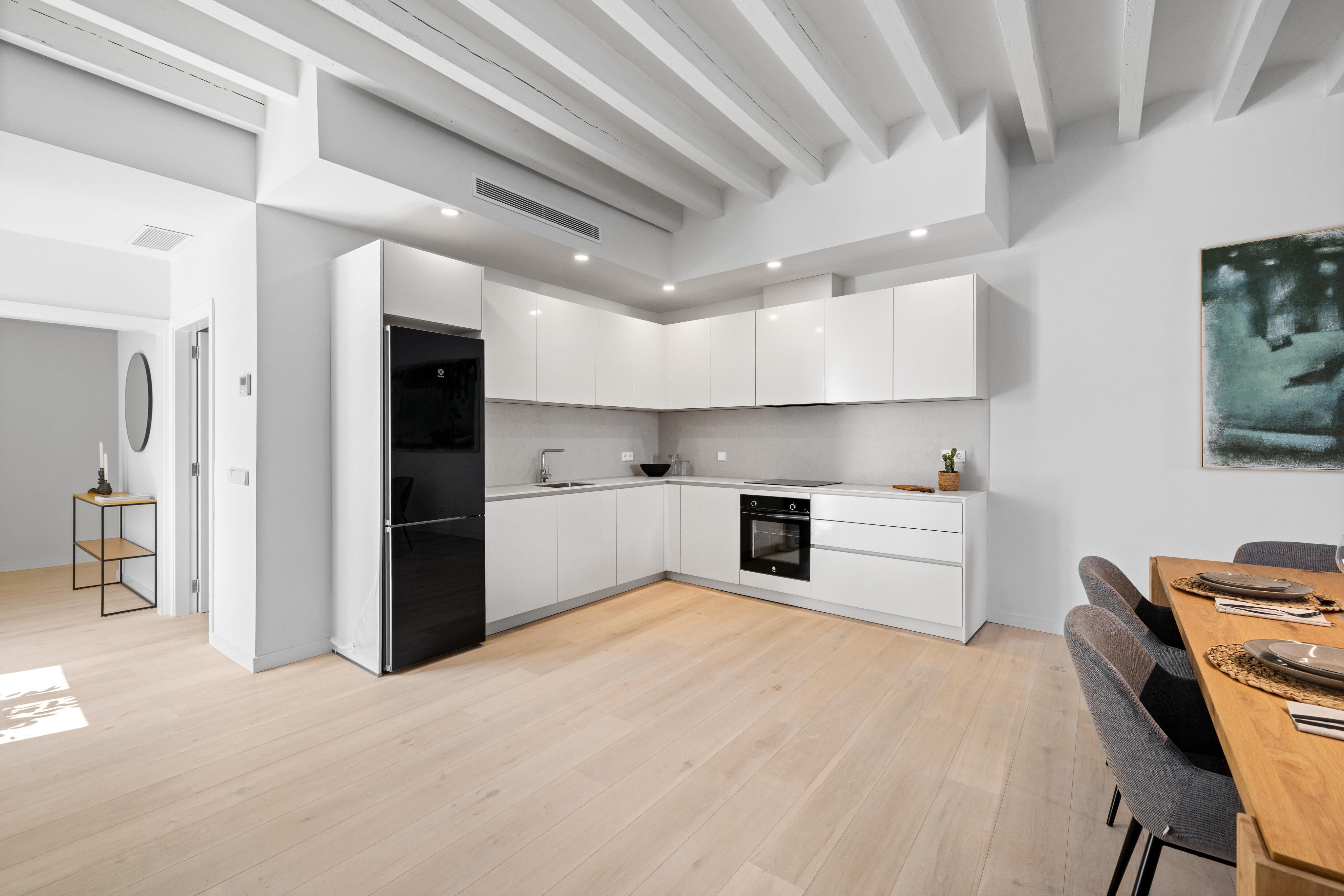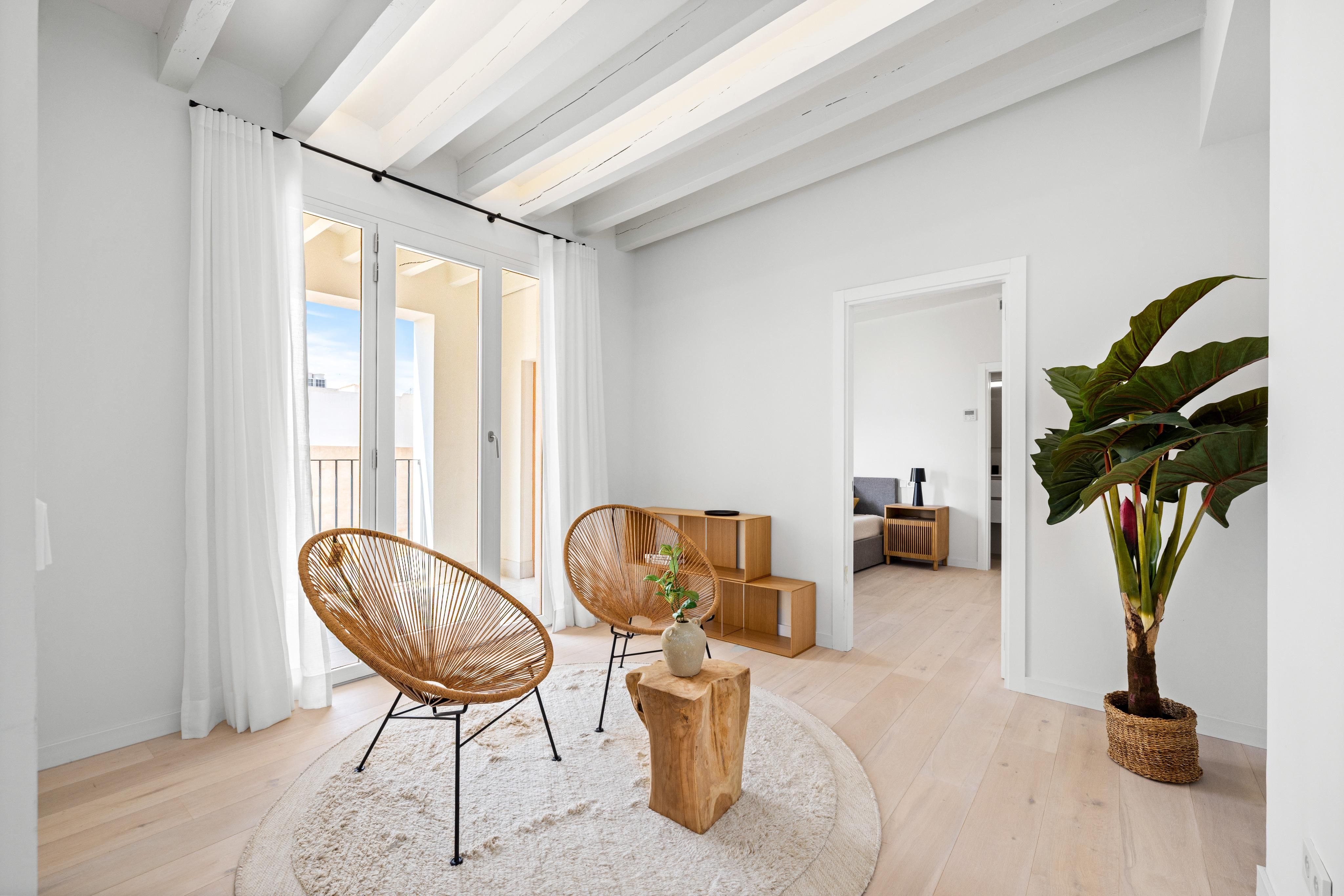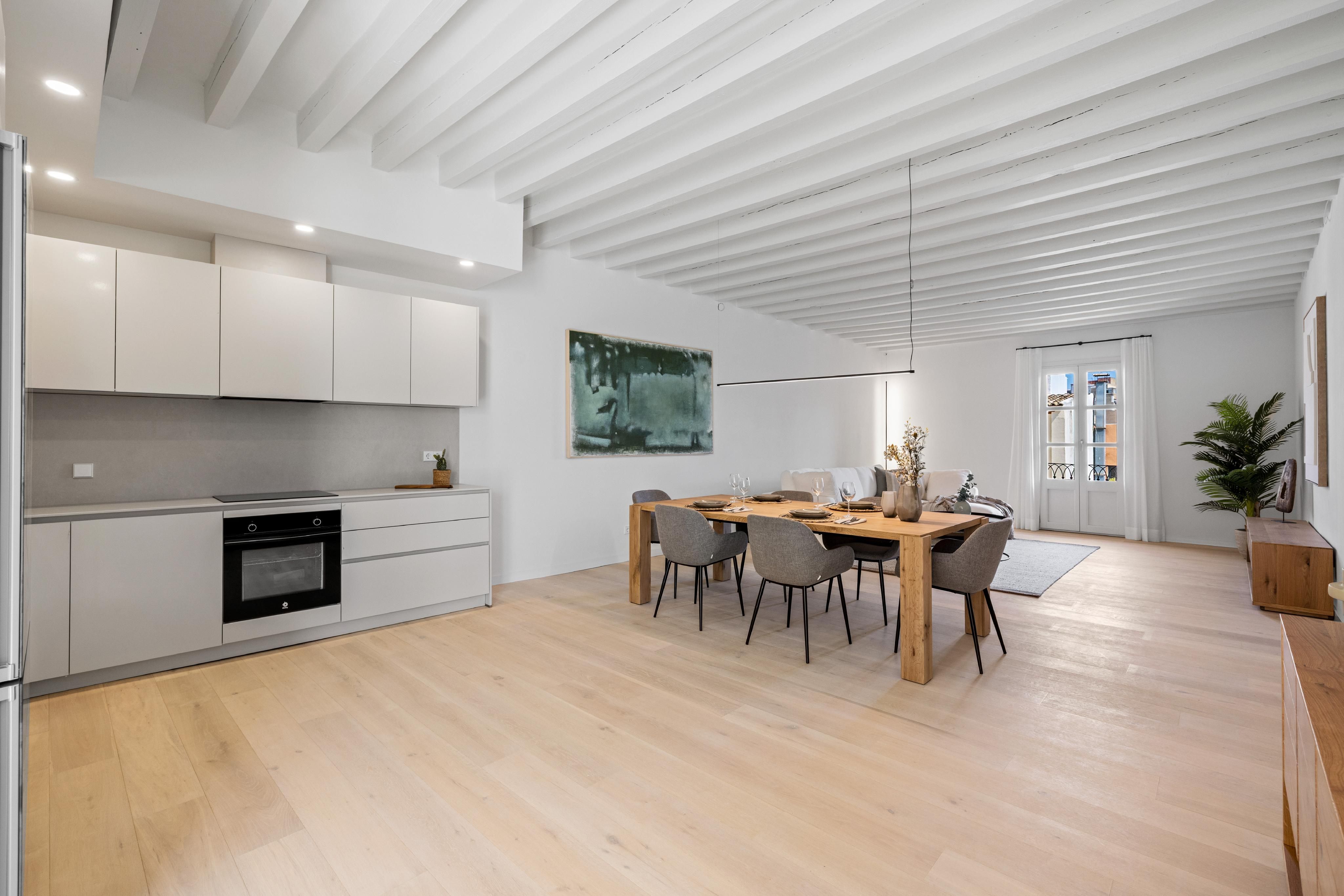 This promising project is located on a pedestrian street, close to the emblematic Plaza Mayor and comprises a total of seven residential units. All apartments have an open-plan living and dining area with integrated or adjoining kitchen, 1-2 bedrooms, 1-2 bathrooms and, in some cases, a separate utility room. The two penthouses also offer a private roof terrace. Wooden flooring in the living areas and tiles in the bathrooms combine comfort with elegance. The contemporary design as well as the brightness, character and convenience convert these units’ little gems in the heart of the Old Town. This impressive penthouse covers a total area of 137 sqm with an additional private roof terrace of 52 sqm. It offers a spacious living and dining room with integrated kitchen as well as two bedrooms with a second living room and veranda access (5 sqm) as well as two bathrooms. Central air conditioning as well as a lift in the building and a parking space in the in-house underground garage offer additional comfort and round off this attractive offer. An excellent opportunity to enjoy a functional home with many amenities in the beautiful Old Town of Palma!