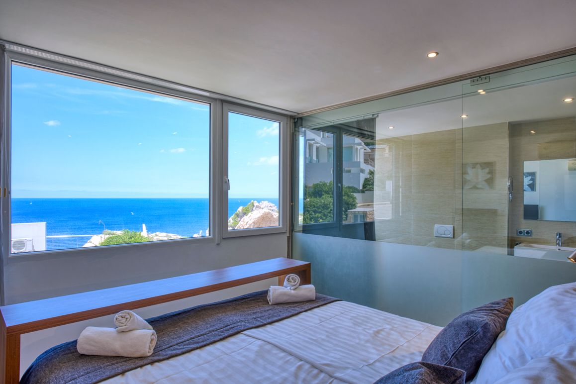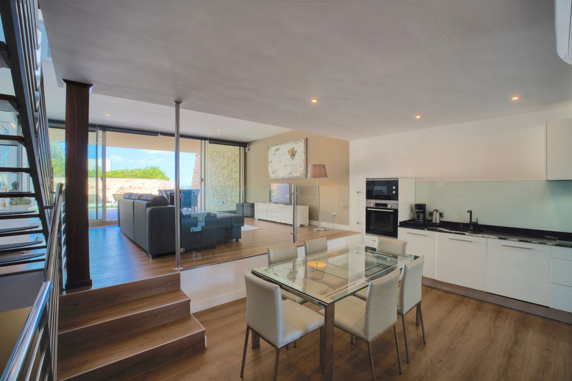 This exclusive townhouse is located in the idyllic residential area of Es Pelats, one of the quieter and most charming parts of Cala Ratjada – in an absolutely exclusive location on the front sea line with an unobstructed sea view. The communal property covers an impressive 2,323 m² and underscores the exclusive character of the complex. The unique location combines absolute tranquility with excellent infrastructure: shops, restaurants, the harbor, and all important facilities are within walking distance. The surroundings captivate with their natural beauty: picturesque bays like Cala Gat or Cala Agulla, fine sandy beaches with turquoise waters, and expansive pine forests define the landscape. Active vacationers will also get their money's worth here – whether hiking along the coast, cycling through the Tramuntana foothills, or golfing at the renowned Capdepera Golf Course, which is only a few minutes' drive away. The townhouse, built in 2010, offers 243 m² of living space and 210 m² of usable space, providing the highest living comfort in modern architecture. The open, well-equipped fitted kitchen smoothly transitions into the elegant living area, creating an airy, light-filled atmosphere through the semi-open room design. Two spacious bedrooms, two stylish bathrooms, and a separate guest toilet ensure comfort. Two balconies and two terraces offer spectacular views of the sea and the surrounding nature. The well-maintained communal garden with a pool area invites relaxation, while the air conditioning ensures a pleasant room climate at any time of the year. This dream residence is rounded off by two underground parking spaces and a utility room.
