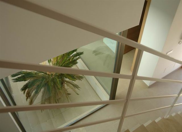 The property is distributed over two levels and features a contemporary design with abundant natural light, enhanced by an elegant glass-enclosed interior patio.