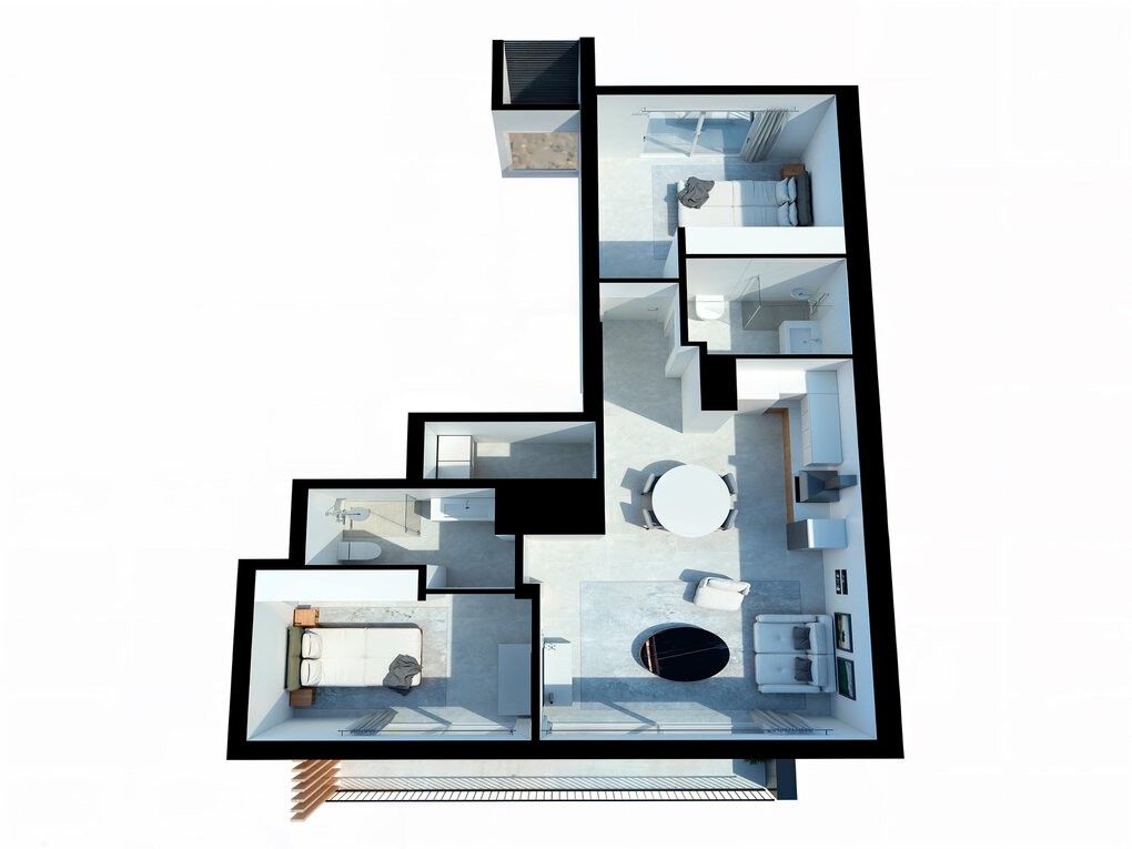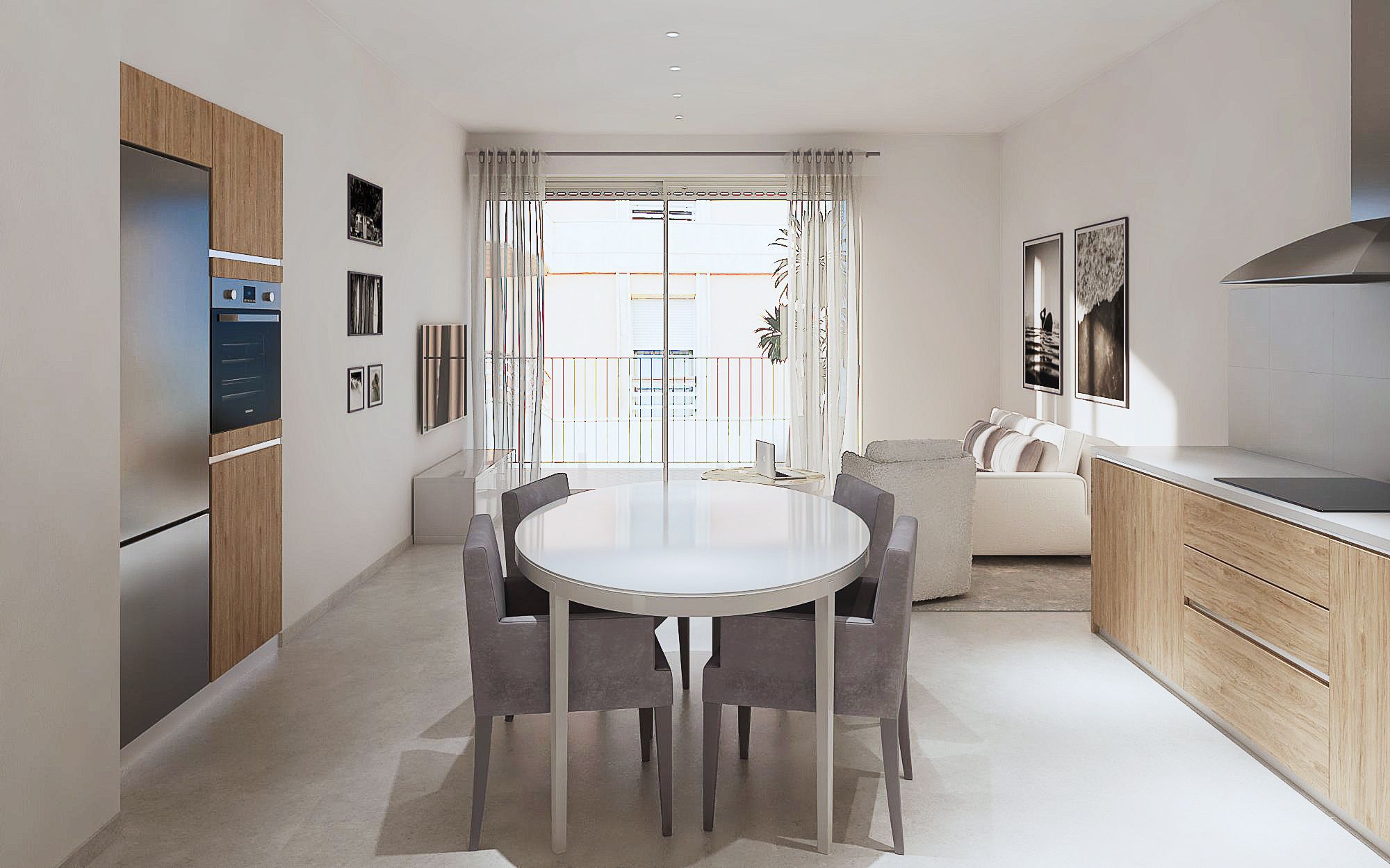 Dreams are coming true in this revitalization: A new construction project which is situated a few steps from the beach and very near to Palma City. The aspiring location in combination with modern features make hearts skip a beat. A small community of a total of 7 modern residential units will be built. All apartments will impress you through their smart layout design as well as the commodity of amenities like central air conditioning (warm/cold), central heating through radiators in the living areas. The Flat on the 1st floor, of approx. 75 sqm, is distributed over an open living and dining room including a fully equipped kitchen and access to the 11 sqm terrace, two bedrooms with built-in wardrobes and two bathrooms with shower (one en-suite). Benefit from the symbiosis of a central location close to the sea and a modern lifestyle with all amenities, whether as a second home, holiday apartment or investment for the future. Completion is planned for early 2026.
