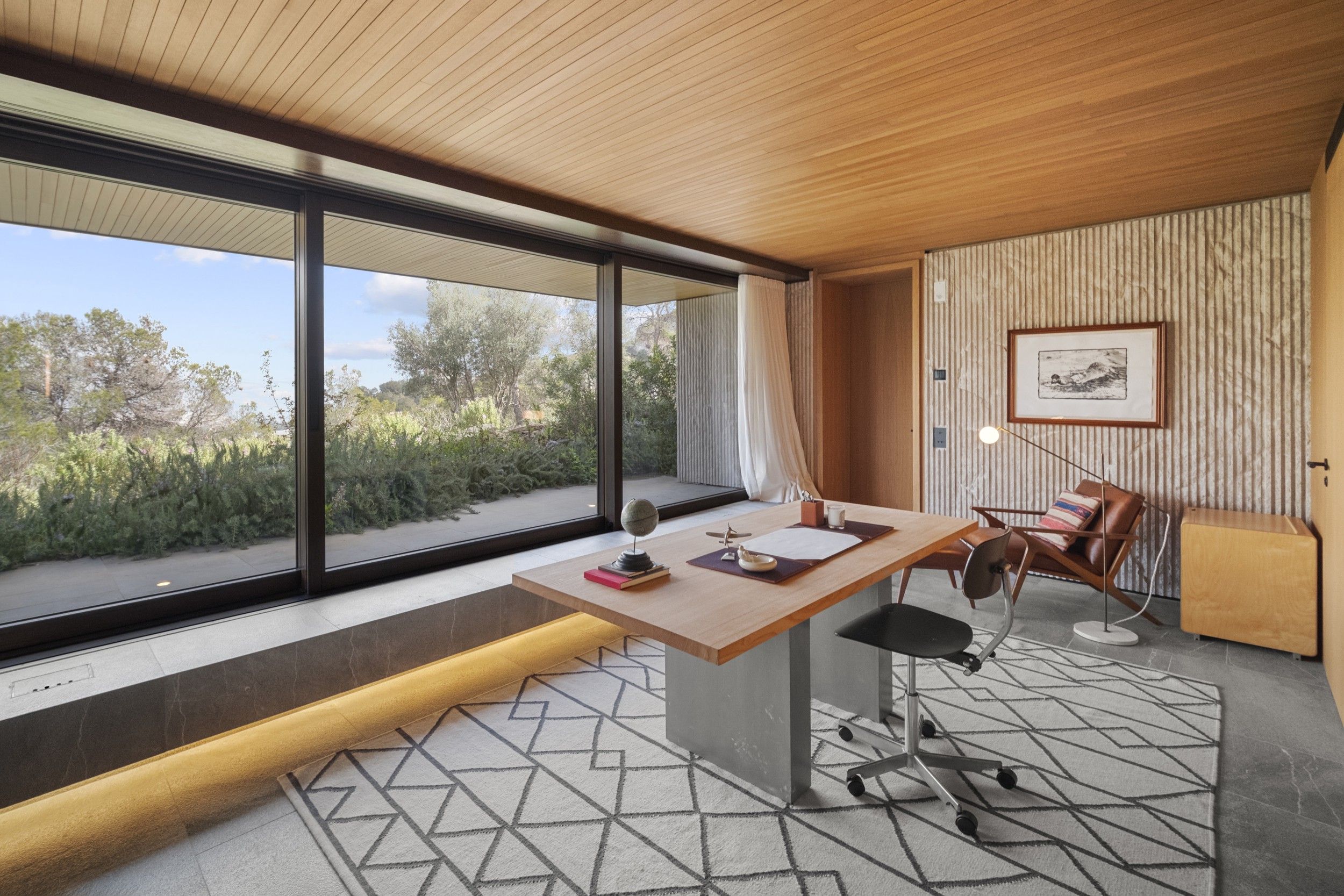 Offering total privacy, yet just minutes from Palma, the villa is designed to bring nature inside. Floor-to-ceiling windows flood the spaces with light, while the scent of rosemary and citrus drifts through the air, carried by the gentle mountain breeze, making nature a constant presence in daily life. The preserved landscape ensures a perfect connection between indoor and outdoor living.