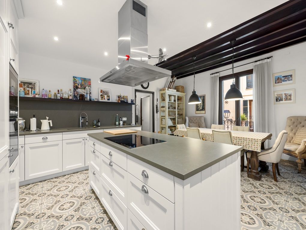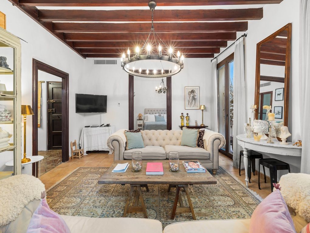 Located on a well-known street in the popular La Lonja district one can find this large, elegant apartment in the Old Town that has been renovated and furnished with great attention to detail. Massive wooden ceiling beams, traditional terracotta tiles, high ceilings and large windows with French balconies provide a charming Mediterranean flair to the property. The apartment offers an inviting salon with an adjoining bedroom as well as walk-in wardrobe and a total of three balconies which allow plenty of daylight.
