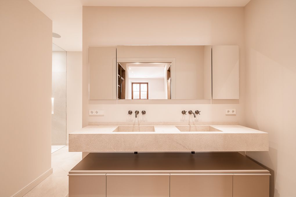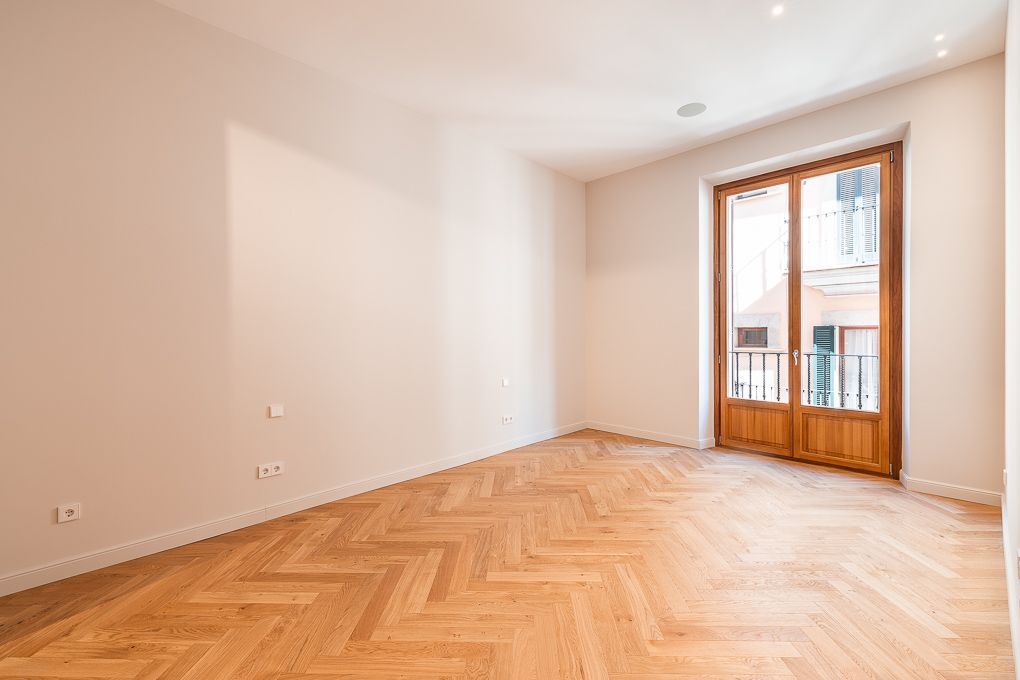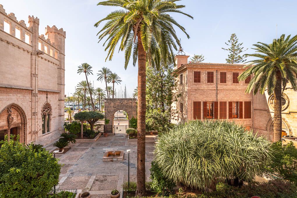 This gracious residence is situated in the attractive La Lonja neighbourhood in the heart of Palma de Mallorca's Old Town. It is directed to one side to the palm-lined harbour street known as Paseo Maritimo and to the other side to one of the alleys steeped in history. While the extensive refurbishment of this historic building there has been created a transformation of the historic building into elegant homes, whilst preserving the original stone facade and tall French windows. This luxurious Belle Etage on the second floor with lift offers an exceptional style as well as comfort and will meet the highest standards. The flat extends over a lounge-like entrance area, a spacious living and dining area with open kitchen, four bedrooms, three bathrooms (two of which en suite), two balconies, an open kitchen (with Gaggenau and Miele appliances) and a separate laundry room. The master bedroom is also equipped with a walk-in wardrobe and an en suite bathroom. Chevron parquet and marble flooring, central air condition, underfloor heating and home automation as well as an audio system are only a few of the special characteristics. For further comfort there is a large parking space and a storage room in the building included. Benefit from a sophisticated as well as modern living experience in the middle of Palma's historic harbour district.