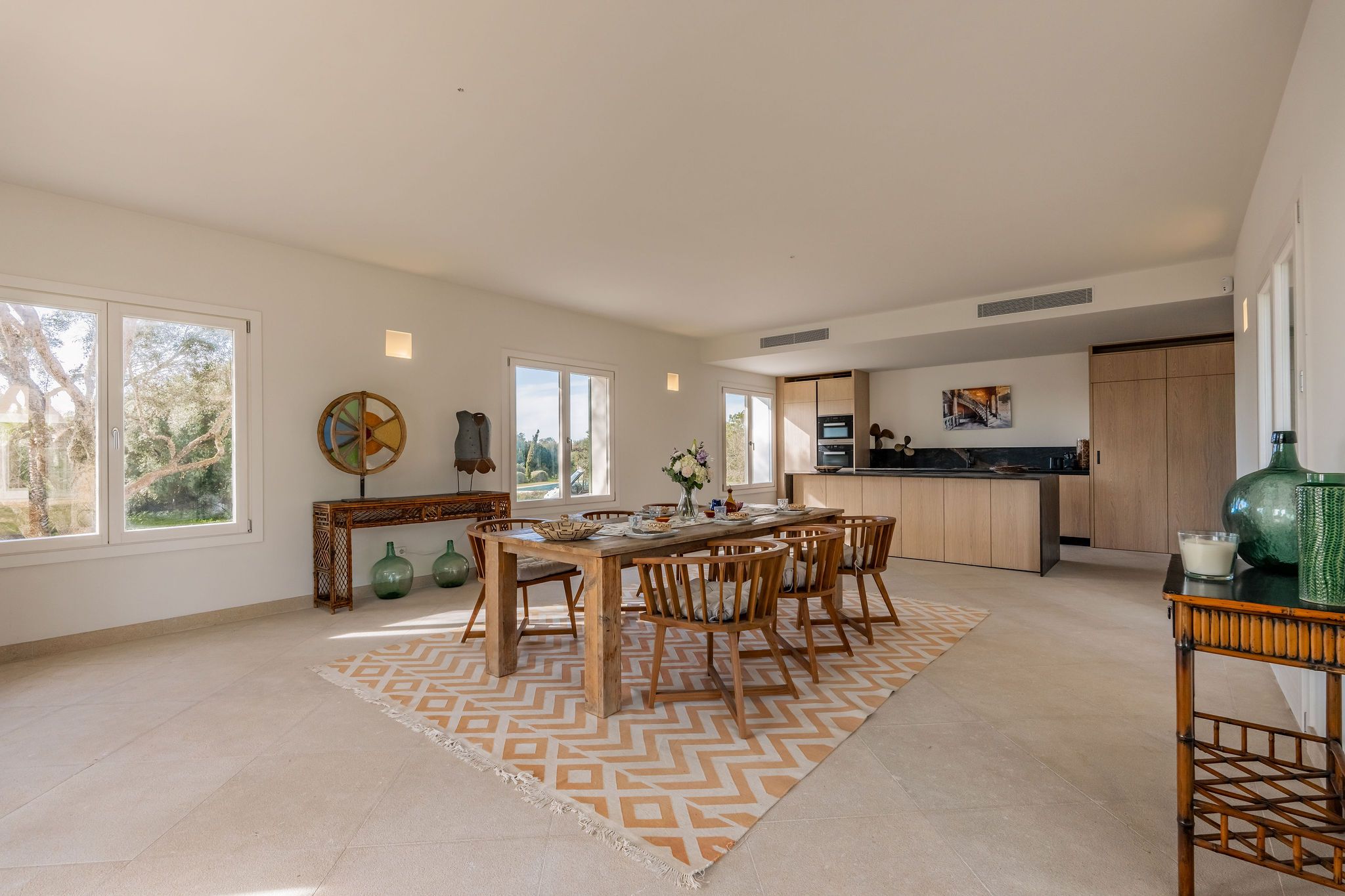 Only a few minutes away from the Caribbean-like, protected natural beach Es Trenc, this impressive finca is being built on a plot of approx. 30,000 m² near Sa Rápita. Completion is scheduled for the summer of 2024. From the outside typically Mediterranean held, you will find inside light-flooded rooms in modern design paired with natural elements such as wood and natural stone. Upon entering, you will walk directly into a spacious living hall of about 60m2 with access to two wings. In the left wing is the fully equipped kitchen with cozy dining area with fireplace. In the right wing there are two bedrooms, each with bathroom en suite and access to the terrace with views of the surrounding countryside. The upper floor has another living area, a fantastic master suite with dressing room and bathroom en suite and two more bedrooms with bathroom en suite, two of them with access on a terrace with fantastic panoramic views to the sea and the island of Cabrera. Underfloor heating as well as air conditioning also guarantee a pleasant ambience in the house all year round. The garden is laid out with much love in Mediterranean style and is irrigated automatically. There you will find the pool of about 50m² and a spacious terrace, which invites you to spend time with family and friends. A separate building of 150 m² with a "Safareig" can be converted into a guest house, a garage or a horse stable. To Campos, with the various shopping facilities and the weekly market you need only 10 minutes by car. The marina of Sa Rapita with its beautiful beach is only a few minutes away. To the airport you need only 35 minutes by car.