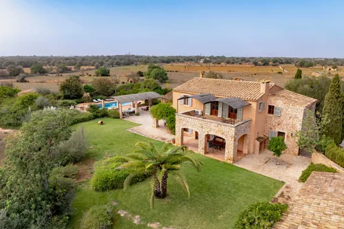This charming finca is offered for seasonal rental between March and June 2026. Wonderfully quiet, located near Santanyi, surrounded by only a few neighboring properties, this 12,430 m² plot features a natural stone finca, created by the renowned Rick Abel in 2001. A lined driveway of approximately 150 meters with oleanders leads you to the main entrance with picturesque plants. You are welcomed by a beautiful, large garden with palms, oleanders, trees, and a large lawn area. The charming finca is very generously designed with a total area of about 350 m² and offers a representative living room on the ground floor with a beautiful dining area and a cozy sofa corner with an open fireplace, an open fully equipped country kitchen, and a utility room. Additionally, there is a guest toilet on this floor. On all sides, there are windows and glass doors leading to covered terraces, creating a light-friendly ambiance and pleasant air circulation on summer days. A staircase in the spacious entrance area leads to the upper floor, where there are a total of three bedrooms. The master bedroom, also very generously sized, features a dressing area, an en-suite bathroom, and an appealing balcony – offering a view of nature that leaves nothing to be desired. Additionally, there is another bright bathroom on this level. The bright, very decorative stone floors give this living level a playful flair and perfectly complement the Mediterranean lifestyle. The expansive terrace leads to the pool area, where a beautiful turquoise swimming pool awaits you, surrounded by a stone terrace and two covered delightful seating areas that invite you to linger. On the main terrace, there is a built-in BBQ area available. Moreover, directly next to the main house, there is a guest house, which features a bedroom with its own bathroom, as well as a generous living area with a fully equipped kitchen. A covered front terrace completes the ensemble. The technical equipment includes oil central heating, a split air conditioning system, well water, and cisterns. Additionally, there is a garage of about 20m². A fantastic property, rarely found in this size and top location. The brokerage fee is paid by the tenant.