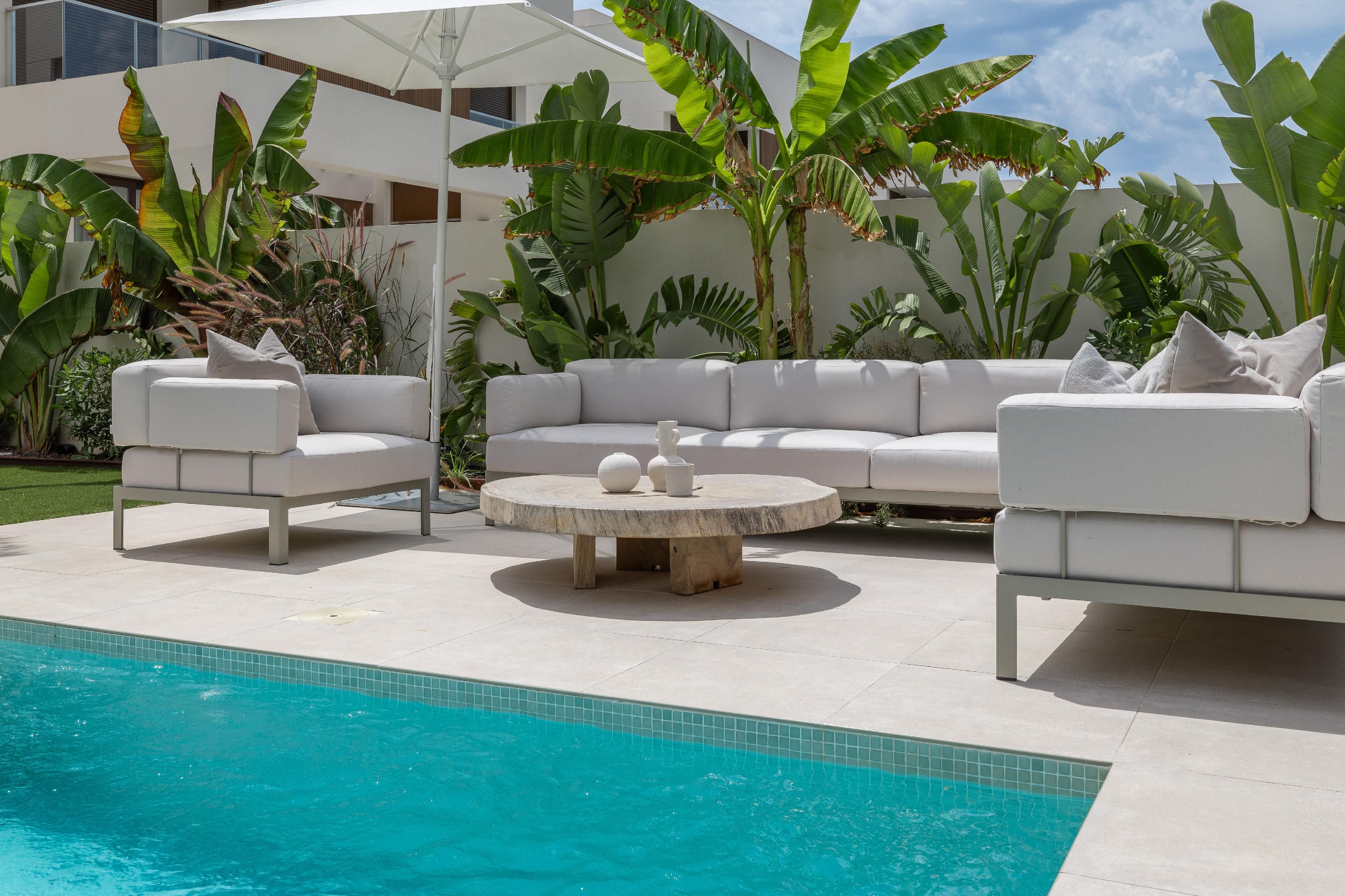 The home features four spacious bedrooms and three full bathrooms, including an elegant master suite with its own private bathroom. The bright and open-plan living and dining area offers direct access to the garden and pool—perfect for relaxing or entertaining guests.