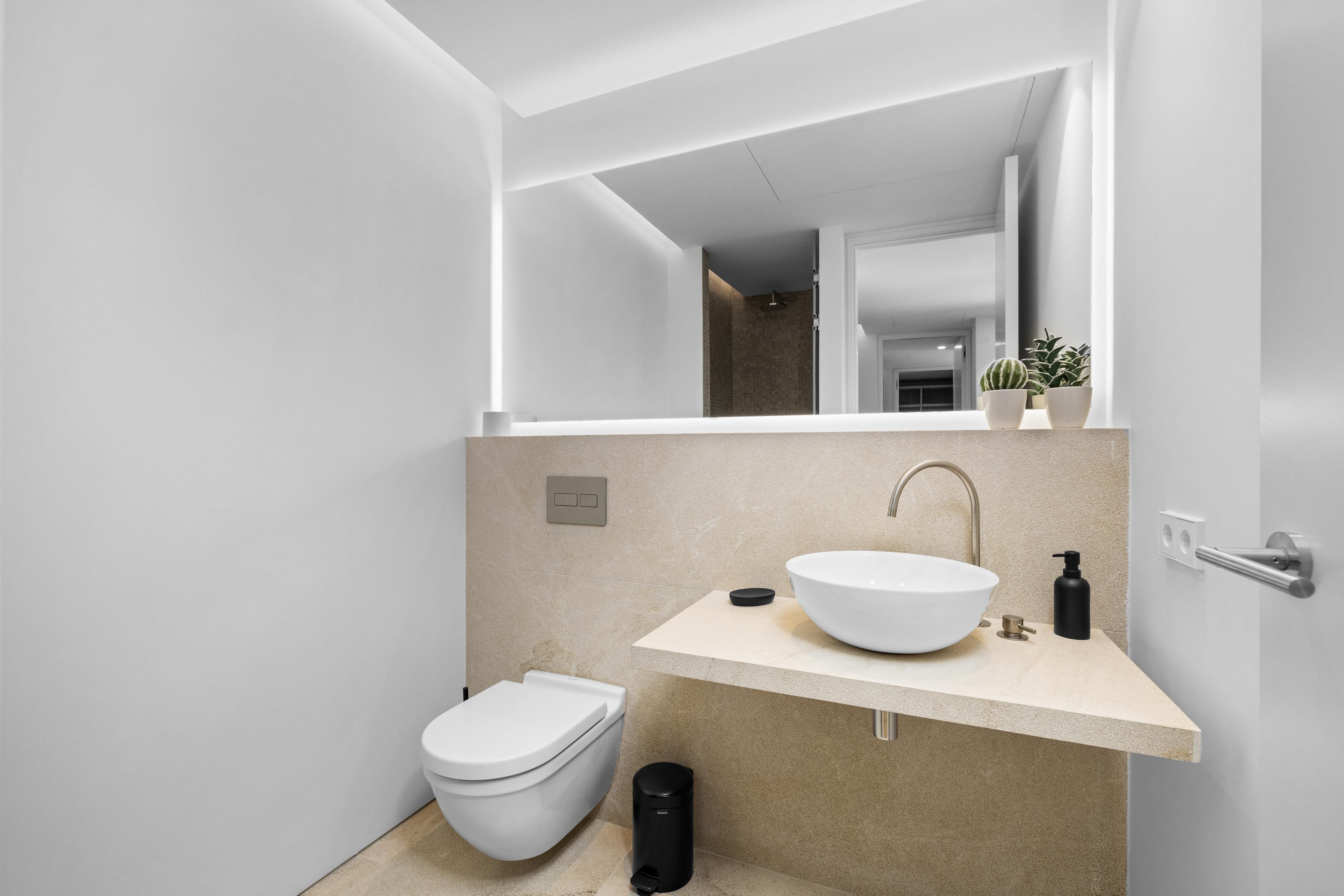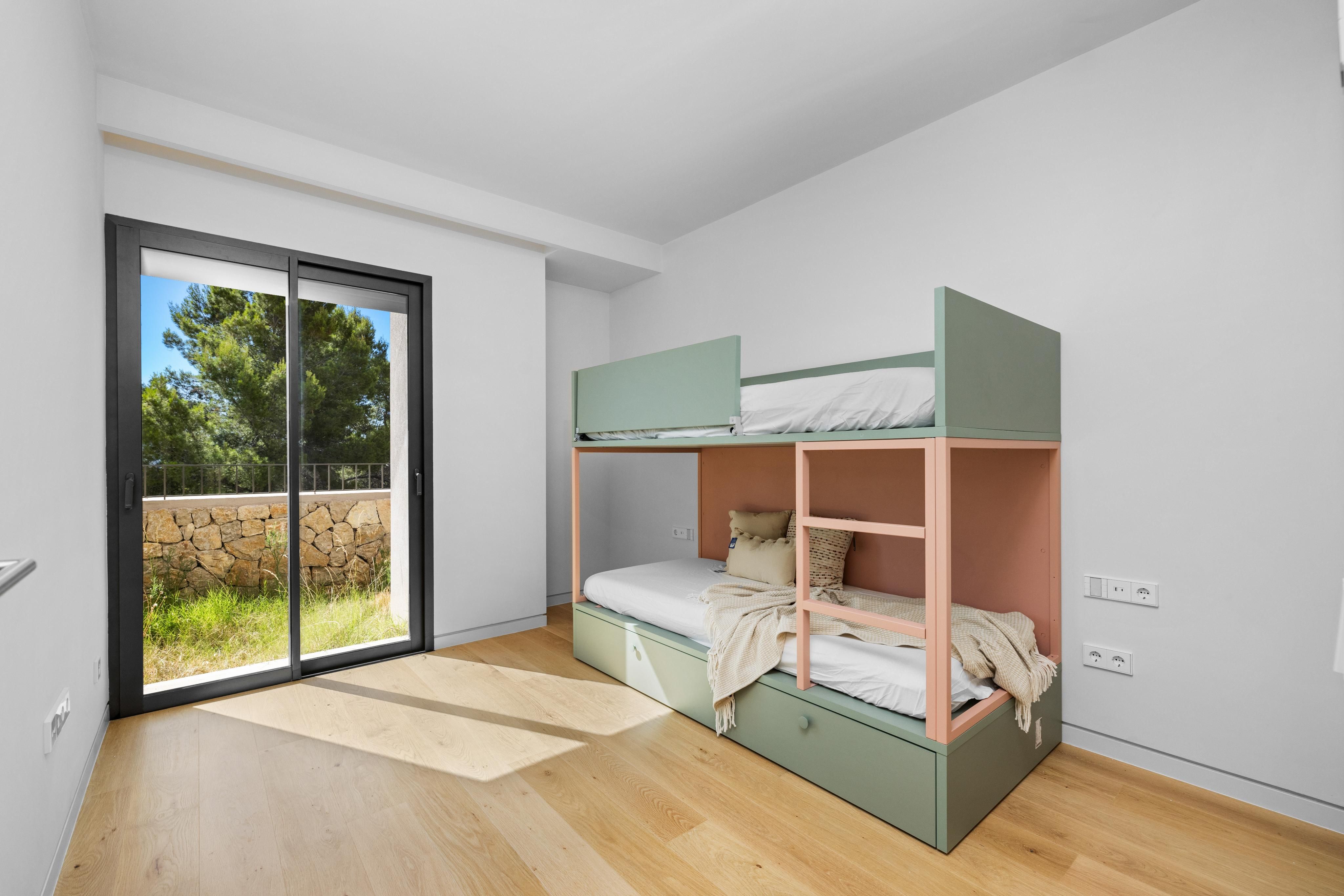 This exclusive designer residence combines Mediterranean luxury with state-of-the-art amenities and offers the highest level of comfort on several floors. On the upper floor, a spacious living and dining area with an open Poliform kitchen, stylish fireplace and panoramic views of the Tramuntana mountains invites you to linger. High-quality designer furniture, selected works of art and thoughtful details create a refined ambience. A guest WC completes the living area. On the ground floor there is a luxurious master bedroom with en-suite bathroom and dressing room, as well as two further spacious double bedrooms and an additional bathroom. Custom-made fitted wardrobes and stylish furnishings ensure comfort and elegance in all rooms. The roof terrace with private pool, high-quality outdoor kitchen and views over the harbour of Port Andratx is the perfect place to relax. In the basement, two utility rooms, a technical room and a large garage with direct access to the street offer practical functionality. The property is rounded off by Mediterranean gardens and a communal infinity pool.