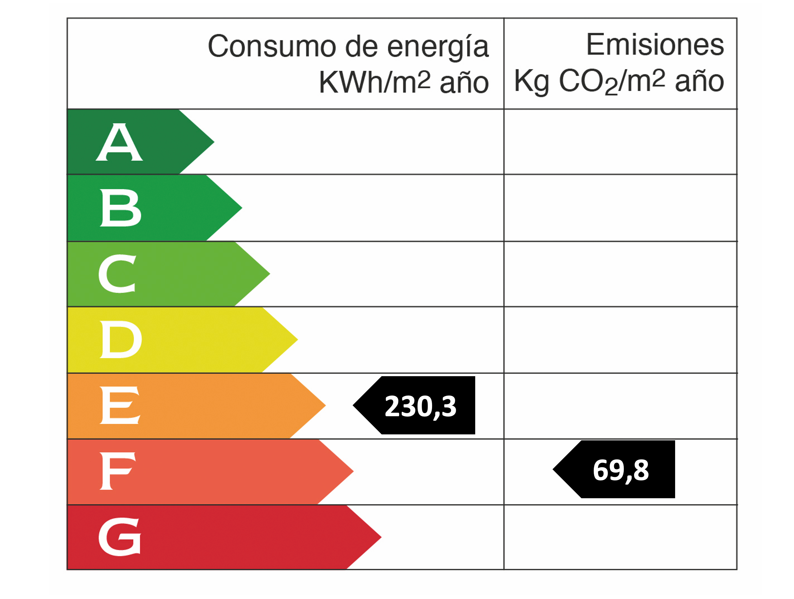 • Energy consumption value: 230.3 kWh/(m2*a) • CO2 emission: 69.8 kg/m2 • CO2 Emission Rating: F • Energy efficiency rating: E