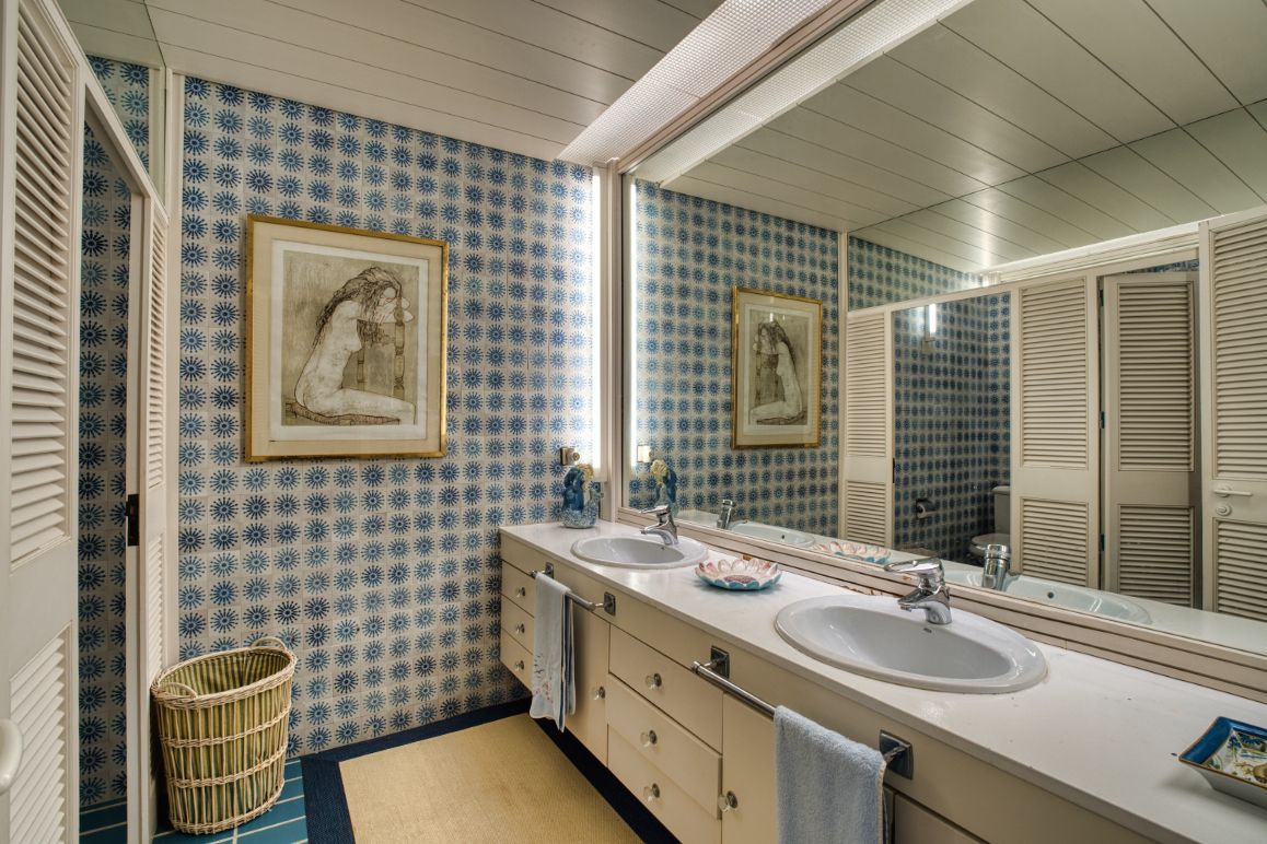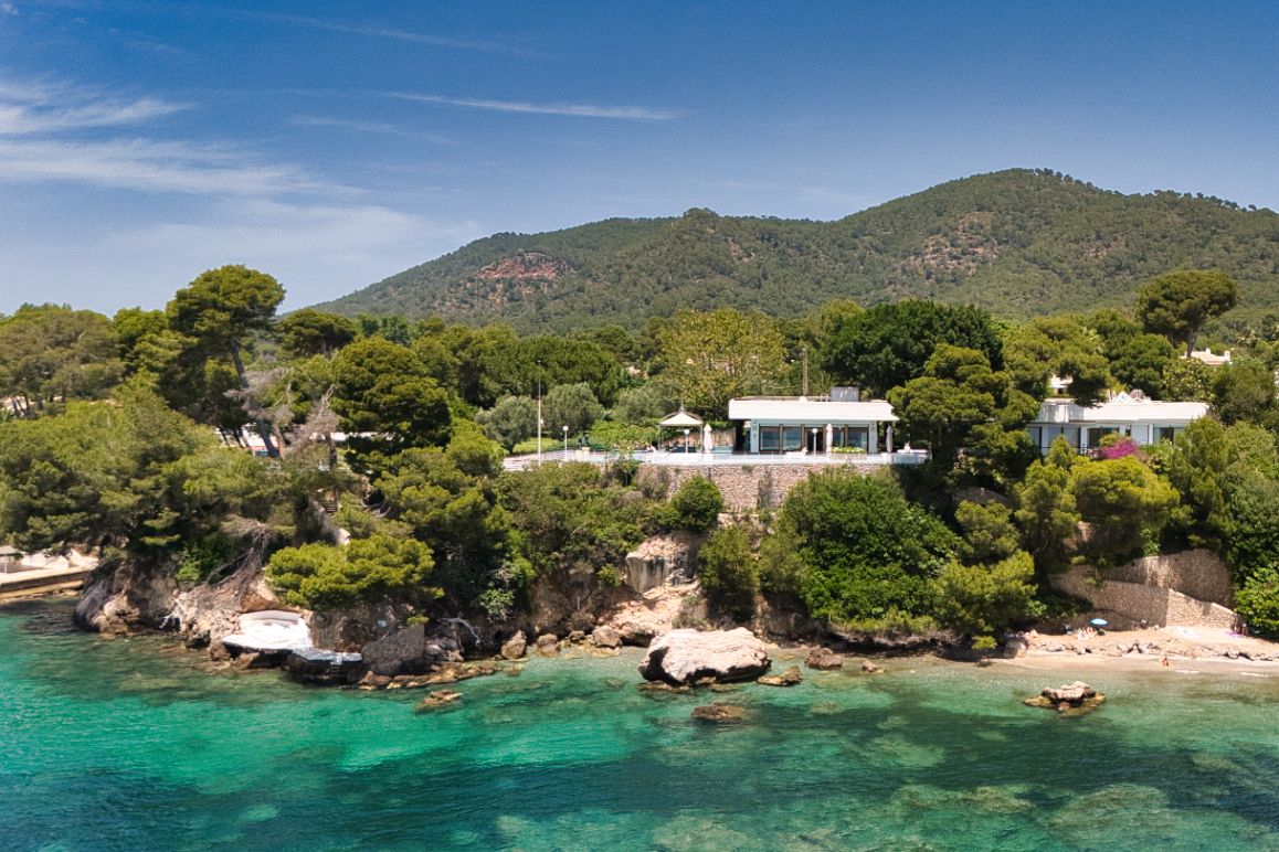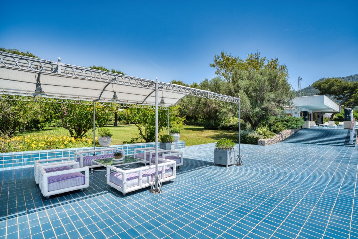 This unique villa property is situated on a plot of 6,012 m² in an absolutely privileged location on the seafront in the upmarket coastal resort of Costa de los Pinos in the north-east of Mallorca. The property with its simple Mediterranean design offers luxury, elegance and comfort. The living space of 993 m² extends over a single level and is distributed over nine bedrooms and ten bathrooms. The living area has a spacious living and dining room with terrace access. In the bedroom wing, which is accessed via a gallery, there are seven bedrooms with en suite bathrooms and a guest toilet. The service area includes the kitchen, an ironing/laundry room, pantry and a bedroom with bathroom for the staff. The highlight of the house are the outdoor areas with terrace, large pool and paved steps covering an area of 1,100 m². From here there are breathtaking views of the coast and the sea. There is also a dining area with a large marble table for twelve people, which is ideal for large outdoor dinners. The terraces provide access to both the beach and a bathing platform at sea level, which offers easy access to the sea and plenty of space for sun loungers. The house is surrounded by a beautifully landscaped garden with a fountain, pond and numerous Mediterranean plants and fruit trees. There is also an outdoor area for landing a helicopter as well as a padel and tennis court. The villa has a covered garage for three vehicles and an additional car park with a canopy. There is also a separate guest house with living room, kitchen, two bedrooms and two bathrooms. The property has its own well and a mooring at the small harbour of the urbanisation, which is only 150 m from the house. A unique villa in an absolutely privileged location.