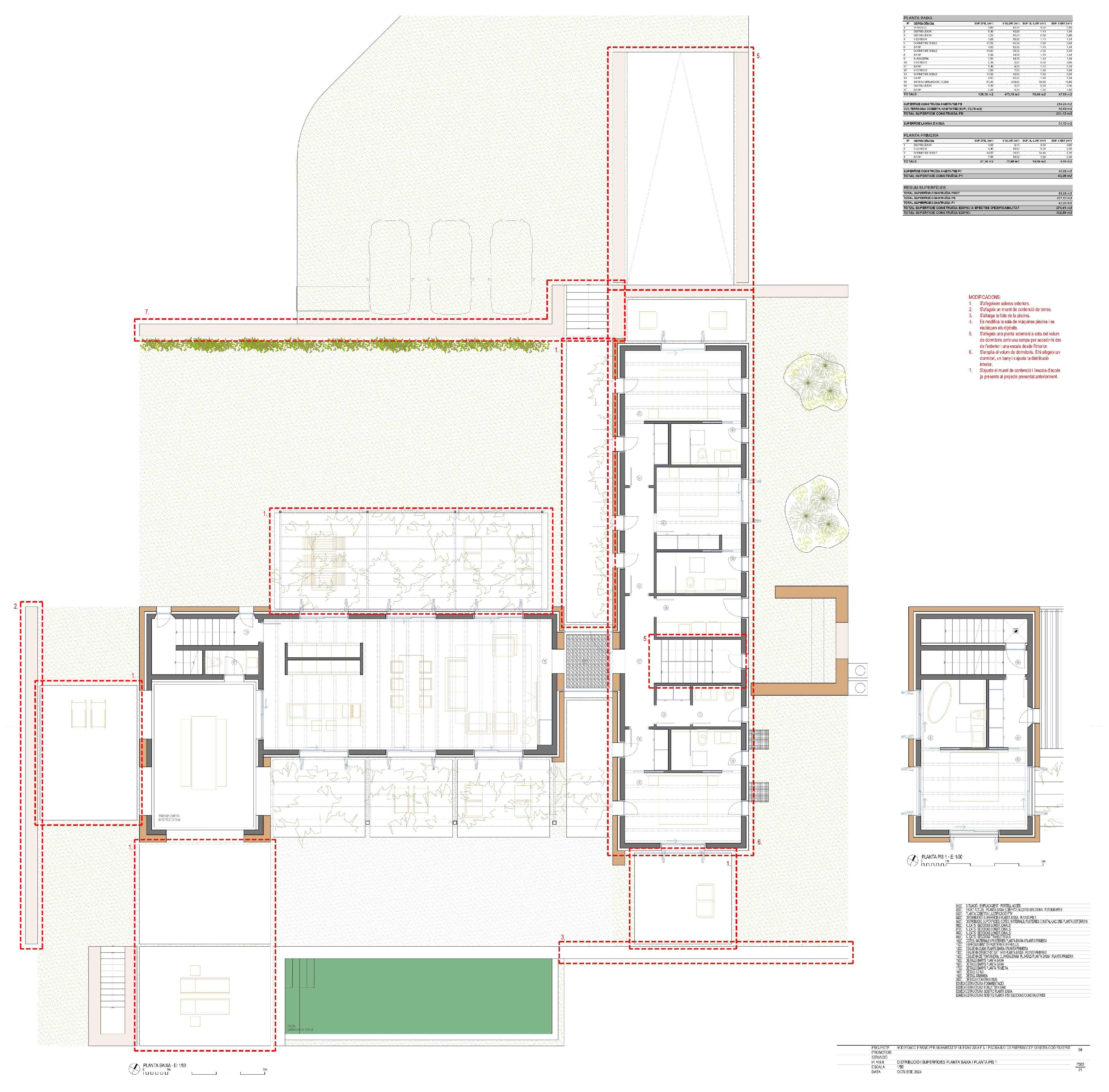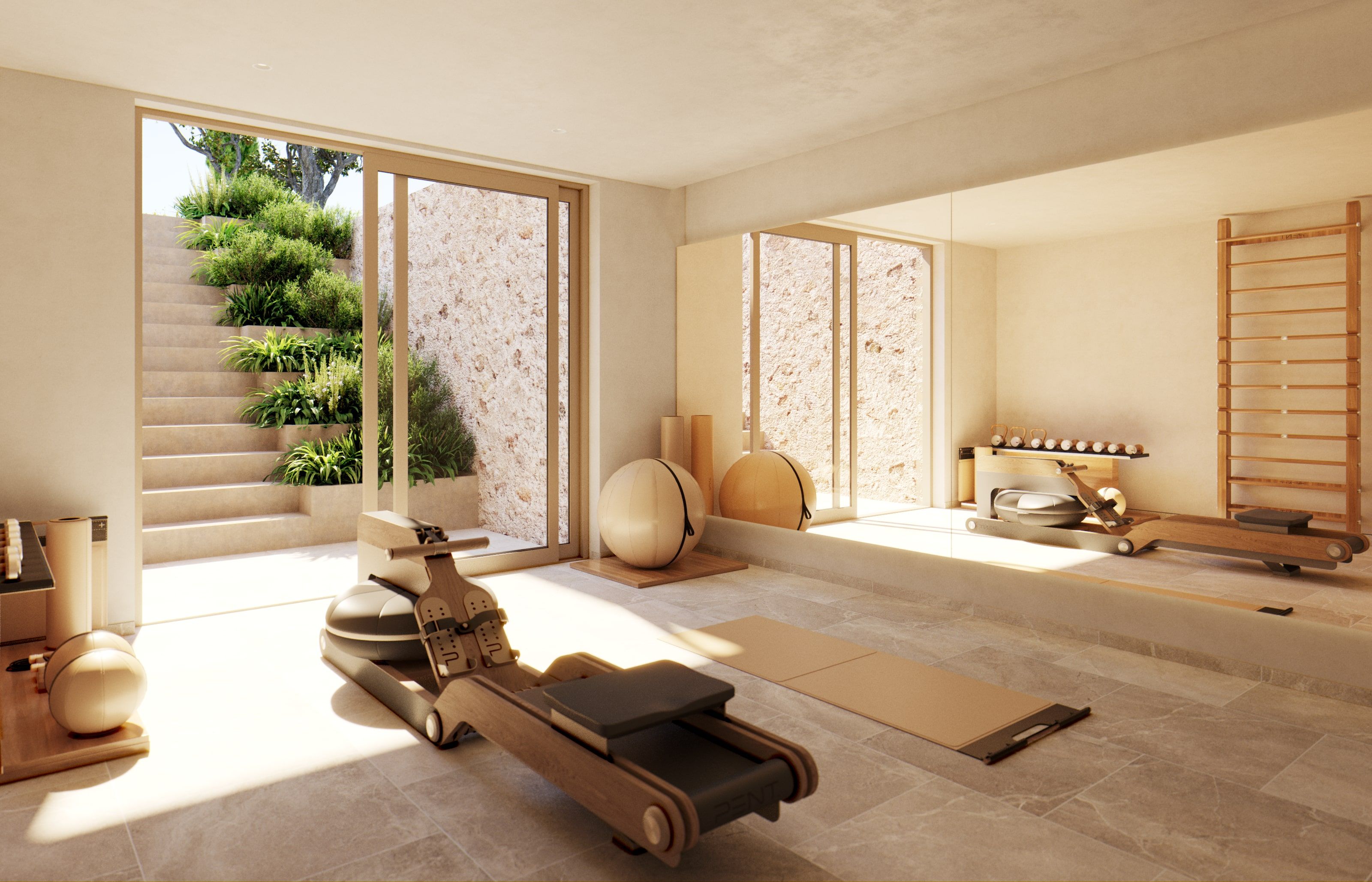 The property offers 359 sqm of living space distributed over two floors plus a spacious basement including a garage for two vehicles, a technical room and a gym with natural light thanks to an English courtyard with independent access to the garden. The east wing comprises three bedrooms with en-suite bathrooms, as well as two guest bathrooms, one indoors and one in the pool area. The finca features a large main kitchen with an auxiliary cocktail and wine storage area, a fully equipped outdoor kitchen, a utility room and a spacious living and dining area with fireplace. As part of the project’s refinement, the living area has been enlarged and the layout optimized, incorporating generous sofas, tables and armchairs oriented towards all focal points, including the fireplace. In addition, a new dining room of approximately 40 sqm has been created, featuring retractable window systems that allow it to be transformed into a covered porch, seamlessly enhancing the connection between indoor and outdoor living.
