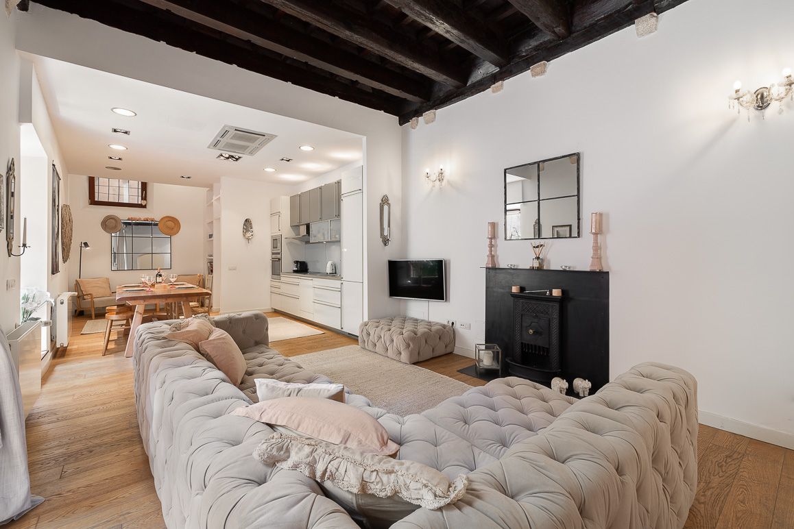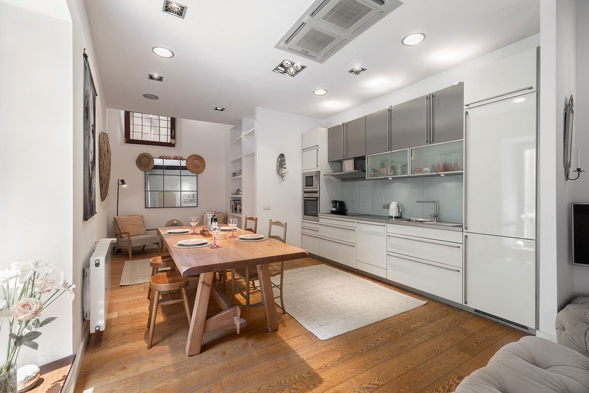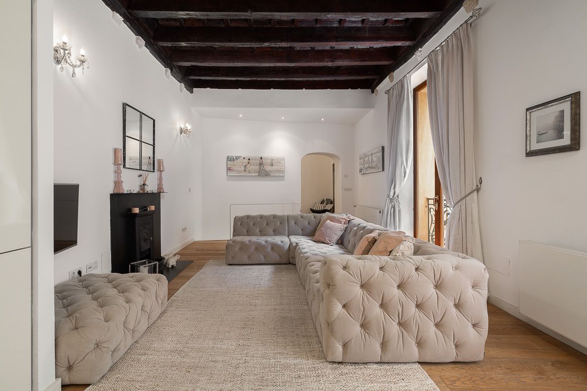 In a quiet side street near the cathedral, this charming duplex apartment awaits you, featuring a well-thought-out layout and lovingly crafted details. The property combines Mallorcan flair with practical living comfort and is situated in a sought-after residential area in the heart of the island's capital. Upon entering the apartment, you are welcomed by an entrance area that leads into the spacious, open-plan living and dining room with an integrated kitchen, notable for its inviting atmosphere and high ceilings. The modern kitchen is equipped with high-quality Siemens appliances and offers ample space for cooking and enjoying meals. A wood-burning fireplace creates a cozy ambiance. Also on this level are a bathroom and a storage/ laundry room. A staircase leads you to the lower floor, which houses two comfortable bedrooms and another bathroom. The bedrooms enchant with original vaulted ceilings, while the living room features traditional wooden ceiling beams. A second staircase leads further down to a versatile room that can be used flexibly, as well as another storage area that can also serve as a wine cellar. The apartment is equipped with gas central heating via radiators, split air conditioning units, and wooden floors, all of which contribute to the home’s warm and elegant character. The location, just a stone’s throw from the cathedral, is ideal: right in the vibrant centre of Palma with its charming alleyways, a wide range of shopping opportunities, cafés, restaurants, and cultural attractions. This duplex apartment is truly one of a kind – ideal for anyone who values urban living in the heart of Palma.