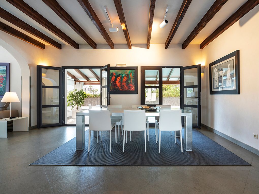 This beautiful villa is located in Bonanova, a quiet village on the outskirts of Palma, and has been partially renovated with high quality materials. From the living/dining room with wooden beams you access the large covered terrace with direct access to the garden and the pool. From the fully equipped kitchen with central cooking island, one has access to the rear patio and the spacious utility room, barbecue area and wine cellar. The house has three bedrooms, three bathrooms and a round room upstairs currently used as an office and has a large terrace with sea views. Pre-installation for air conditioning and central heating, double glazing, electric shutters and garage complete the offer.