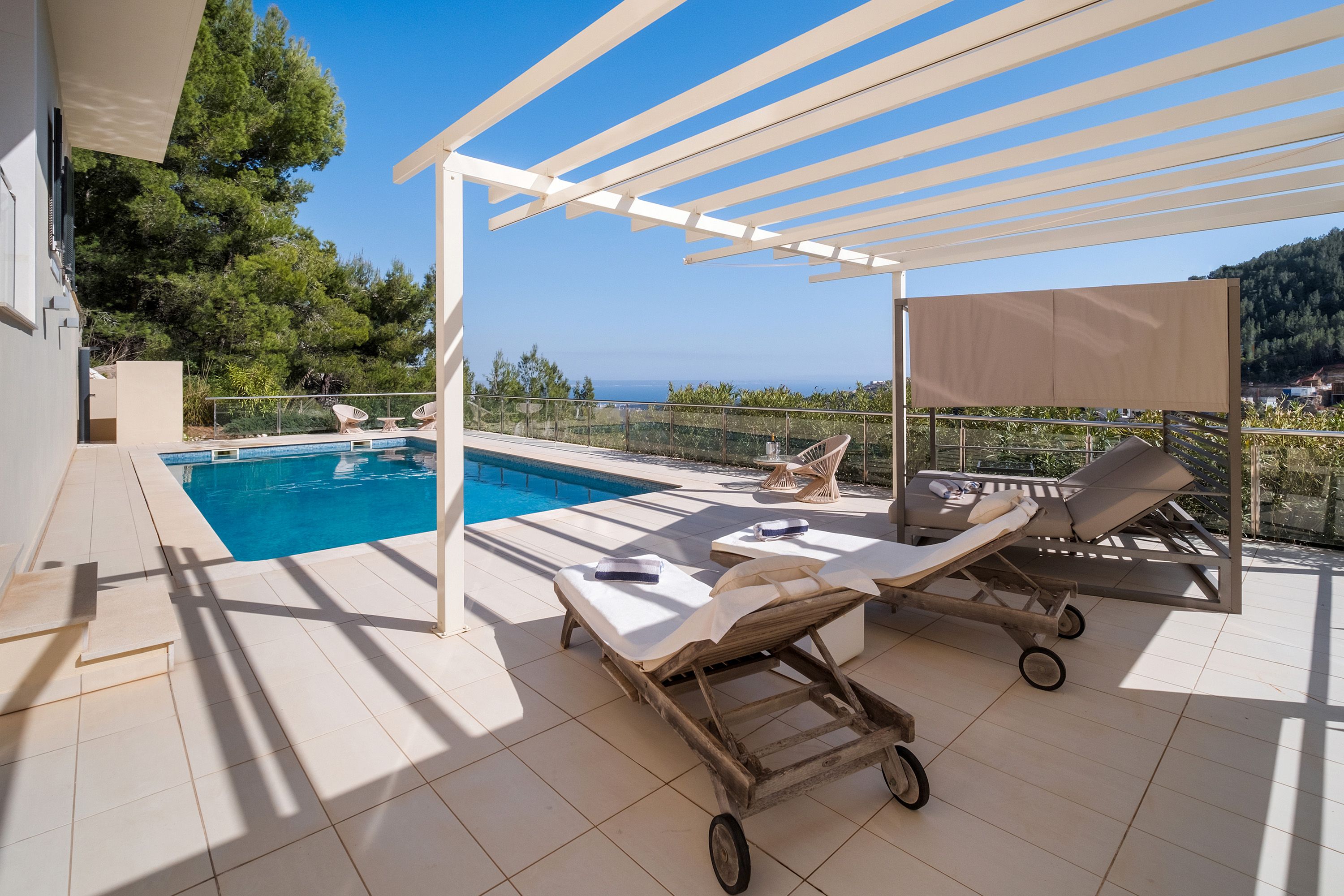 On the upper floor, there are three bedrooms, each with its own en-suite bathroom and walk-in closet, all with direct access to a generous terrace. The basement features a separate guest or staff apartment and a pool surrounded by expansive terraces and a pergola. Additionally, an adjoining room with a sauna and shower offers versatile potential, ideal for a wellness area, fitness room, or home cinema.