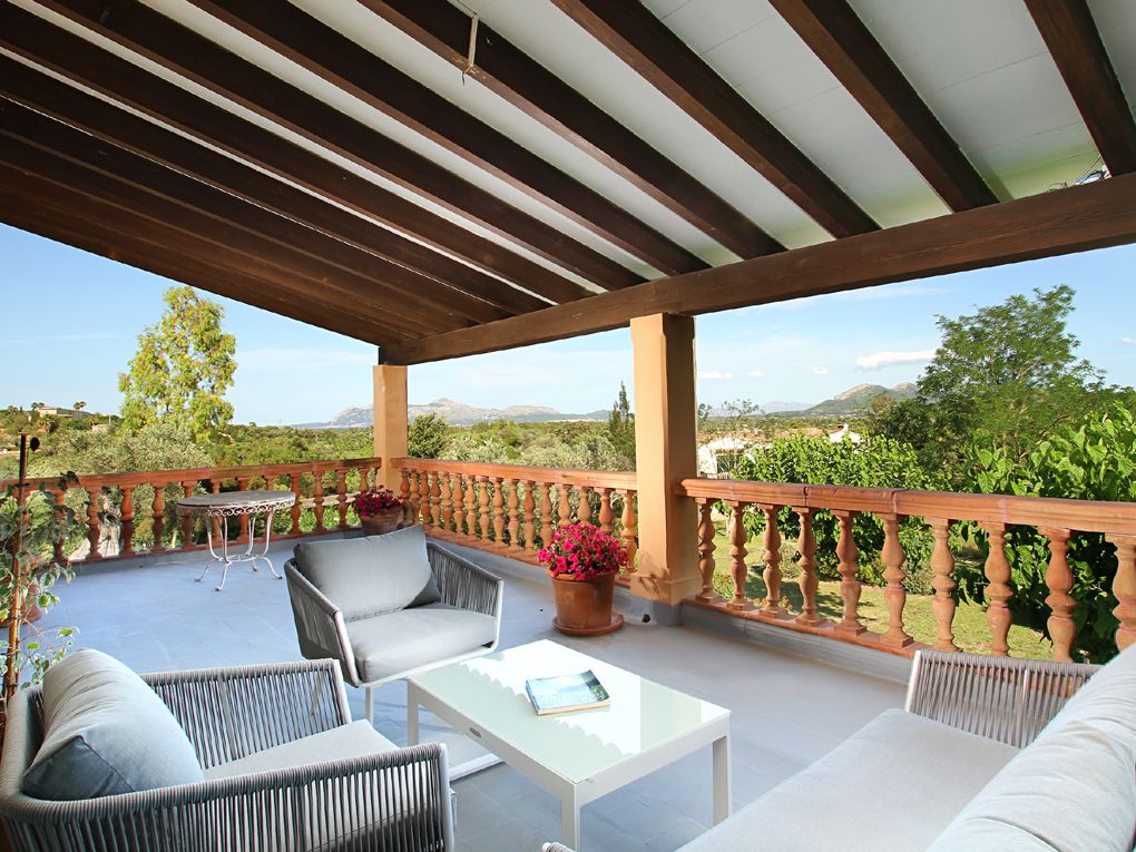 • Planta superior: sala con sofás, terraza cubierta con vistas a Pollença y Alcudia, 2 dormitorios dobles, baño en suite con bañera y ducha, y ducha independiente.