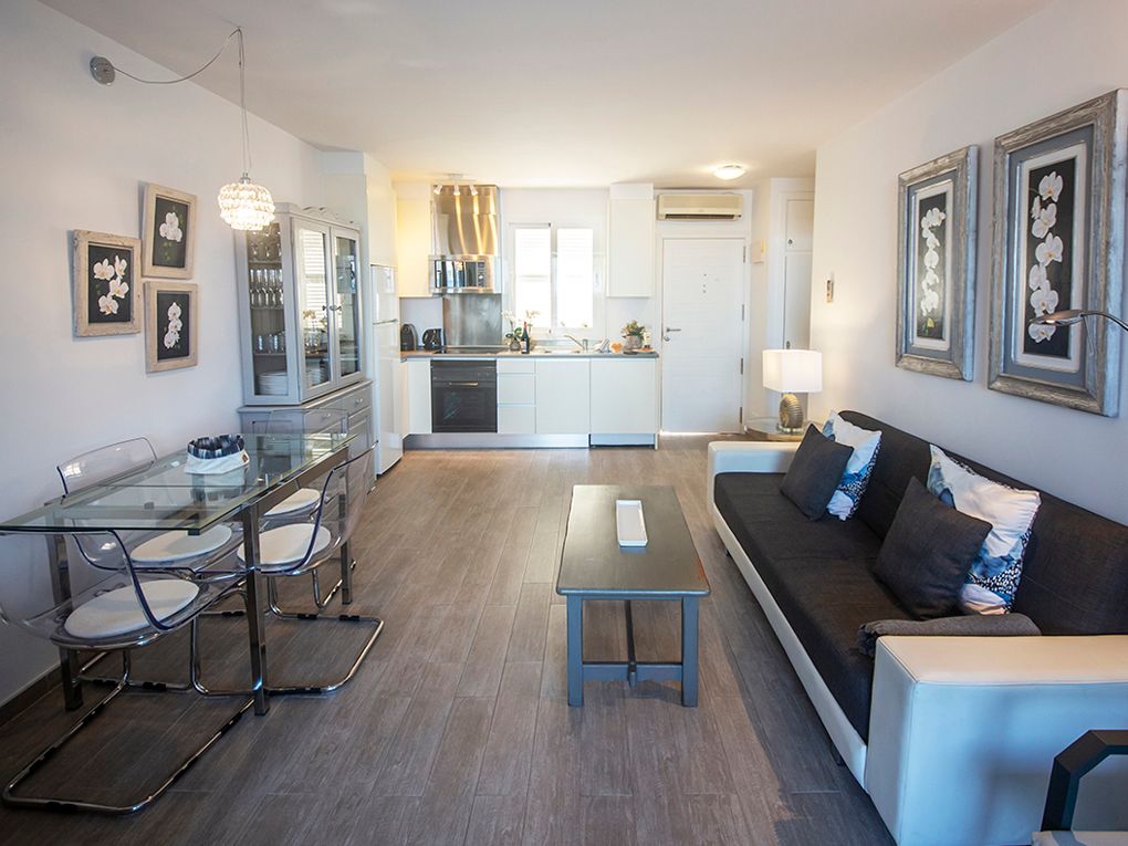 Salón-comedor con sofá cama y aire acondicionado, conectado directamente a la terraza.