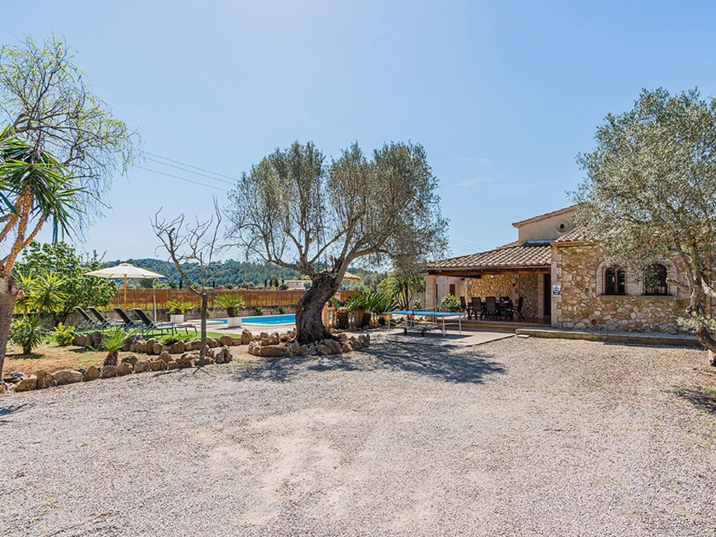 Construida en una sola planta, la villa presenta la típica fachada de piedra mallorquina, realzada por un porche frontal con vigas de madera vista que aportan calidez y autenticidad. Su diseño refleja la esencia del estilo rural mediterráneo, donde la sencillez se une al confort para crear un ambiente acogedor y funcional.