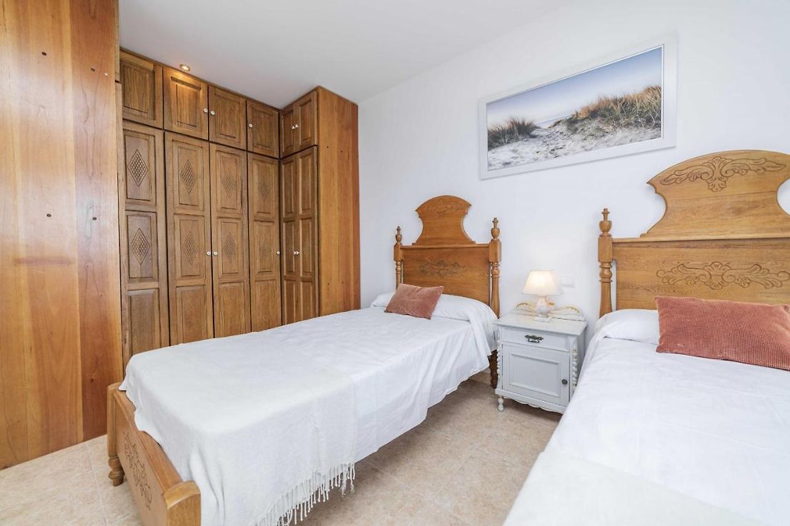 Planta superior: tres dormitorios con camas individuales y baño completo compartido, además de una agradable terraza con vistas.