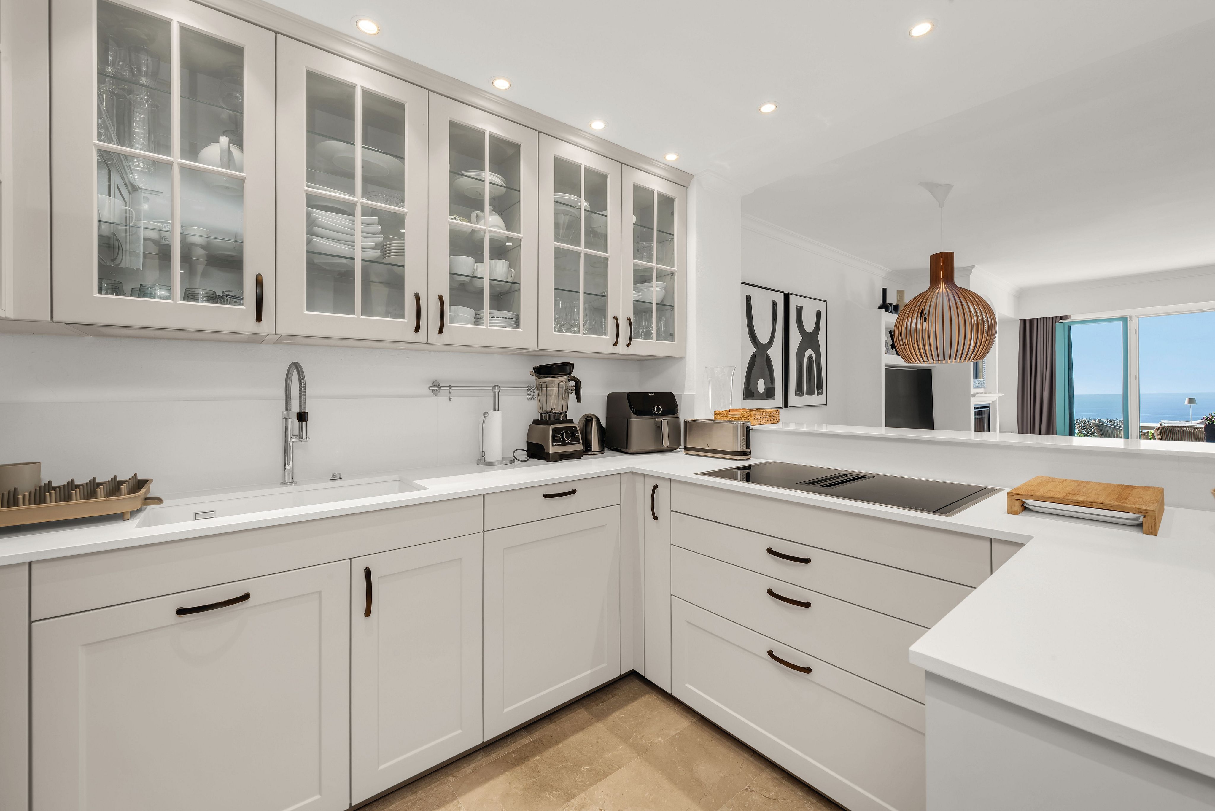 Este elegante apartamento con vistas al mar, completamente renovado, se encuentra en un complejo residencial cuidado y exclusivo en una ubicación elevada de Nova Santa Ponsa, y destaca por su orientación suroeste ideal, así como por sus impresionantes vistas panorámicas. Desde la amplia terraza se disfruta de una vista despejada sobre el puerto deportivo de Port Adriano hasta las conocidas islas Malgrats y el mar abierto, ofreciendo condiciones perfectas para atardeceres inolvidables. El apartamento ofrece una distribución bien pensada con dos dormitorios, dos modernos baños (uno en suite), un luminoso salón-comedor y una cocina abierta de alta calidad al estilo americano. La propiedad es ideal tanto como residencia vacacional como para vivienda habitual confortable. En el marco de una completa renovación en 2020, la vivienda fue modernizada con gran atención al detalle. La cocina abierta fue diseñada por la empresa STORK y equipada con electrodomésticos de NEFF. También se renovaron con altos estándares el lavadero, los baños con duchas a ras de suelo y el dormitorio principal con armarios empotrados a medida. La zona de estar destaca por una nueva chimenea y acceso directo a la terraza con toldos eléctricos. Para el máximo confort, la vivienda cuenta con calefacción por suelo radiante con termostatos digitales, aire acondicionado (frío/calor) y nuevas ventanas de seguridad con triple acristalamiento. También se renovaron completamente la instalación eléctrica y la puerta de entrada. Una plaza de garaje y un trastero con armarios a medida completan esta atractiva oferta. La amplia zona de piscina del lujoso complejo residencial, así como la proximidad a tres prestigiosos campos de golf y a los puertos deportivos, convierten esta propiedad en un refugio especial en Mallorca.