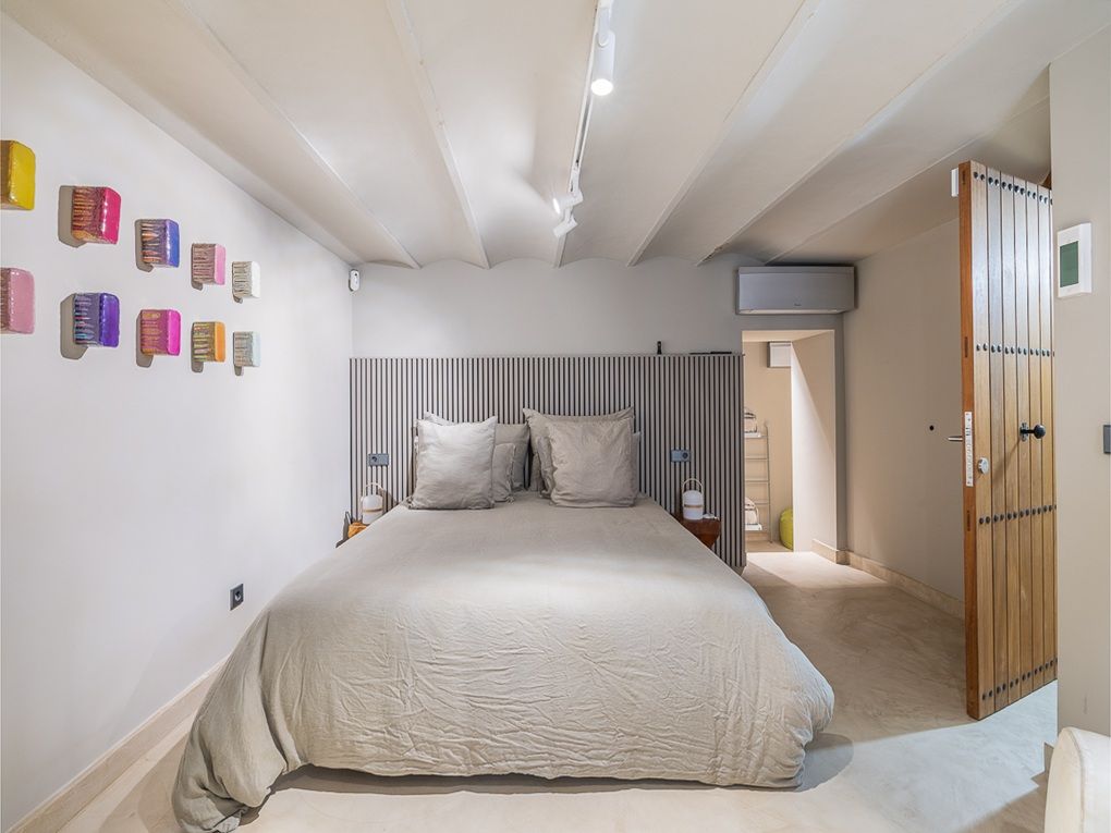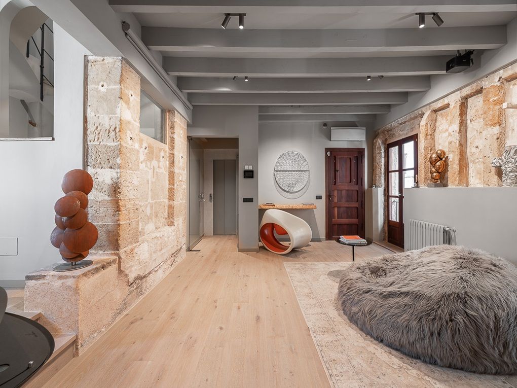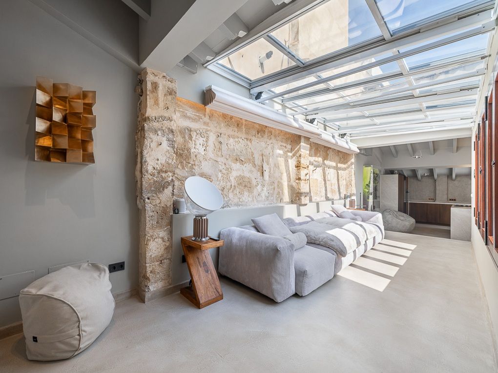Este elegante y excepcional apartamento se encuentra en el corazón del casco antiguo de Palma, en el barrio más prestigioso: La Calatrava. Su privilegiada ubicación le permite disfrutar de los lugares de interés turísticos y culturales y las posibilidades de compra cómodamente a pie. La propiedad destaca no solo por su distribución especial y sus estancias llenas de luz, sino sobre todo por sus dos impresionantes zonas exteriores. La terraza en la azotea ofrece privacidad y, con sus 84m2, espacio suficiente para aprovechar al máximo las horas de sol y por la noche disfrutar de alegres barbacoas con amigos o de cenas románticas a la luz de las velas. Es representativa la vista sobre los tejados del casco antiguo y sobre el vecino más cercano: la iglesia del Seminario, que crea un ambiente especial. La vivienda principal, a la que se accede sin esfuerzo en ascensor, se distribuye en un amplio salón con cocina abierta y acceso a la terraza de 16m2, una zona de sofás con techo de cristal, un espacioso dormitorio con un baño en-suite muy generoso, equipado con ducha y bañera, y un aseo de invitados. La terraza en la azotea se alcanza a través de la escalera, que termina en una pequeña habitación-torre. Aquí surgen pensamientos de Rapunzel, pues con la vista al mar que se ofrece desde allí uno realmente se siente como en un cuento. Para un ambiente acogedor en los meses fríos, la chimenea, la calefacción de gas y la calefacción por suelo radiante (dormitorio principal y baño, lounge en la entrada, zona de cocina-comedor) aportan confort. Además, pertenecen al apartamento una bodega de vinos con bóvedas originales y un espacio de comedor para catas, una sala de fitness con equipos de diseño, así como un apartamento de invitados independiente con dos dormitorios y baño en-suite. Una propiedad excepcional en la mejor ubicación del casco antiguo.