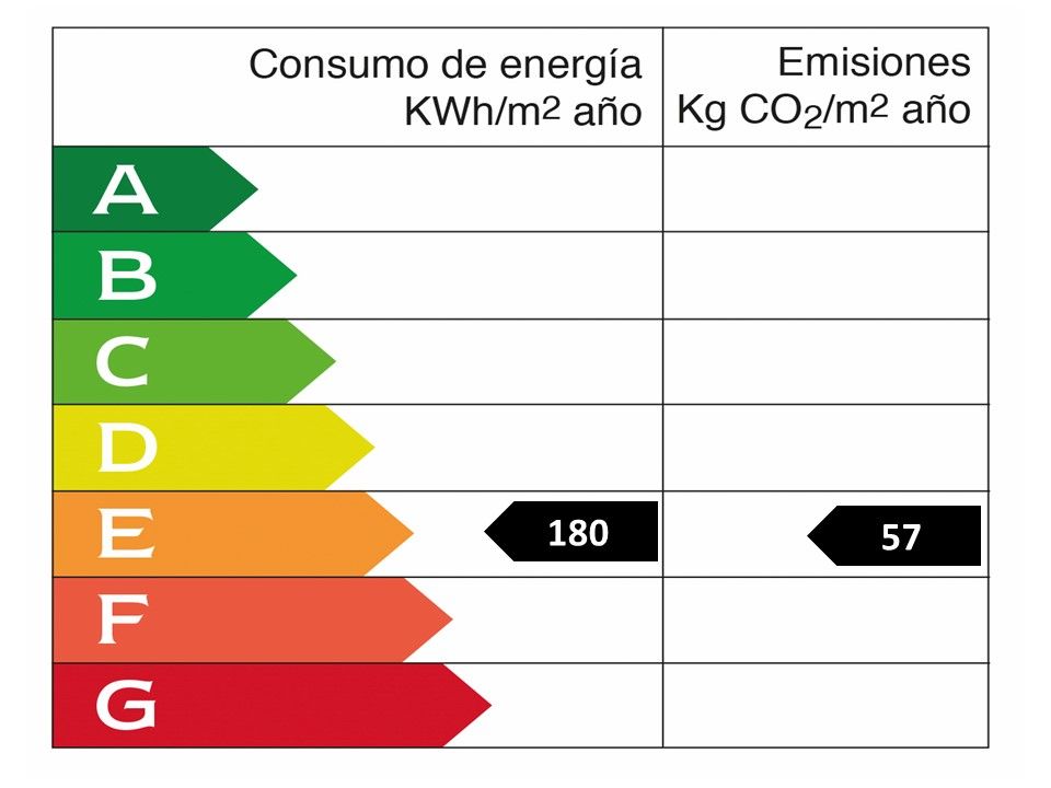 Año de construcción: 1996 • Valor de consumo energético: 180.0 kWh/(m2*a) • Emisiones CO2: 57.0 kg/m2 • Escala de Emisiones de CO2: E • Clase de eficiencia energética: E