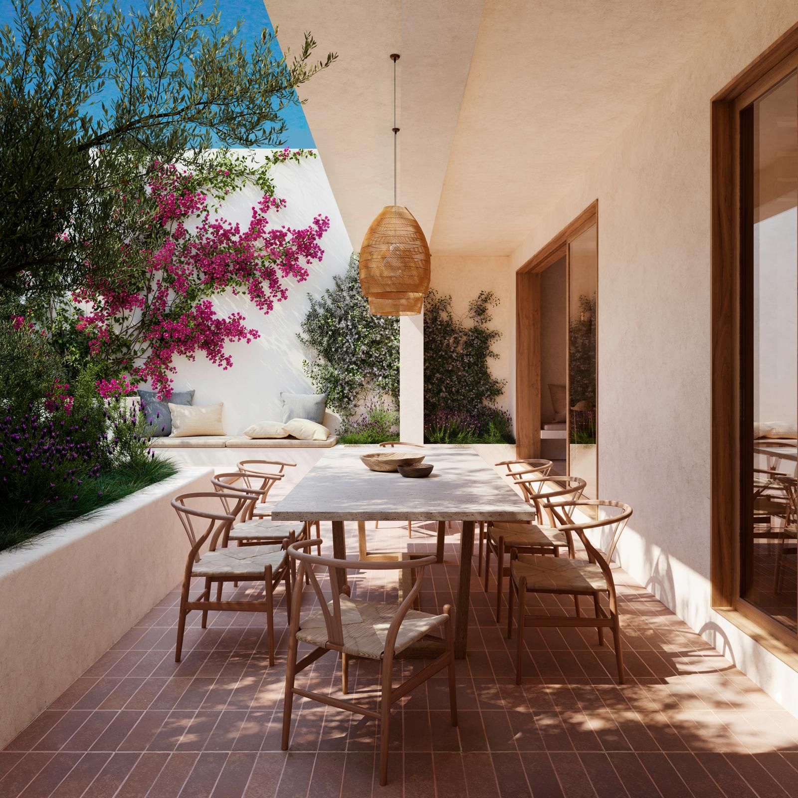 El corazón de la propiedad es el patio interior privado con piscina: un elegante oasis de tranquilidad con paisajismo mediterráneo, zonas de sombra y amplias áreas de descanso. Aquí, vivir, relajarse y disfrutar se integran de forma natural: un refugio ideal bajo el sol mallorquín.