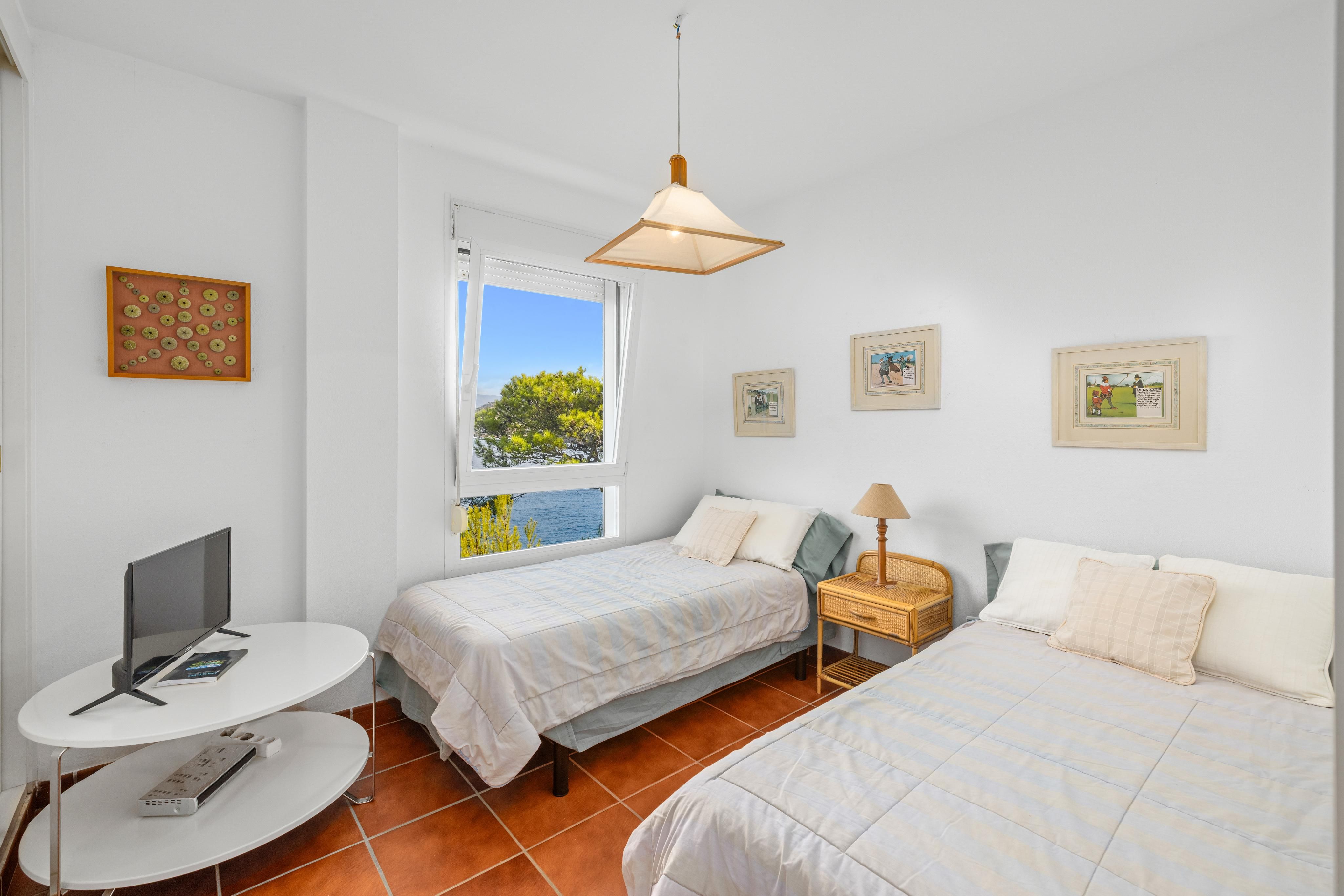 En la planta superior le esperan un acogedor dormitorio, un cuarto de baño, un aseo para invitados, una cocina totalmente equipada y una sala de estar abierta con vistas al mar. La planta baja cuenta con cuatro dormitorios más, dos cuartos de baño y un aseo adicional para invitados, ideal para familiares y amigos. Todas las habitaciones tienen vistas directas al mar.