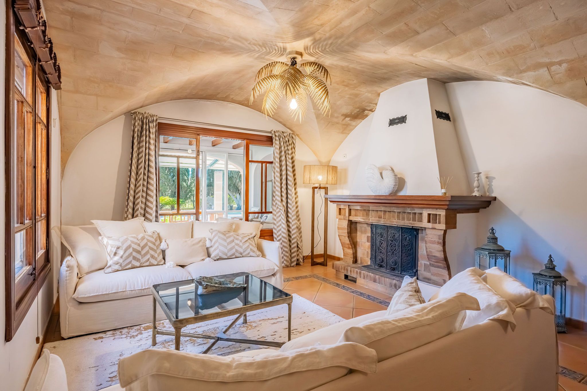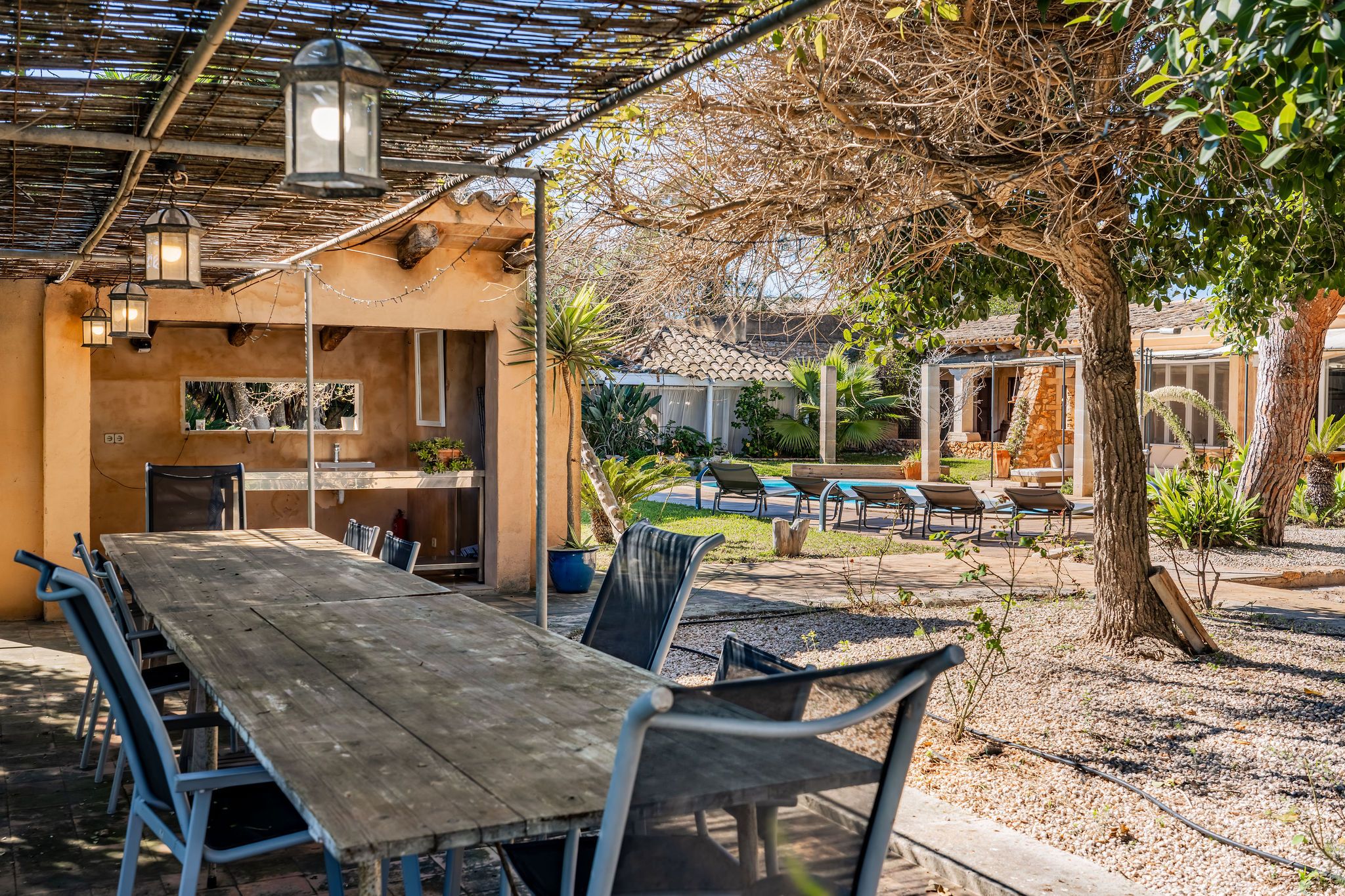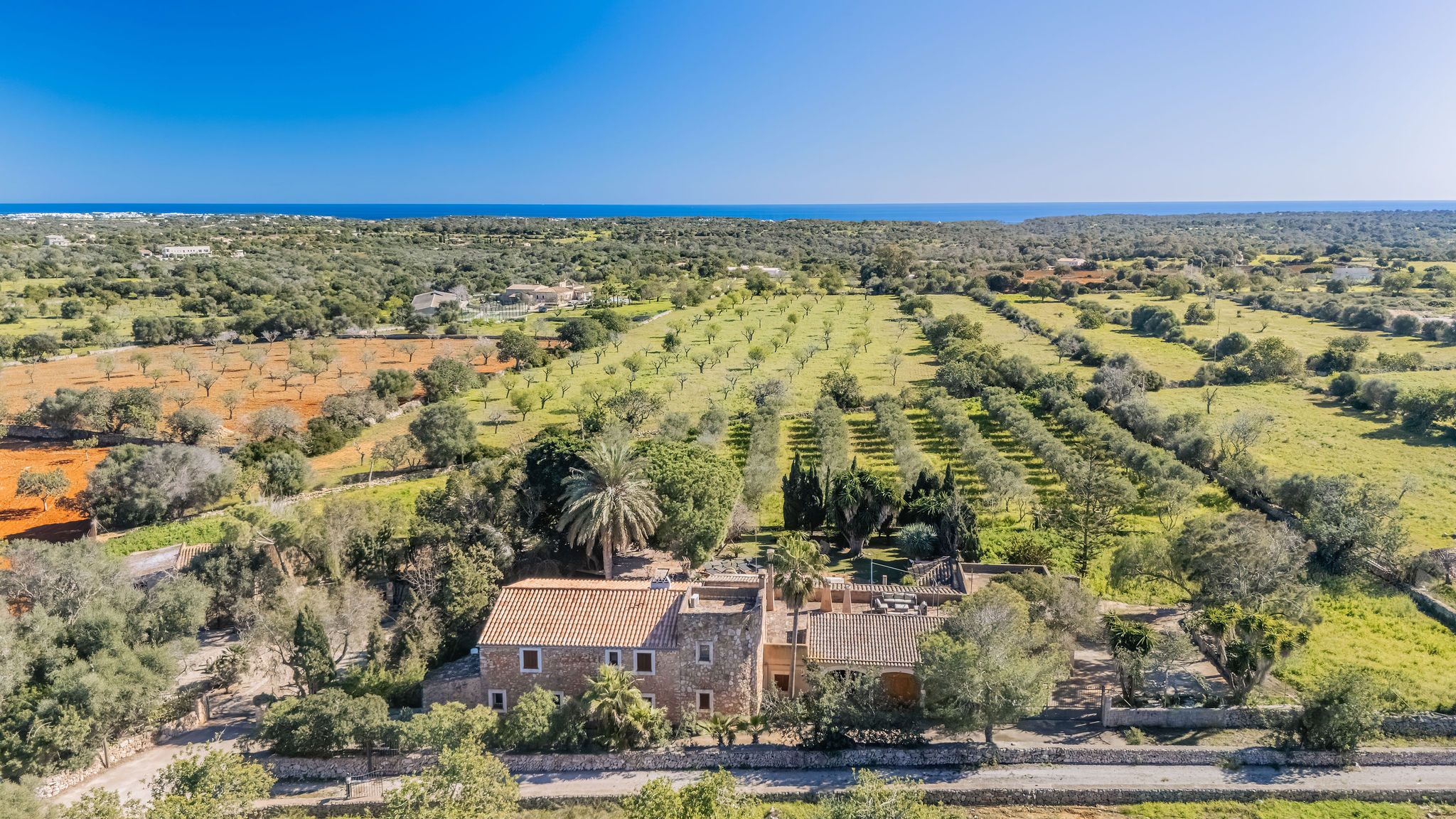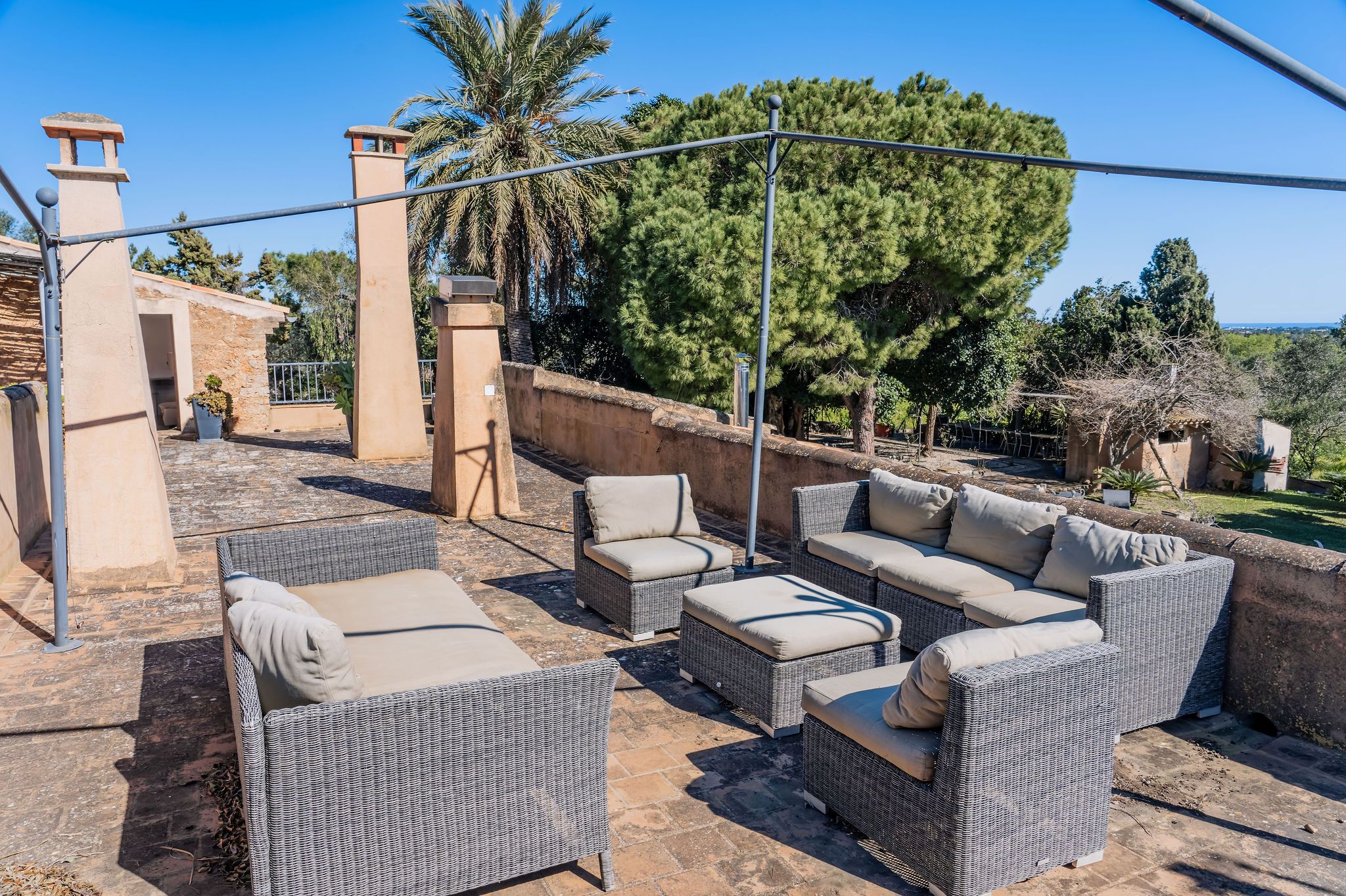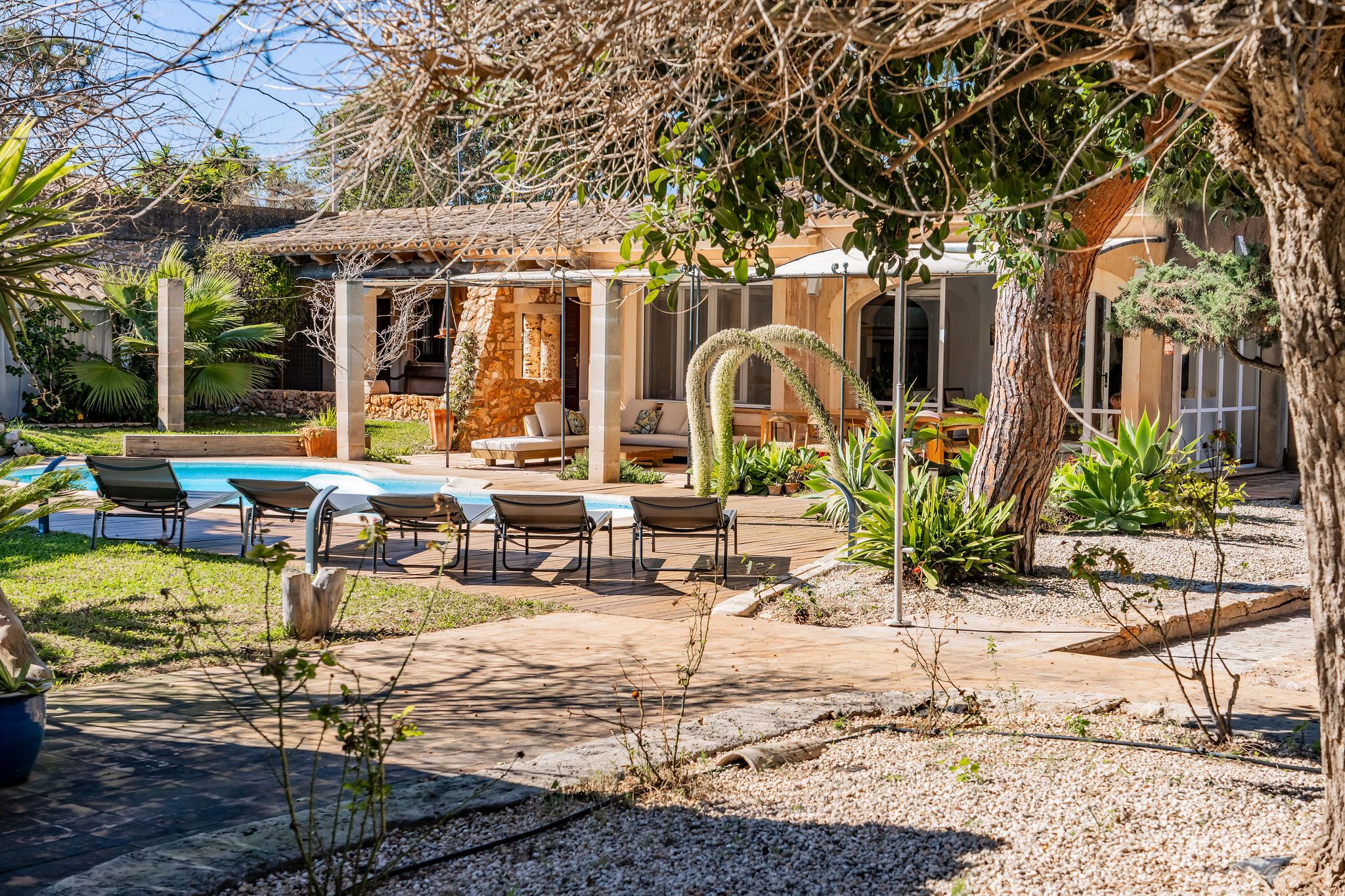 Esta casa de campo, construida en 1956, se encuentra en una ubicación idílica sobre una parcela de casi 9.000 m², a pocos minutos de Alqueria Blanca. Está rodeada de un hermoso entorno natural con bosques de pinos y agradables caminos para pasear, muy cerca del Parque Natural de Mondragó y de hermosas calas como la playa de S’Amarador. La casa, con su típica fachada de piedra, conserva el auténtico encanto de la arquitectura mallorquina. En el interior destacan arcos redondeados, colores mediterráneos y grandes ventanales hasta el suelo, que aportan mucha luz natural y crean una agradable conexión entre el interior y el exterior. La cocina, de estilo minimalista y tradicional a la vez, se integra perfectamente en la vivienda y ofrece bonitas vistas al jardín. El salón con chimenea crea un ambiente cálido y acogedor. Uno de los espacios más especiales es el jardín de invierno, que funciona como una zona adicional de estar. Gracias a sus grandes ventanales es un espacio muy luminoso, con bonitas vistas al jardín y a la piscina. Además, cuenta con una estufa de leña, que aporta un ambiente muy agradable en los meses más frescos. La propiedad dispone de 6 dormitorios y 5 baños, por lo que ofrece espacio suficiente para familia e invitados. Varias estancias cuentan con aire acondicionado tipo split, y la vivienda también dispone de radiadores, lo que garantiza confort durante todo el año. El exterior ofrece un amplio jardín mediterráneo con piscina, rodeado de vegetación y diferentes zonas para sentarse. Tanto en el jardín como en la casa se encuentran varios rincones tranquilos y acogedores, perfectos para relajarse y disfrutar de la calma del entorno. Las mascotas podrán ser consideradas previa consulta.