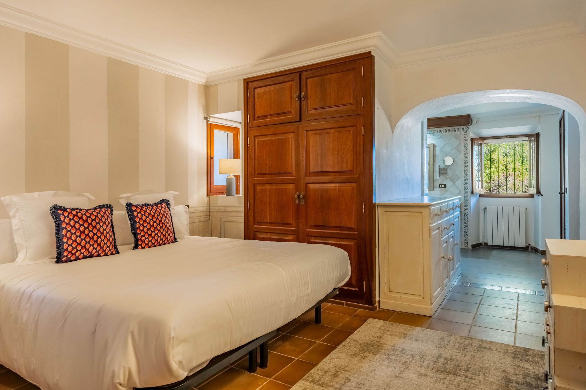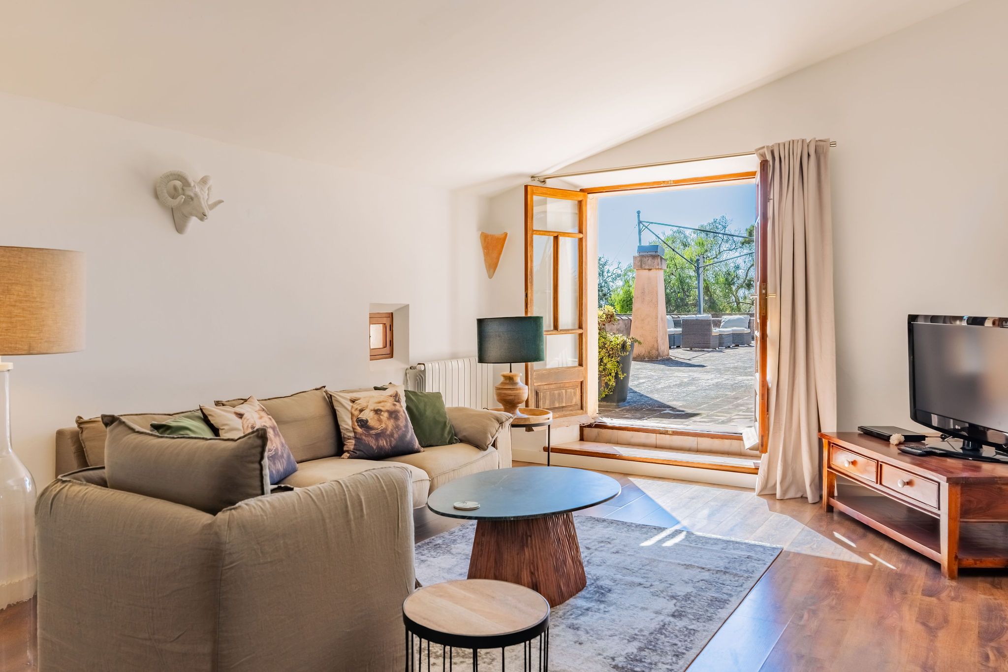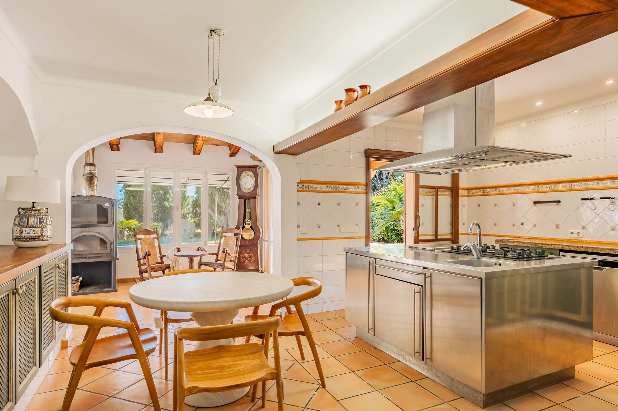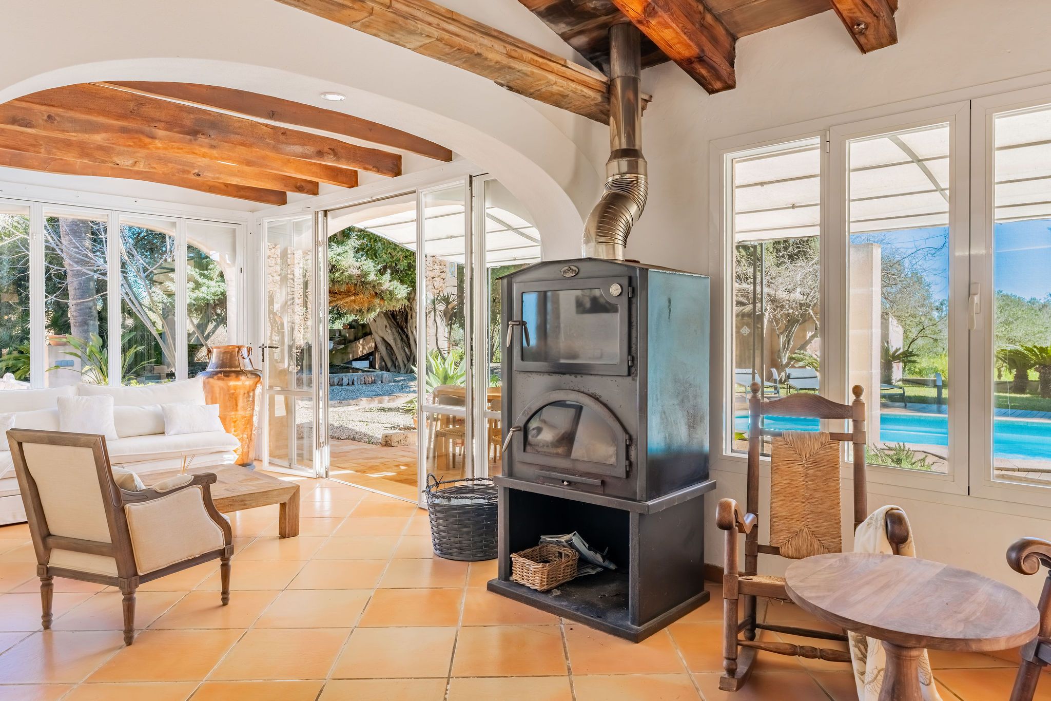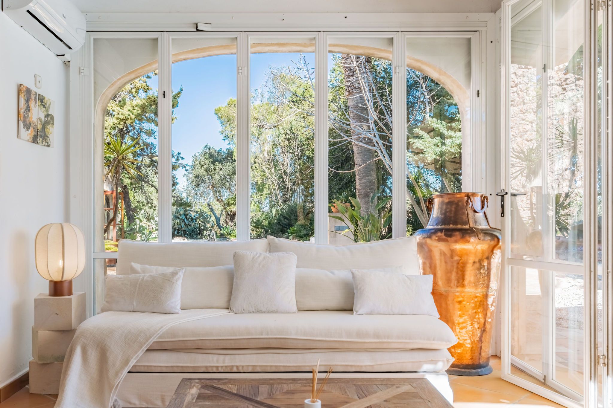 Esta casa de campo, construida en 1956, se encuentra en una ubicación idílica sobre una parcela de casi 9.000 m², a pocos minutos de Alqueria Blanca. Está rodeada de un hermoso entorno natural con bosques de pinos y agradables caminos para pasear, muy cerca del Parque Natural de Mondragó y de hermosas calas como la playa de S’Amarador. La casa, con su típica fachada de piedra, conserva el auténtico encanto de la arquitectura mallorquina. En el interior destacan arcos redondeados, colores mediterráneos y grandes ventanales hasta el suelo, que aportan mucha luz natural y crean una agradable conexión entre el interior y el exterior. La cocina, de estilo minimalista y tradicional a la vez, se integra perfectamente en la vivienda y ofrece bonitas vistas al jardín. El salón con chimenea crea un ambiente cálido y acogedor. Uno de los espacios más especiales es el jardín de invierno, que funciona como una zona adicional de estar. Gracias a sus grandes ventanales es un espacio muy luminoso, con bonitas vistas al jardín y a la piscina. Además, cuenta con una estufa de leña, que aporta un ambiente muy agradable en los meses más frescos. La propiedad dispone de 6 dormitorios y 5 baños, por lo que ofrece espacio suficiente para familia e invitados. Varias estancias cuentan con aire acondicionado tipo split, y la vivienda también dispone de radiadores, lo que garantiza confort durante todo el año. El exterior ofrece un amplio jardín mediterráneo con piscina, rodeado de vegetación y diferentes zonas para sentarse. Tanto en el jardín como en la casa se encuentran varios rincones tranquilos y acogedores, perfectos para relajarse y disfrutar de la calma del entorno. Las mascotas podrán ser consideradas previa consulta.