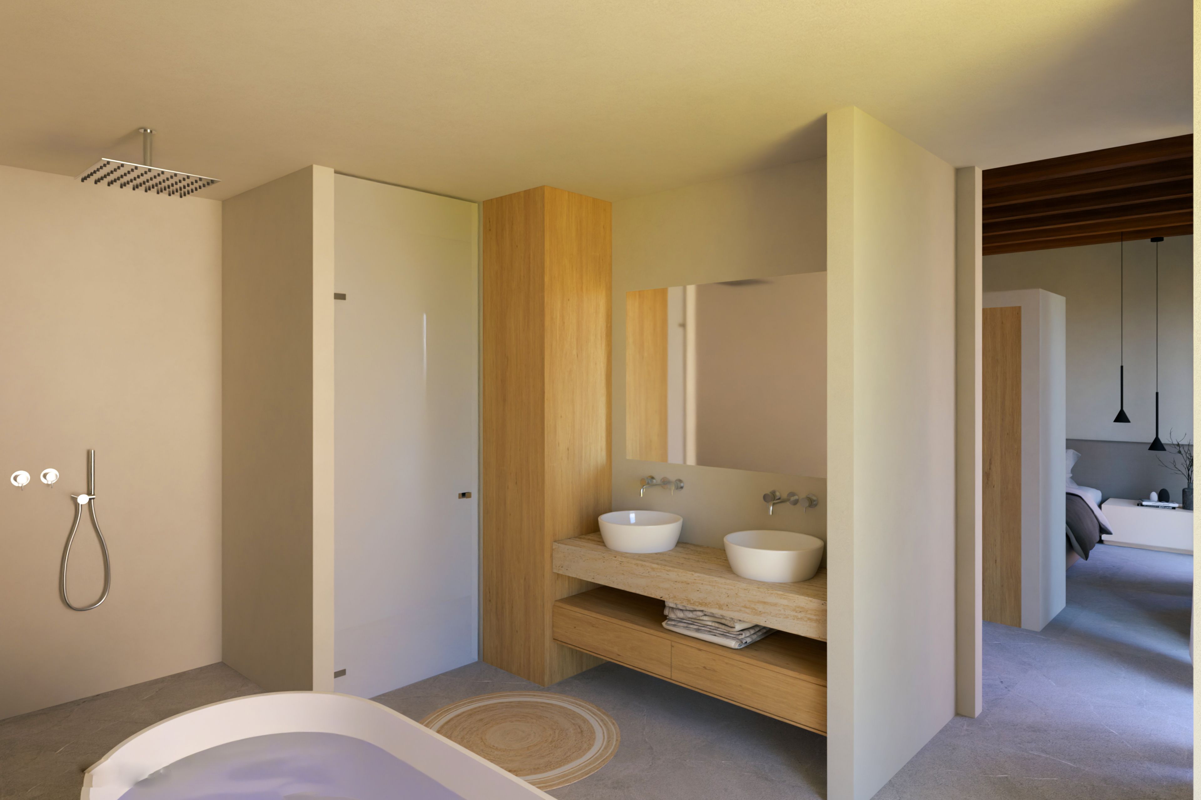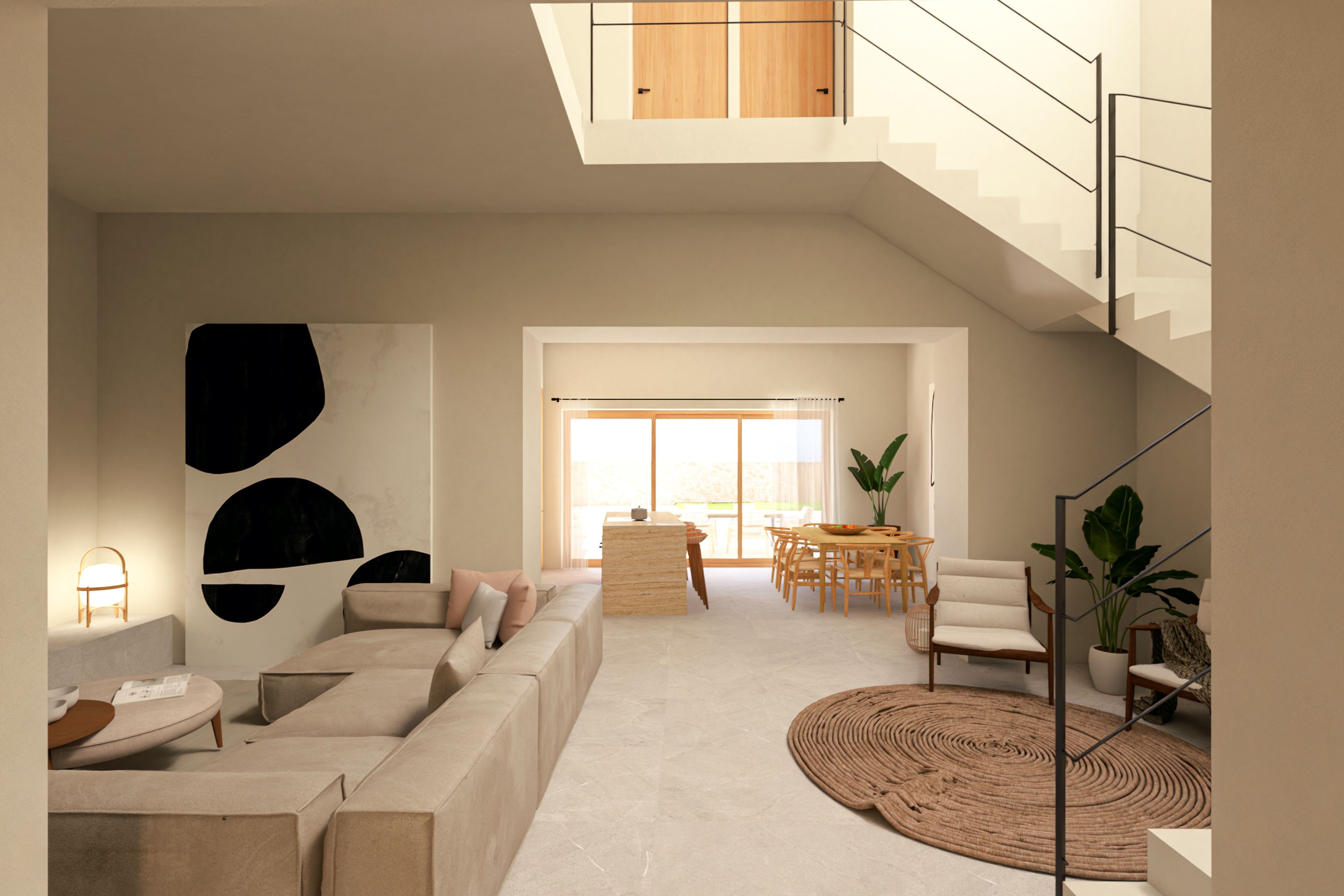 La planta superior ofrece espacios adicionales de libre configuración, ya sea como estudio, taller o superficie habitable extra. Desde la azotea se puede disfrutar de unas magníficas vistas a las impresionantes montañas gemelas de Alaró, un verdadero punto destacado de esta propiedad.