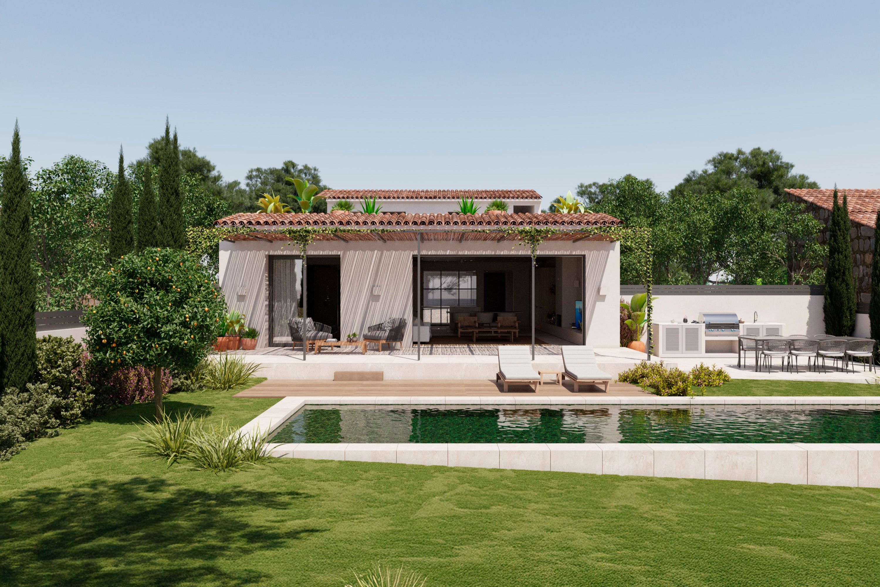Un nuevo proyecto que comenzará a construirse en septiembre, donde se combina un estilo tradicional con un diseño moderno. Esta encantadora casa de pueblo ofrece una superficie construida de 278 m2 con un bonito jardín y piscina y una terraza en la primera planta de 100 m2 con vistas panorámicas. A la casa se accede a través de un vestíbulo de entrada y continúa por el bonito patio interior a la cocina abierta, salón y comedor que accede directamente a la terraza y el jardín. Junto al salón se encuentra el dormitorio principal con baño en suite y un aseo independiente. La planta superior ofrece otros dos dormitorios y dos baños y una magnífica terraza. Además, la propiedad cuenta con un garaje doble, calefacción por suelo radiante y aire acondicionado centralizado por bomba de calor y suelos de piedra y roble. La finalización está prevista para la primavera de 2025.
