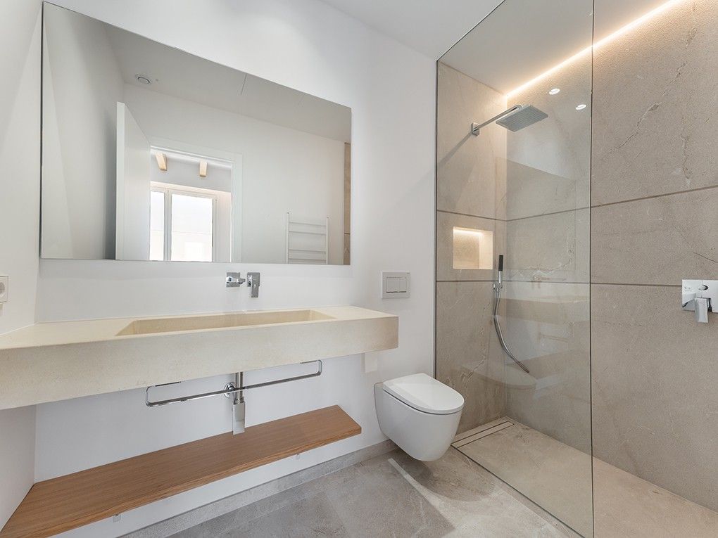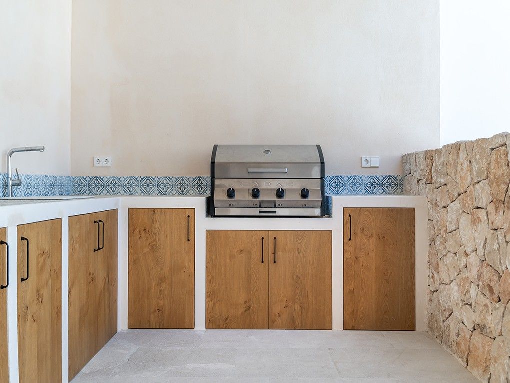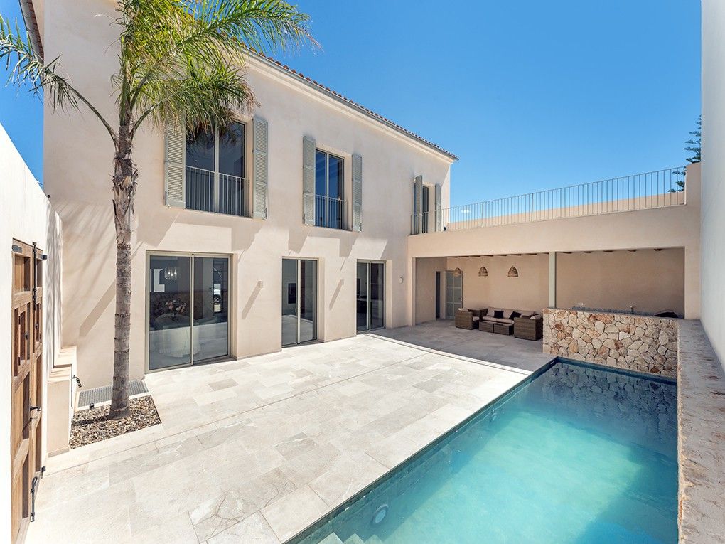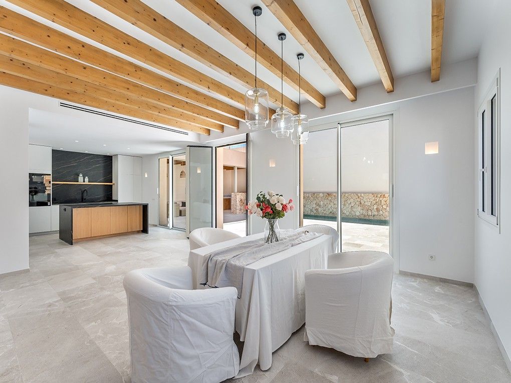 Este elegante pueblo está situado en una tranquila calle lateral de Ses Salines e impresiona por su moderno concepto de diseño y su acogedor patio. Destaca por su distribución extremadamente espaciosa con techos altos y gran atención al detalle. Al entrar en la casa, se encontrarán en la zona de entrada de planta abierta, que conduce a una moderna cocina-salón, contigua al luminoso comedor y que da acceso directo a una terraza soleada. La sala de estar se encuentra en una zona separada. Un aseo de invitados, un lavadero y un garaje completan la planta baja. En la planta superior se encuentra el dormitorio principal con baño en suite, que dispone de una terraza balcón. También dispone de tres dormitorios acogedores y de buen gusto, cada uno con baño en suite y armarios empotrados. La calefacción por suelo radiante y el aire acondicionado garantizan temperaturas agradables en toda la casa. En el patio mediterráneo con piscina (aprox. 3x8,6m), así como en la cocina exterior, podrán pasar horas maravillosas con la familia y los amigos. La plaza del mercado de Ses Salines, con numerosos restaurantes, tiendas y el mercado semanal, se encuentra a pocos minutos a pie.
