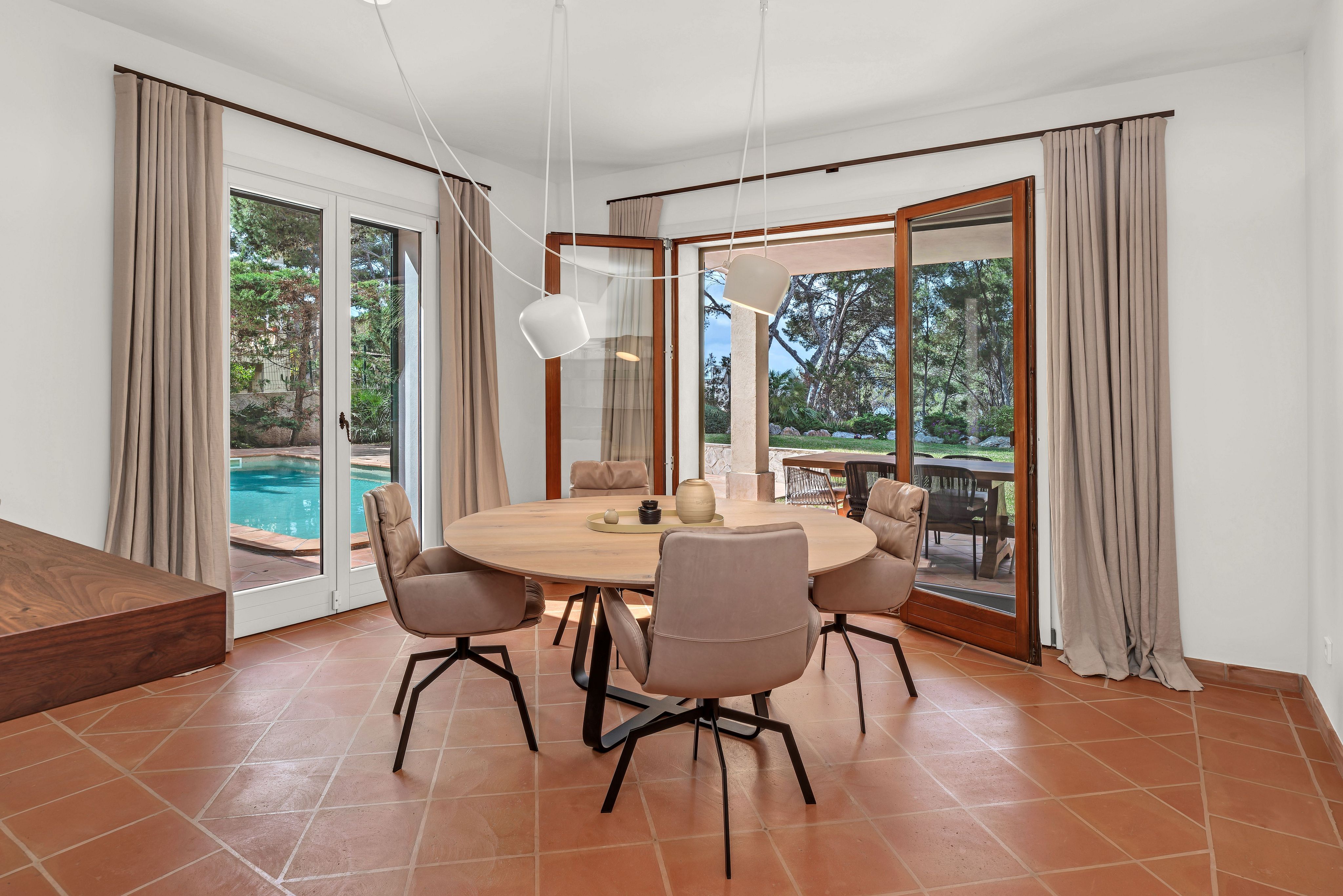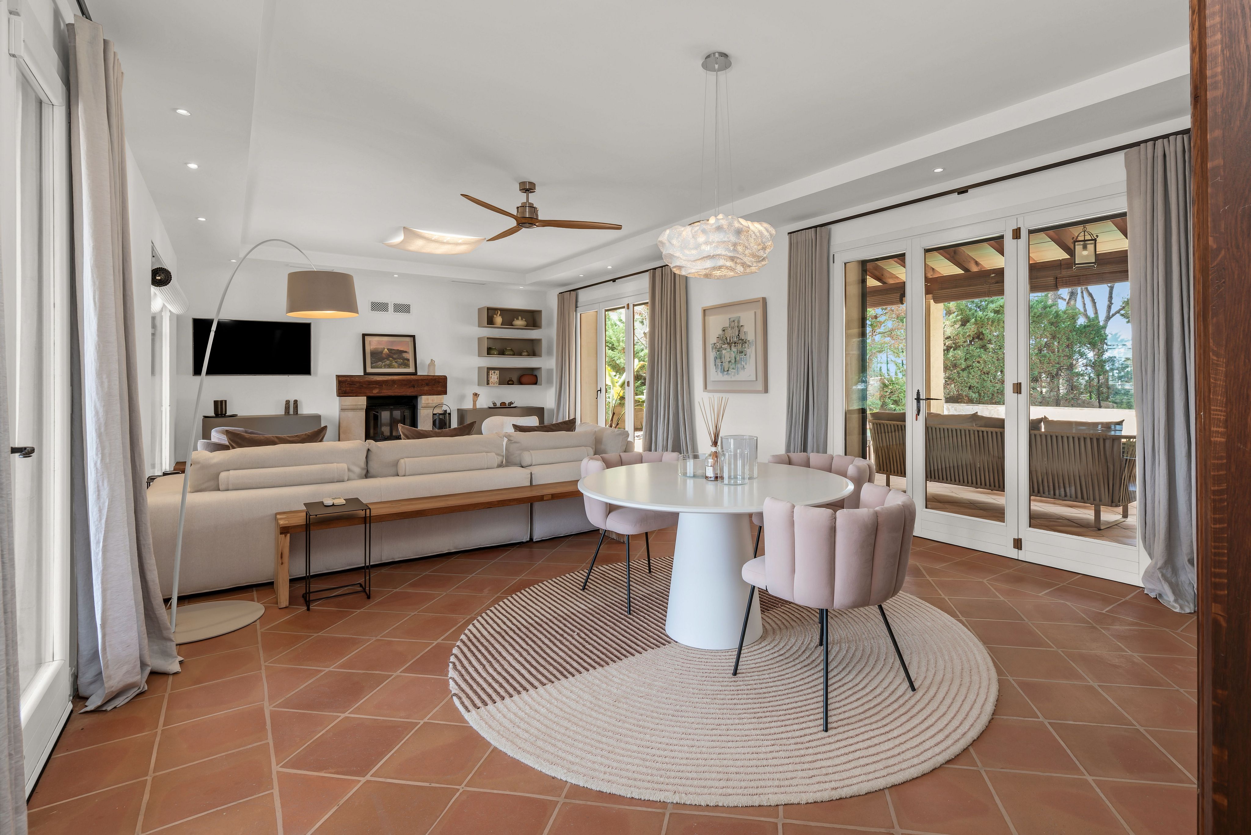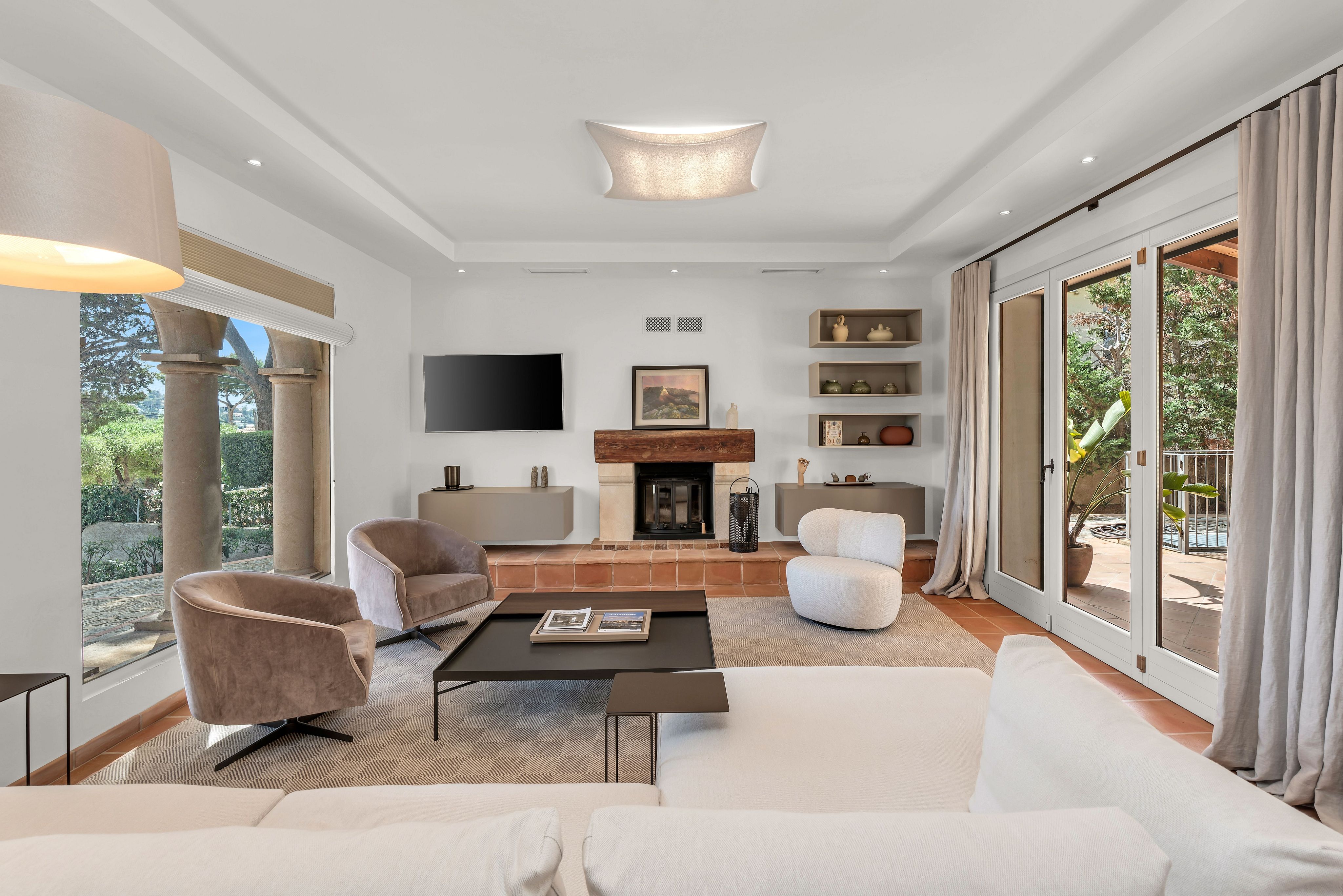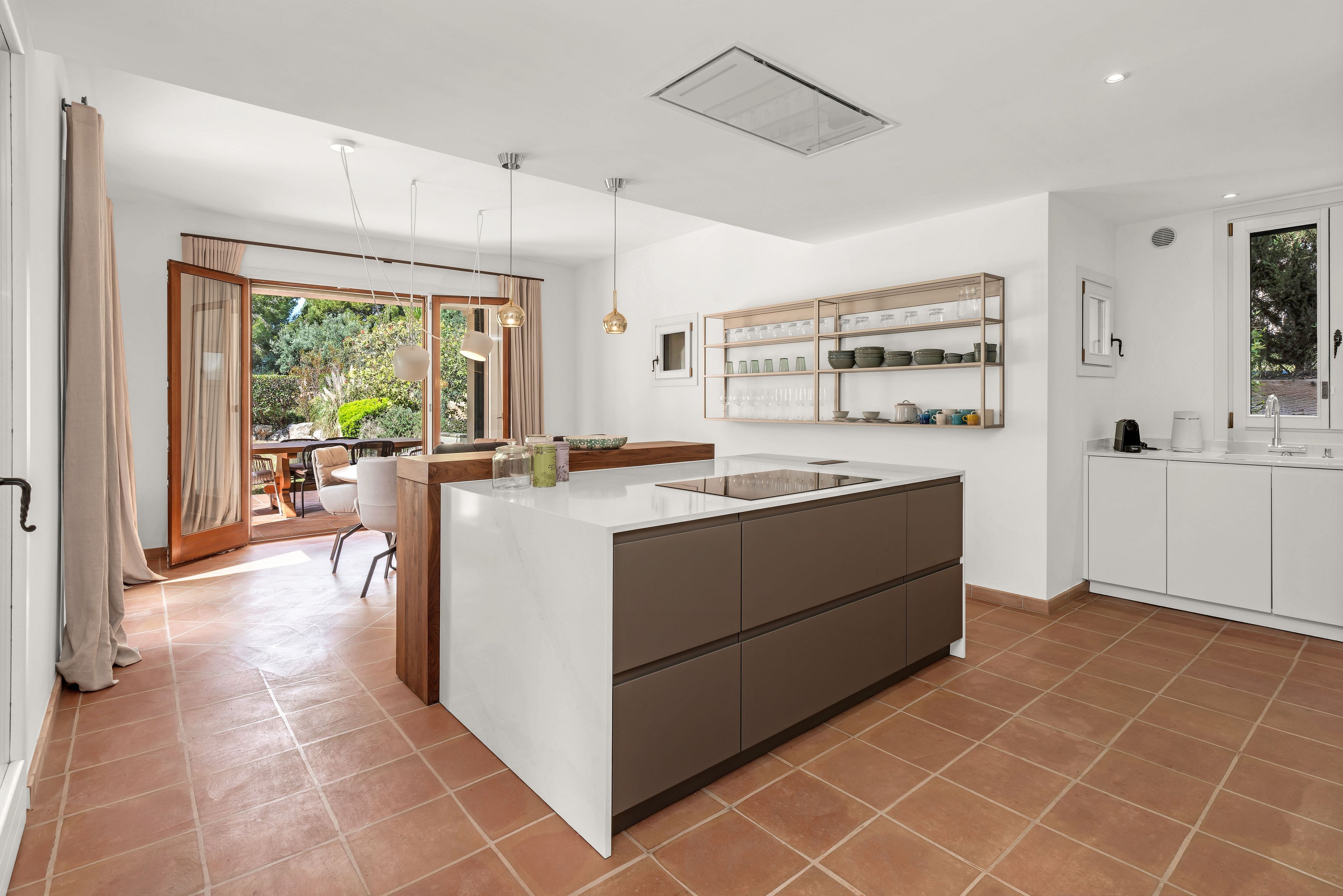 Situada sobre una amplia parcela de aproximadamente 1.335 m², la propiedad se distribuye en dos plantas y destaca por su diseño pensado para maximizar la entrada de luz natural y la perfecta conexión entre los espacios interiores y exteriores. El espacioso salón-comedor con chimenea se abre directamente a las terrazas cubiertas, creando un ambiente ideal tanto para relajarse como para disfrutar de reuniones al aire libre durante todo el año gracias al privilegiado clima de Mallorca.