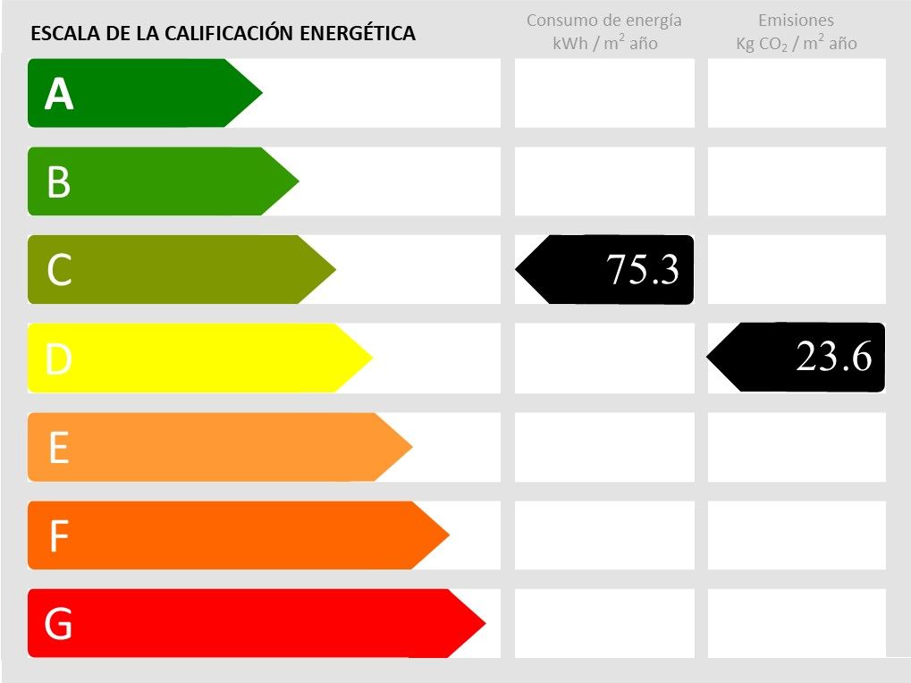 Año de construcción: 1998 • Valor de consumo energético: 75.3 kWh/(m2*a) • Emisiones CO2: 23.6 kg/m2 • Escala de Emisiones de CO2: D • Clase de eficiencia energética: C