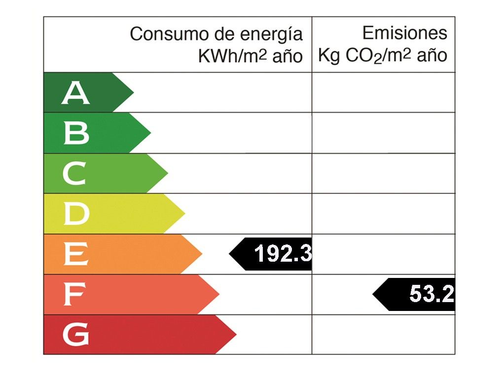 Año de construcción: 2008 • Valor de consumo energético: 192.38 kWh/(m2*a) • Emisiones CO2: 53.28 kg/m2 • Escala de Emisiones de CO2: F • Tipo de calefacción: Bomba de calor • Clase de eficiencia energética: E
