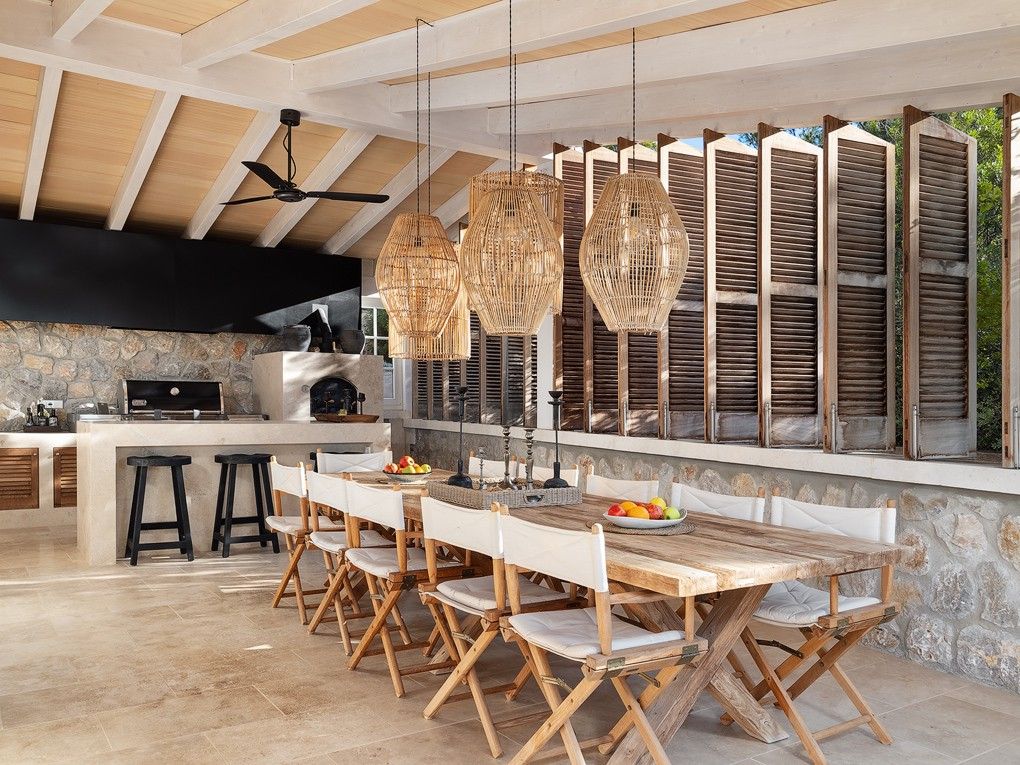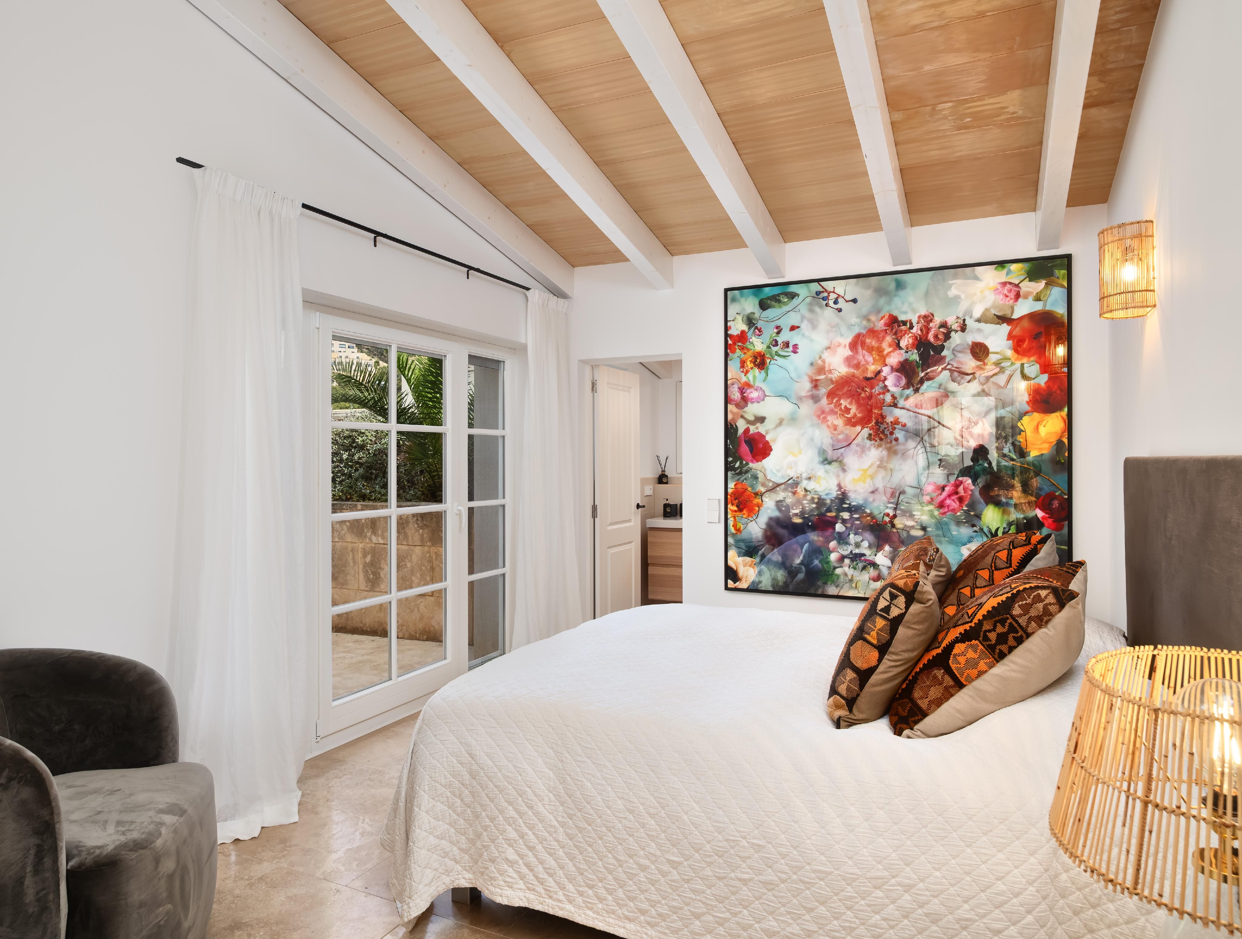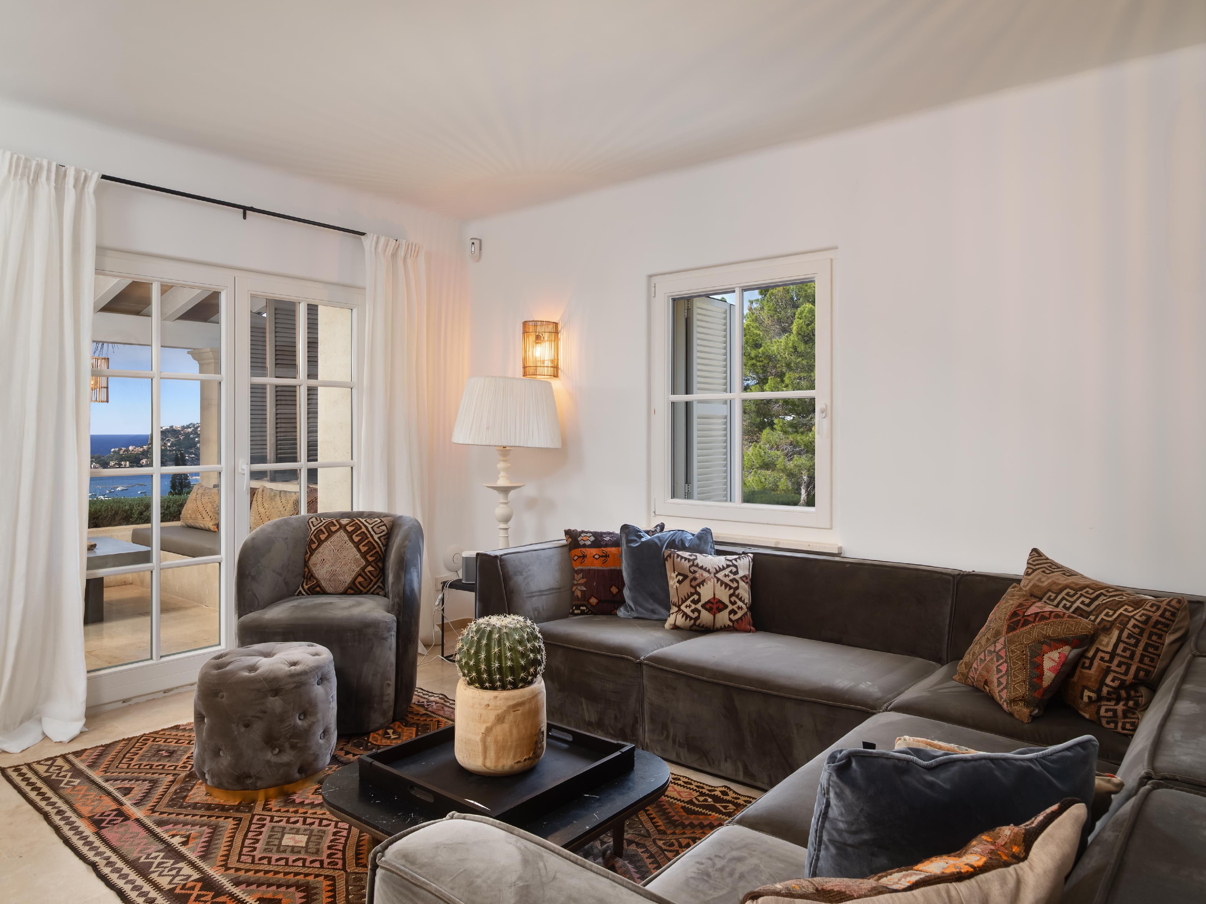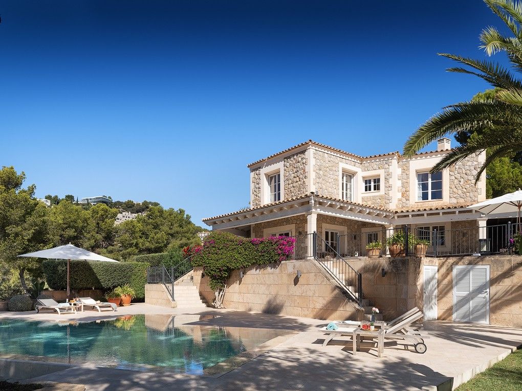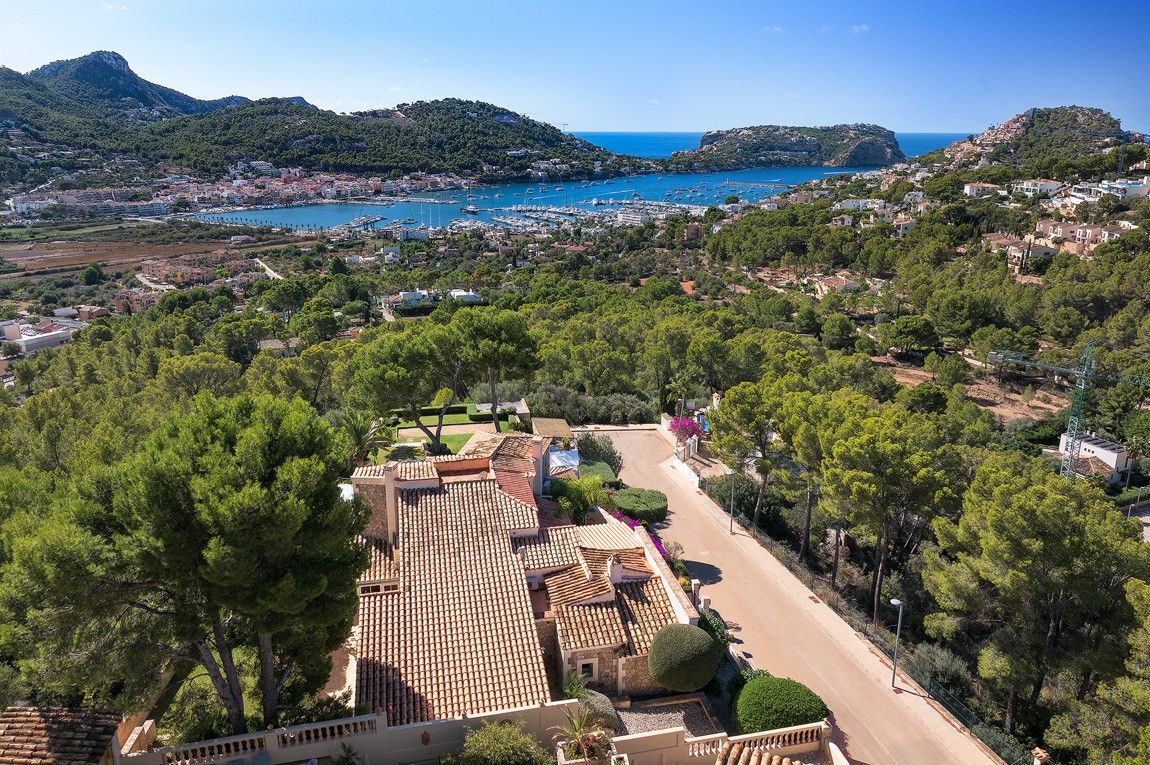 Esta excepcional villa familiar se encuentra en una ubicación privilegiada, en un solar llano con maravillosas vistas al puerto y al mar. Los muros y fachadas de piedra de alta calidad confieren a la casa un aspecto mediterráneo y elegante. El solar llano ofrece mucho espacio para varias terrazas soleadas, piscina exterior, así como zonas ajardinadas y abiertas. La casa principal se divide en una zona de estar con cocina y comedor con chimenea en la planta baja y una zona de dormitorio con tres dormitorios y tres cuartos de baño en la planta superior. La casa de invitados contigua también está dividida en dos plantas y consta de una cocina abierta totalmente equipada, tres dormitorios y tres cuartos de baño. La casa tiene un garaje para un coche y una cochera para un segundo coche. Toda la casa ha sido completamente renovada y amueblada con muy buen gusto. La zona exterior ofrece amplias terrazas cubiertas y descubiertas, barbacoa, jacuzzi, piscina y jardín. Toda la propiedad ofrece fantásticas vistas al puerto y al mar. Dos lados de la propiedad se encuentran junto a una zona verde. Por lo tanto, la propiedad ofrece mucha privacidad y tranquilidad. La casa está equipada con calefacción, aire acondicionado, sistema de alarma y persianas eléctricas. El puerto y el centro de Port Andratx están a 5-10 minutos andando.