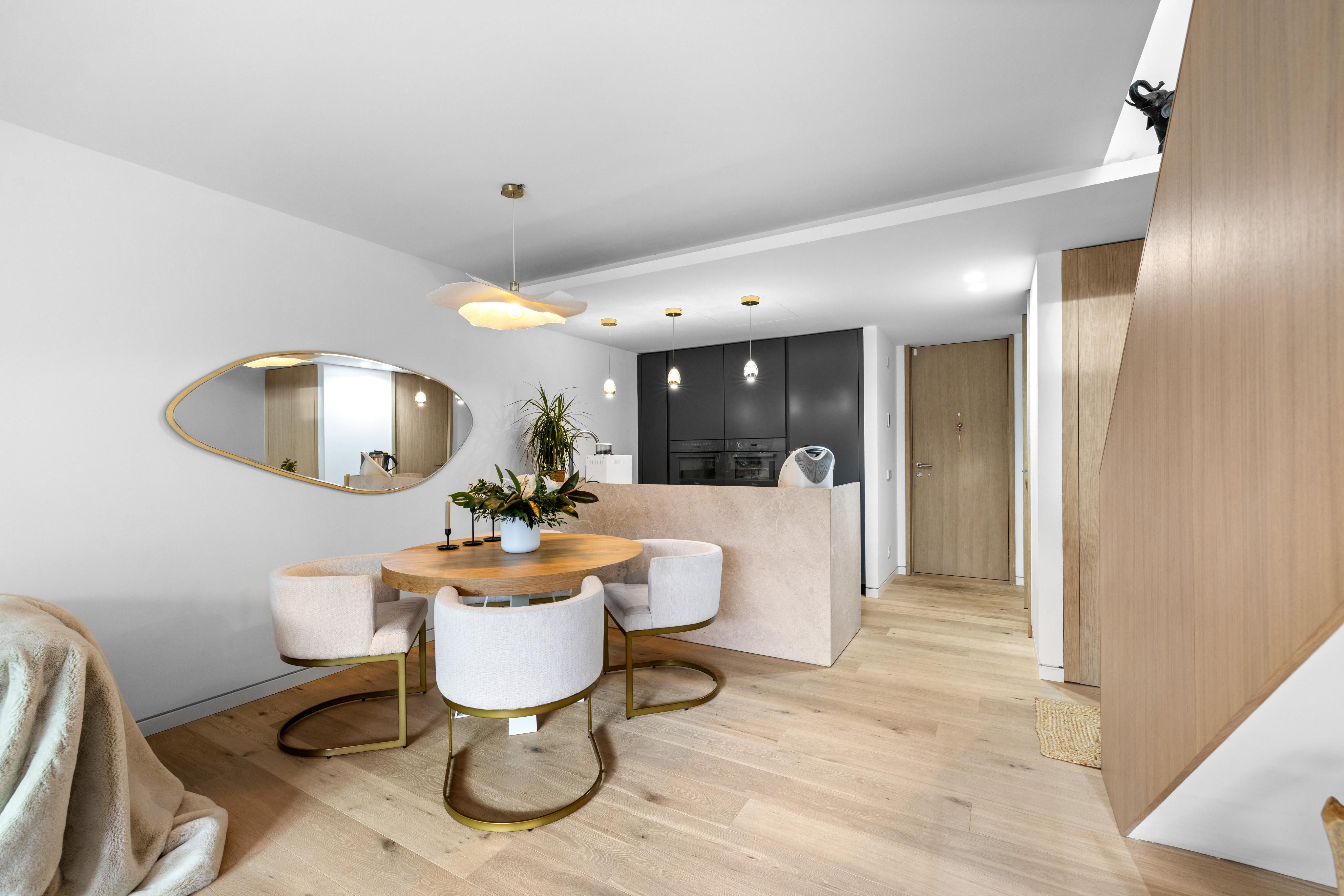 En total, el dúplex cuenta con tres cómodos dormitorios y dos elegantes baños y un baño cerca del salón. Suelos de madera noble, ventanas de gran formato con marcos de madera de alta calidad, así como calefacción por suelo radiante continúa, subrayan el carácter exclusivo de esta propiedad. Las puertas de seguridad proporcionan además un alto nivel de privacidad y seguridad. El complejo residencial también incluye un moderno gimnasio, así como una plaza de aparcamiento privada y un trastero, que completan el estándar de vivienda de alto nivel.