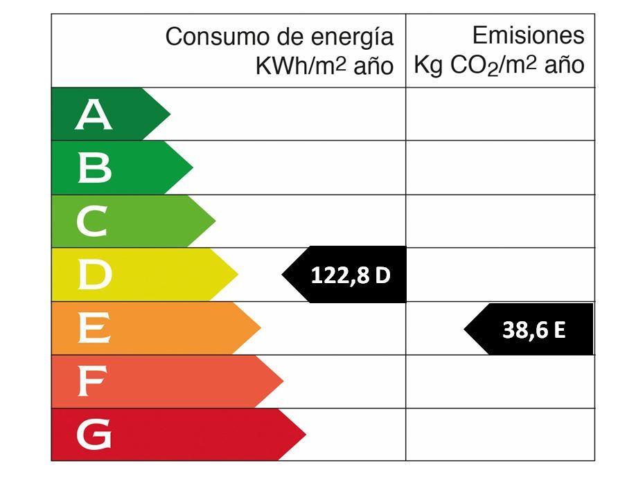 Año de construcción: 2002 • Valor de consumo energético: 122.8 kWh/(m2*a) • Emisiones CO2: 38.6 kg/m2 • Escala de Emisiones de CO2: E • Tipo de calefacción: Gasóleo • Tipo de calefacción: Bomba de calor • Clase de eficiencia energética: D