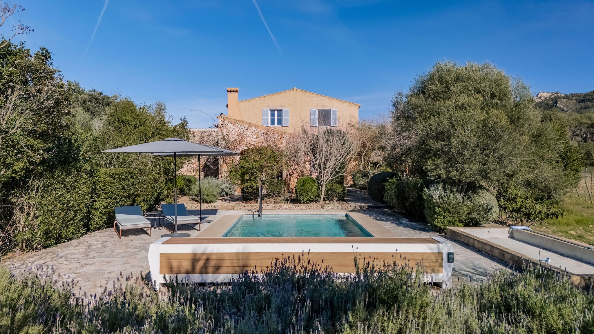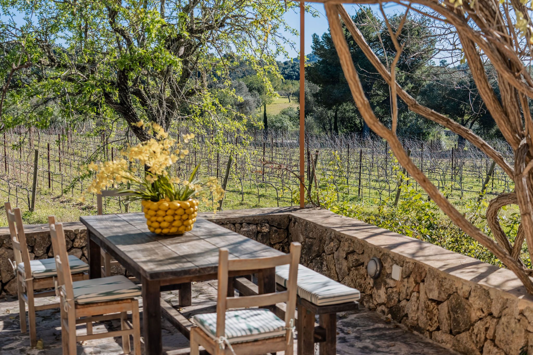 Esta finca tradicional se encuentra en una tranquila zona rural sobre una amplia parcela de 19.533 m² con viñedo propio y magníficas vistas al monte San Salvador. A pesar del entorno idílico, el pueblo de Felanitx así como algunas de las playas más bonitas del sureste de Mallorca se alcanzan en pocos minutos en coche. Cabe destacar que la propiedad dispone de una licencia válida de alquiler vacacional para 6 personas. La finca cuenta con una superficie construida aproximada de 336 m² y combina el carácter mediterráneo con el confort moderno. En la planta baja se encuentra un amplio y luminoso salón-comedor con dos chimeneas que crean un ambiente especialmente cálido y acogedor. La moderna cocina abierta está integrada de forma armoniosa en la zona de estar y ofrece acceso directo a un práctico cuarto de lavandería. En esta planta también se encuentra un dormitorio y un aseo de invitados. Una escalera conduce a la planta superior donde se ubican tres dormitorios adicionales. Dos de ellos comparten un baño y uno dispone de un balcón con bonitas vistas al entorno natural. El amplio dormitorio principal cuenta con baño en suite y acceso a una gran terraza desde la cual se disfrutan impresionantes vistas al paisaje y al monte San Salvador. Uno de los grandes atractivos de la propiedad es su viñedo privado plantado con variedades autóctonas mallorquinas. En total se cultivan tres variedades tintas y dos blancas perfectamente adaptadas al clima mediterráneo y al particular terroir de la zona. La producción anual es de aproximadamente entre 2.500 y 3.500 botellas de vino tinto, blanco y rosado. El viñedo dispone de los registros oficiales correspondientes, lo que permite la producción y comercialización del vino. Los jardines mediterráneos, la variedad de árboles frutales y el viñedo colindante aportan a la finca un carácter único y lleno de encanto. Varias terrazas invitan a disfrutar del entorno mientras que la piscina ofrece un agradable refresco durante los días más cálidos. El amplio porche cubierto, con acceso directo a la cocina y al comedor, cuenta con una chimenea que crea un ambiente acogedor en las noches más frescas. A nivel técnico la finca está bien equipada: un sistema fotovoltaico y colectores solares para agua caliente contribuyen a un suministro energético eficiente. La calefacción por suelo radiante alimentada por una caldera de gasoil garantiza un alto nivel de confort durante todo el año. El suministro de agua se realiza mediante un pozo profundo propio. Un garaje y las amplias zonas exteriores de la parcela completan esta propiedad especial que ofrece mucha privacidad en uno de los paisajes más atractivos del sureste de Mallorca.
