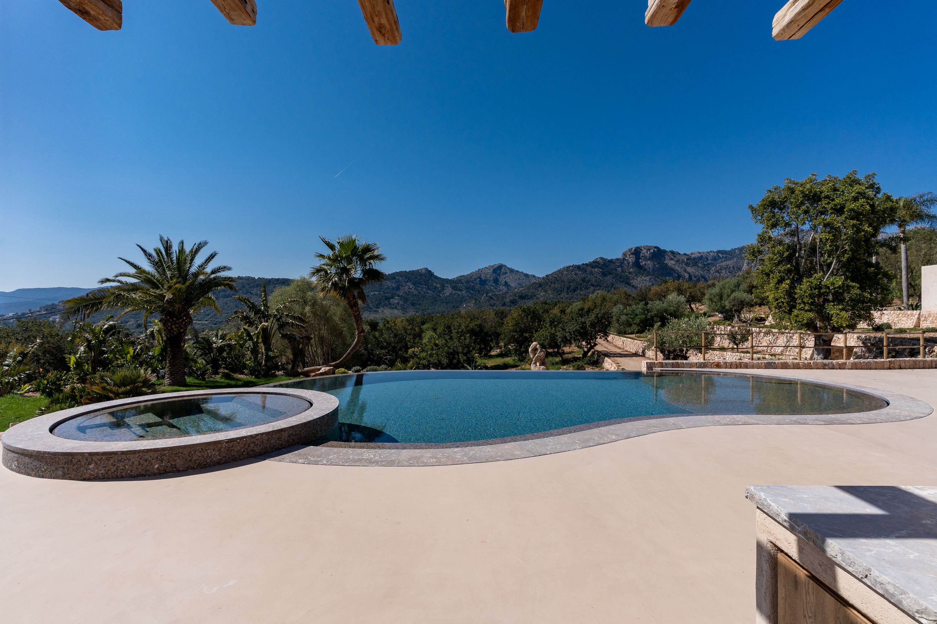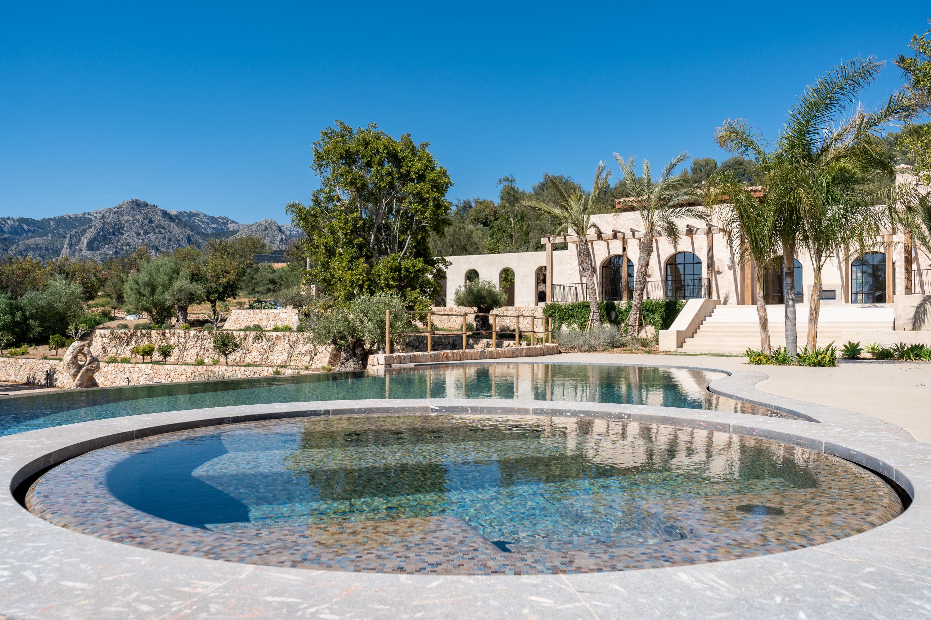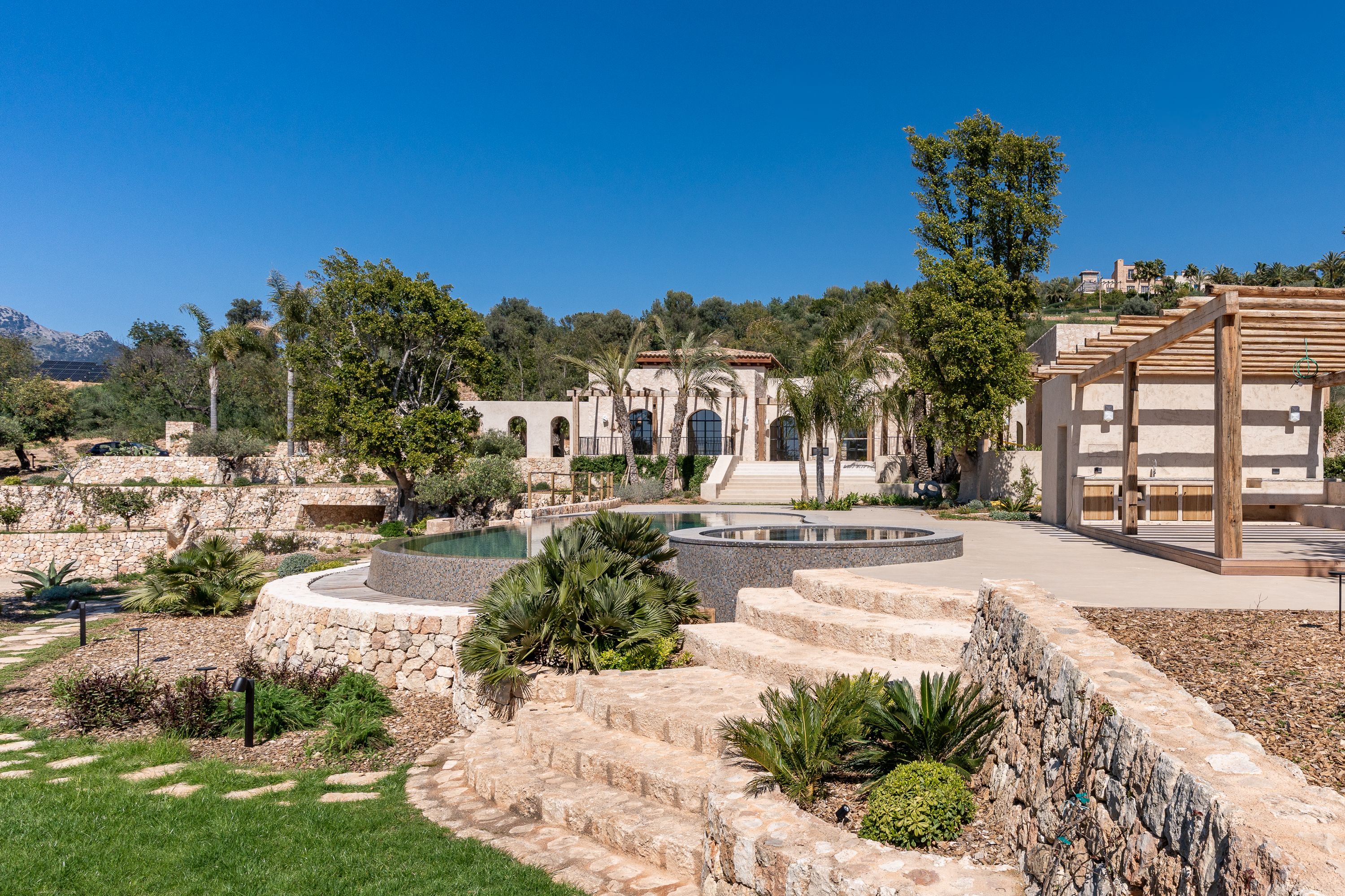 El área exterior es un verdadero santuario, con una impresionante piscina de 84 m² que cuenta con un jacuzzi integrado, ofreciendo el lugar perfecto para la relajación y el disfrute. Una cocina exterior mejora el estilo de vida al aire libre, permitiendo cocinar y comer fácilmente al aire libre. Los exuberantes jardines que rodean la propiedad proporcionan un entorno tranquilo y pintoresco, ideal para relajarse y disfrutar de la belleza natural del campo de Bunyola.