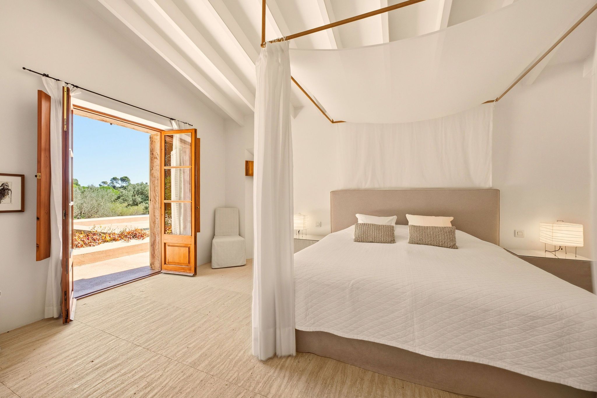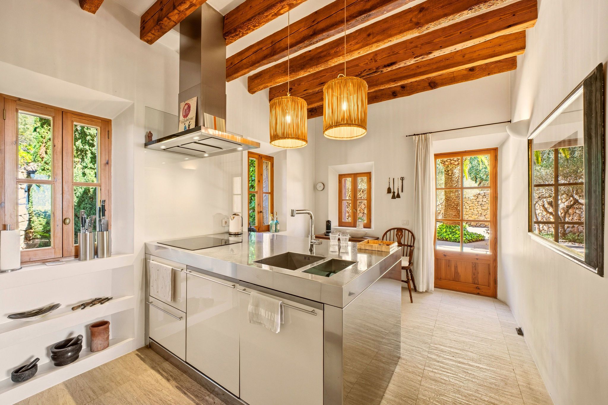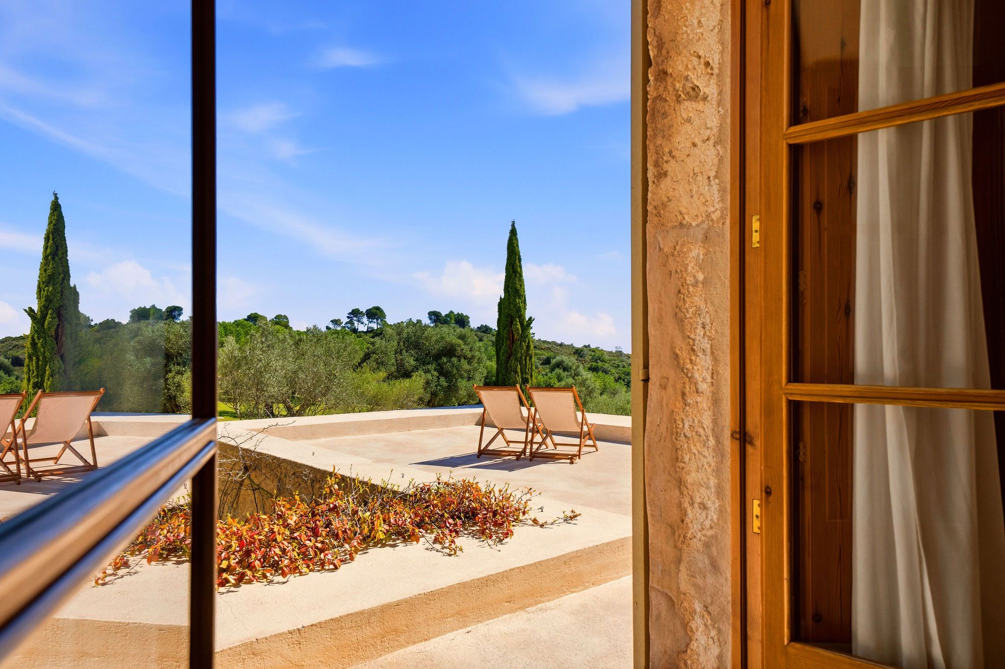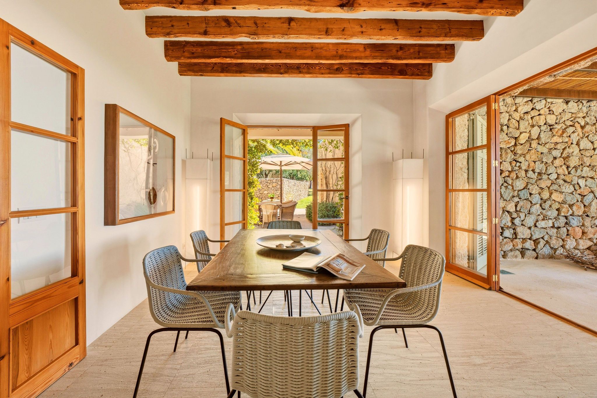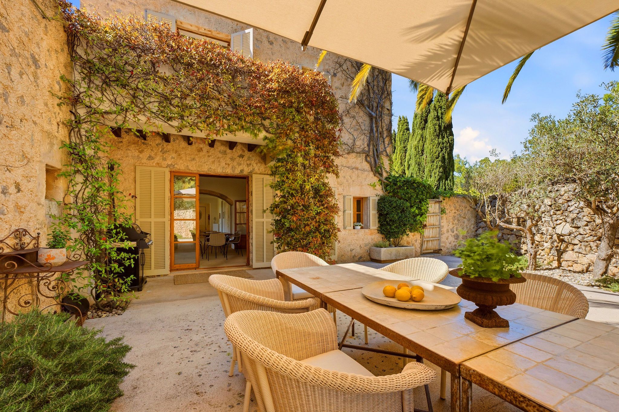 Este exclusivo oasis de armonía encanta con una ingeniosa simbiosis de tradición constructiva histórica y estética purista. Situado en una meseta elevada, se abre al sur una impresionante vista panorámica de 270 grados sobre el paisaje salvaje y romántico hasta el mar. El jardín paisajista en terrazas, rodeado de muros de piedra natural centenarios, ofrece numerosos lugares para sentarse y relajarse en total intimidad. La piscina de agua de mar de 56 m² con zona de estar cubierta se encuentra en una terraza ligeramente alejada, debajo de la casa. Sería fácil montar un gimnasio junto a la piscina. La casa de dos plantas con 490 m² de espacio habitable fue construida en 2006 - inspirada por un conocido arquitecto mallorquín - y ampliamente renovada y actualizada técnicamente en 2016 y 2023. Una antigua puerta de madera maciza conduce al alto hall de entrada con elegante escalera y galería. En la planta baja, una gran sala de estar y comedor de planta abierta se abre con una terraza cubierta que recorre toda la longitud de la casa y maravillosas vistas. Otro espacioso salón ofrece una acogedora zona de estar frente a una chimenea abierta con ventanas panorámicas. A la derecha, un edificio independiente con una gran suite de invitados y cuarto de baño se accede a través de una terraza. Se utiliza como oficina, pero puede convertirse fácilmente de nuevo o incluso convertirse en dos habitaciones de invitados. En la planta superior hay una suite principal con terraza panorámica y un dormitorio, cada uno con vestidor y baño en suite. A la izquierda de la casa hay otra suite de invitados con acceso independiente y terraza. Las características de esta propiedad con su ambiente único y relajante incluyen un gran sótano con preparación para una zona de spa y bodega, calefacción por suelo radiante, aire acondicionado en las cuatro suites, pozo, ósmosis de agua potable, dos cisternas y un sistema de electricidad autosuficiente con paneles solares y generador.