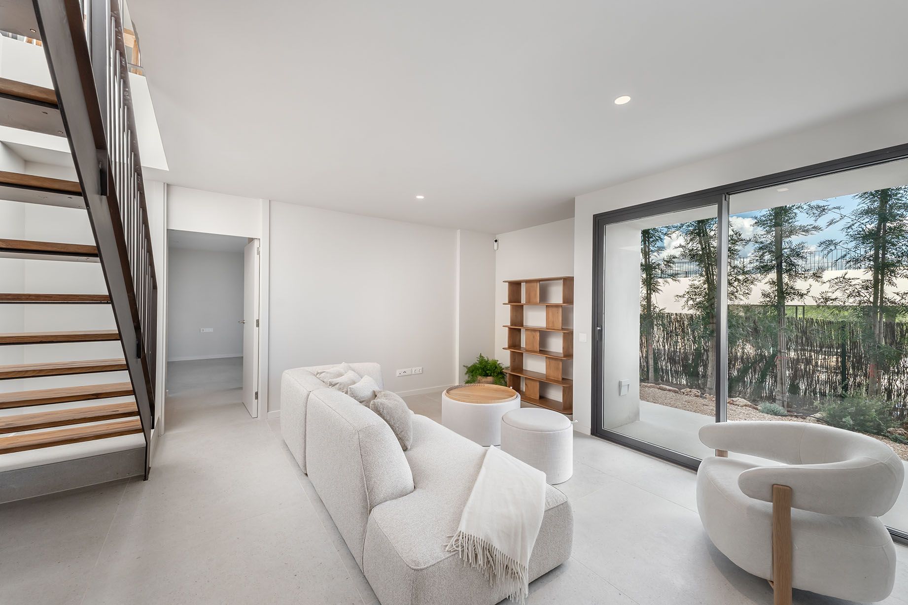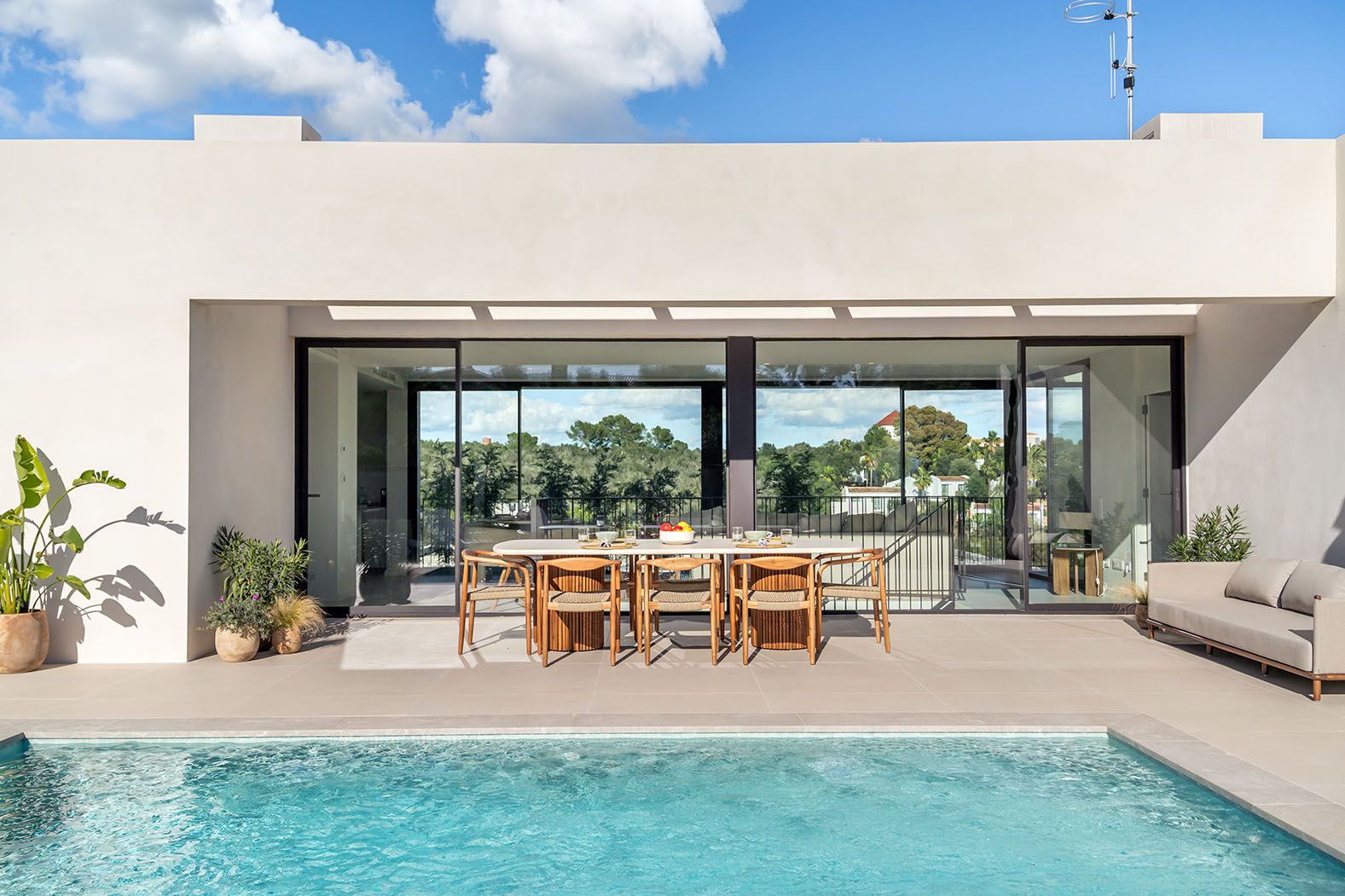 En la planta baja se encuentran dos dormitorios adicionales con baño en suite, así como una sala de estar abierta que también puede ser utilizada como estudio. Un trastero de aproximadamente 15 m² completa esta planta. Todas las villas cuentan con una piscina, una zona chill-out y un aparcamiento. Un clima agradable durante todo el año está garantizado en toda la casa mediante un sistema central de aire acondicionado frío/calor y calefacción central por suelo radiante.