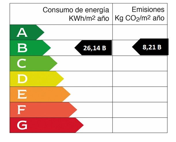 Año de construcción: 2025 • Valor de consumo energético: 26.14 kWh/(m2*a) • Emisiones CO2: 8.21 kg/m2 • Escala de Emisiones de CO2: B • Clase de eficiencia energética: B