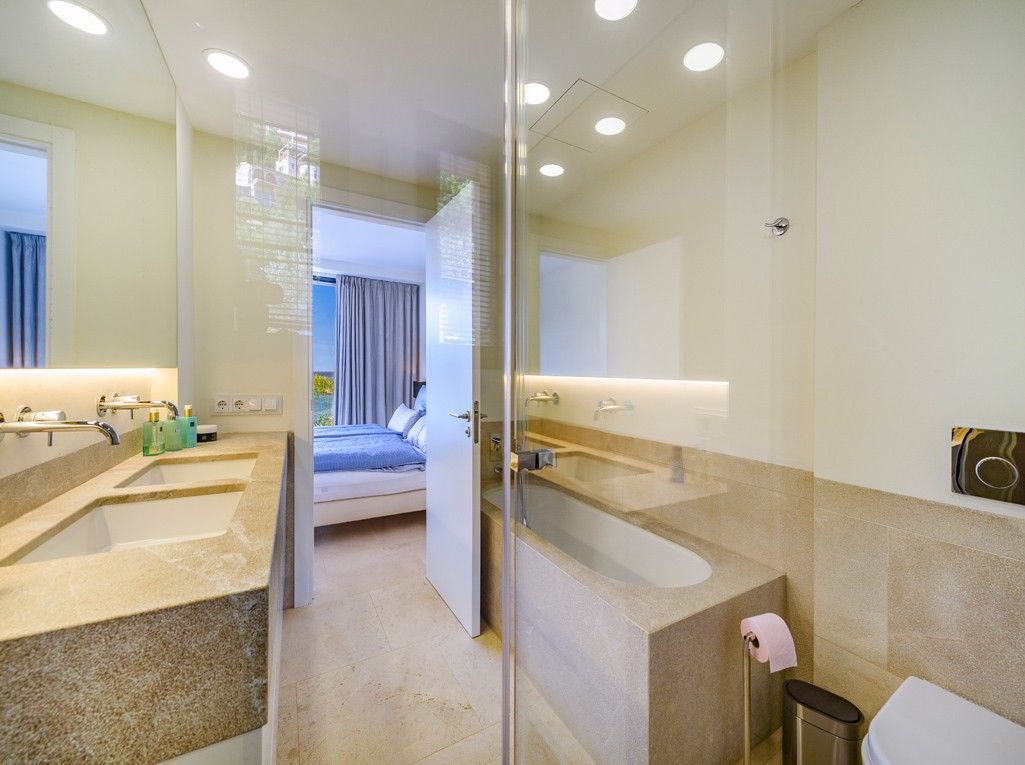 En cuanto entren en esta moderna villa se sorprenderán por las impresionantes vistas que se aprecian de toda la bahía del Puerto de Soller hasta el mar abierto. La superficie habitable de aprox. 328 m2 ha sido diseñada de forma óptima con materiales exquisitos y se distribuye en tres niveles con un total de 5 dormitorios, cada uno con su propio cuarto de baño. El amplio salón, el comedor y la cocina se encuentran en el nivel intermedio, mientras que los dormitorios y un salón se encuentran en la planta superior y en el nivel inferior. La casa está inundada de luz gracias a los grandes ventanales panorámicos en todas las zonas, y no importa en qué parte de la casa se encuentre, el mar siempre está a la vista. Durante los meses de verano también podrá disfrutar de las puestas de sol desde el puerto hacia al mar abierto. Las zonas de terraza están diseñadas con gran gusto, complementadas por un encantador jardín. La propiedad ligeramente elevada está situada en una calle sin salida, tranquila y soleada, pero a poca distancia de tiendas y restaurantes de todo tipo. Extras: ascensor, plaza de aparcamiento dentro de la propiedad. Aire acondicionado frío/calor en todas las habitaciones, suelo radiante, piscina con calefacción y refrigeración. Como las fotos ya son muy informativas, no hacen falta más palabras de acuerdo con la frase inicial: