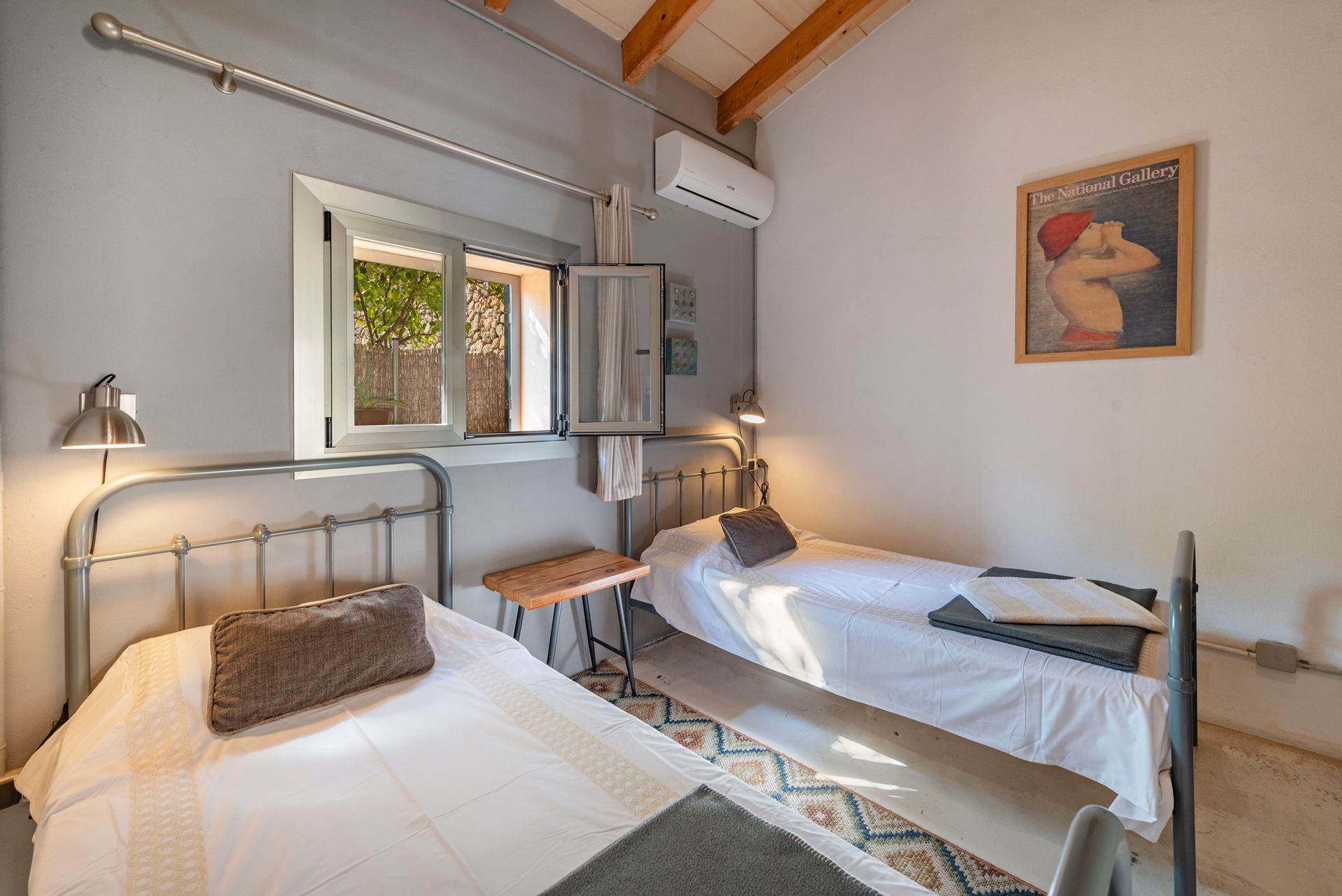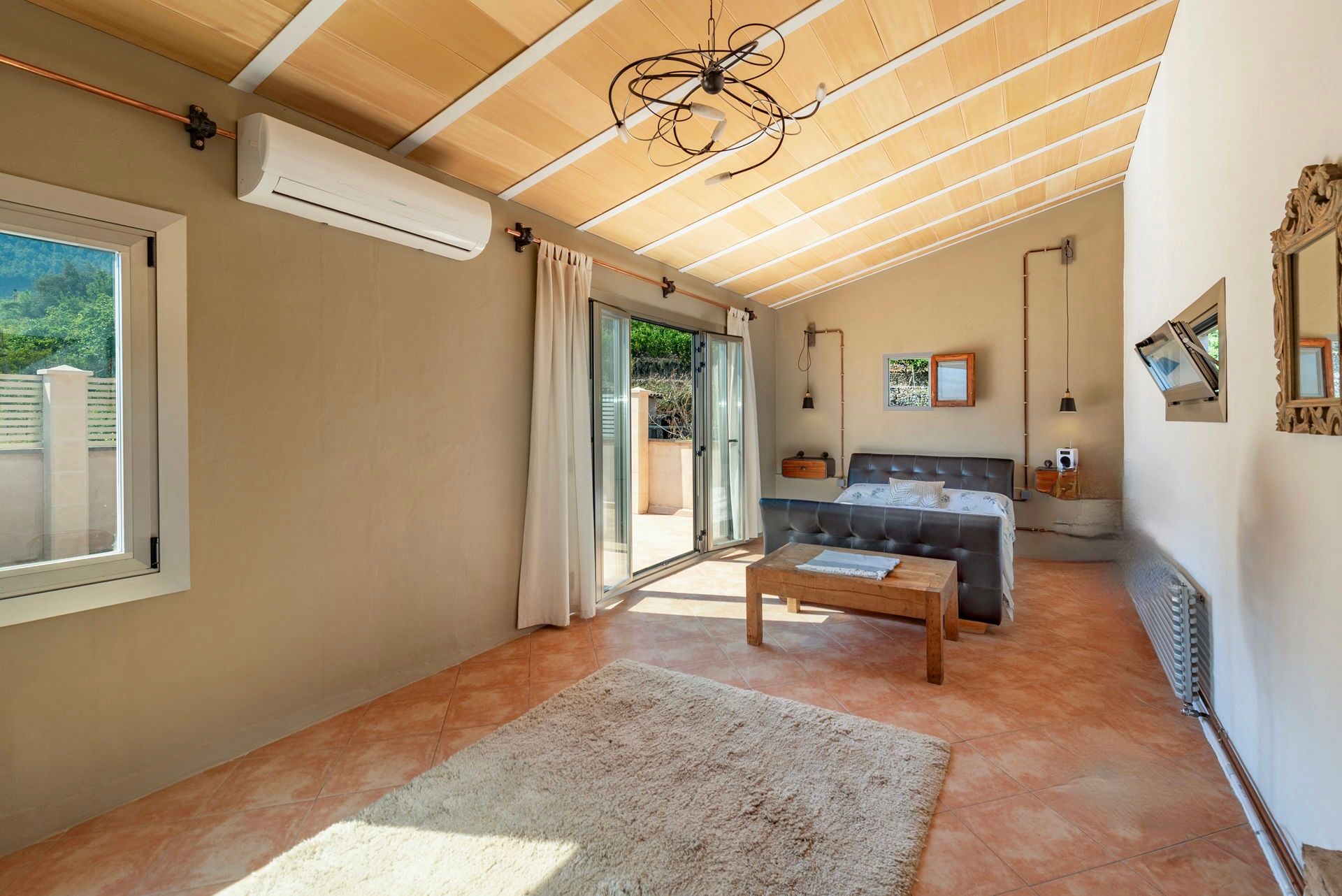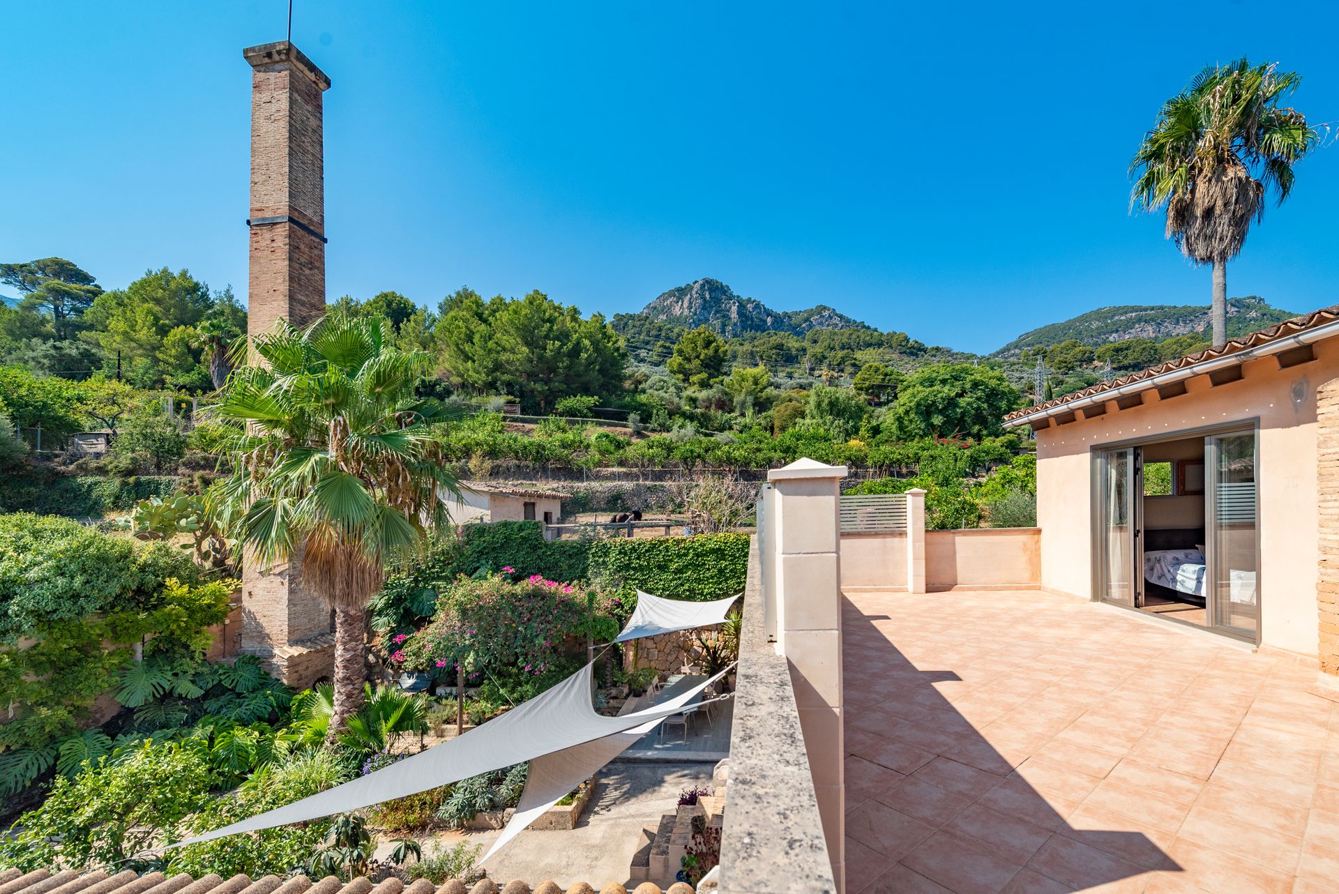 La vivienda principal dispone de una amplia cocina de diseño contemporáneo, cuatro dormitorios —uno de ellos con terraza privada— y dos salones con acceso directo al jardín. Desde este y desde las terrazas se contemplan imponentes vistas a la histórica chimenea de la fábrica, la Tramuntana y Sóller.