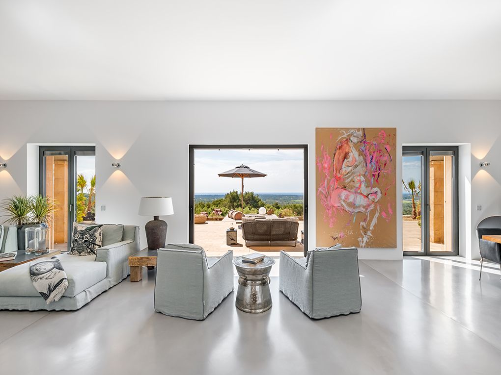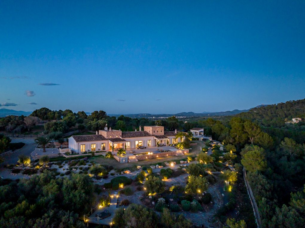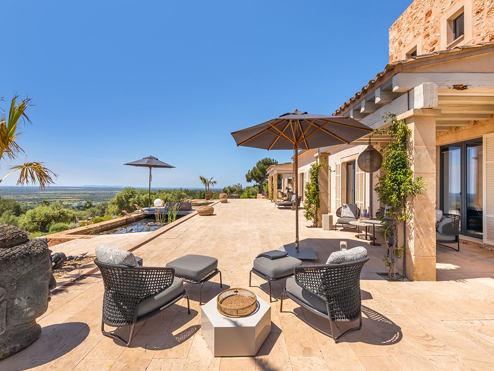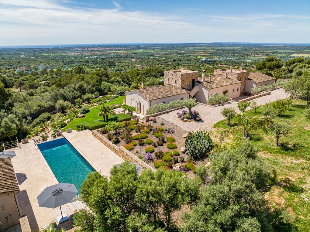 Esta propiedad única se encuentra en uno de los puntos más altos del sureste. Enclavado en un paisaje idílico, domina todos los pueblos de la costa este y disfruta de una vista al mar de ensueño hasta la isla de Cabrera. La propiedad combina calidad, diseño moderno y un toque de estilo de finca rústica - la combinación perfecta para una casa en Mallorca. Las espectaculares vistas se pueden disfrutar desde casi todas las habitaciones gracias a la planta individual y a los ventanales del suelo al techo. La amplia zona de estar consta de un luminoso comedor, una cocina Bulthaup abierta y un acogedor rincón con chimenea. Hay un total de cinco habitaciones disponibles. La amplia suite principal impresiona con su propio vestidor, una sala de televisión independiente y un baño con bañera. En el ala oeste hay otros tres dormitorios con dos baños. En la planta superior, el quinto dormitorio con baño en suite tiene una entrada independiente. Desde todas las habitaciones se puede acceder a la terraza principal de la propiedad, desde la que varios caminos conducen a través del jardín cuidadosamente diseñado hasta la piscina infinita de 15 x 4 m. Además de la zona de bienestar con sauna, también hay un estudio, un armario para vinos hecho a medida, aire acondicionado central y calefacción por suelo radiante, entre otras muchas características dignas de mención. Un garaje subterráneo con tres plazas de aparcamiento y otros refinamientos técnicos y de diseño hacen que esta propiedad sea muy especial y única.