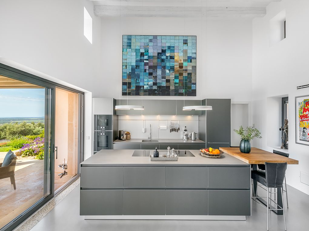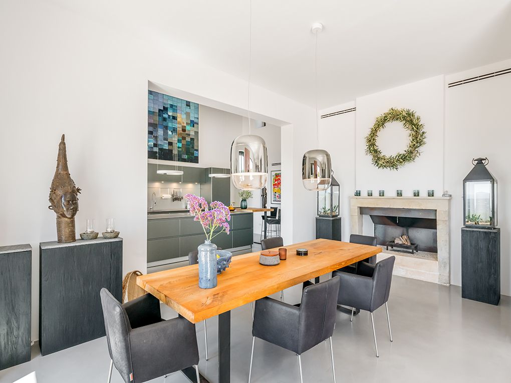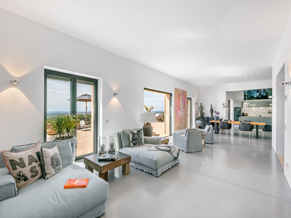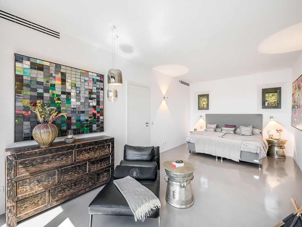 Esta propiedad única se encuentra en uno de los puntos más altos del sureste. Enclavado en un paisaje idílico, domina todos los pueblos de la costa este y disfruta de una vista al mar de ensueño hasta la isla de Cabrera. La propiedad combina calidad, diseño moderno y un toque de estilo de finca rústica - la combinación perfecta para una casa en Mallorca. Las espectaculares vistas se pueden disfrutar desde casi todas las habitaciones gracias a la planta individual y a los ventanales del suelo al techo. La amplia zona de estar consta de un luminoso comedor, una cocina Bulthaup abierta y un acogedor rincón con chimenea. Hay un total de cinco habitaciones disponibles. La amplia suite principal impresiona con su propio vestidor, una sala de televisión independiente y un baño con bañera. En el ala oeste hay otros tres dormitorios con dos baños. En la planta superior, el quinto dormitorio con baño en suite tiene una entrada independiente. Desde todas las habitaciones se puede acceder a la terraza principal de la propiedad, desde la que varios caminos conducen a través del jardín cuidadosamente diseñado hasta la piscina infinita de 15 x 4 m. Además de la zona de bienestar con sauna, también hay un estudio, un armario para vinos hecho a medida, aire acondicionado central y calefacción por suelo radiante, entre otras muchas características dignas de mención. Un garaje subterráneo con tres plazas de aparcamiento y otros refinamientos técnicos y de diseño hacen que esta propiedad sea muy especial y única.