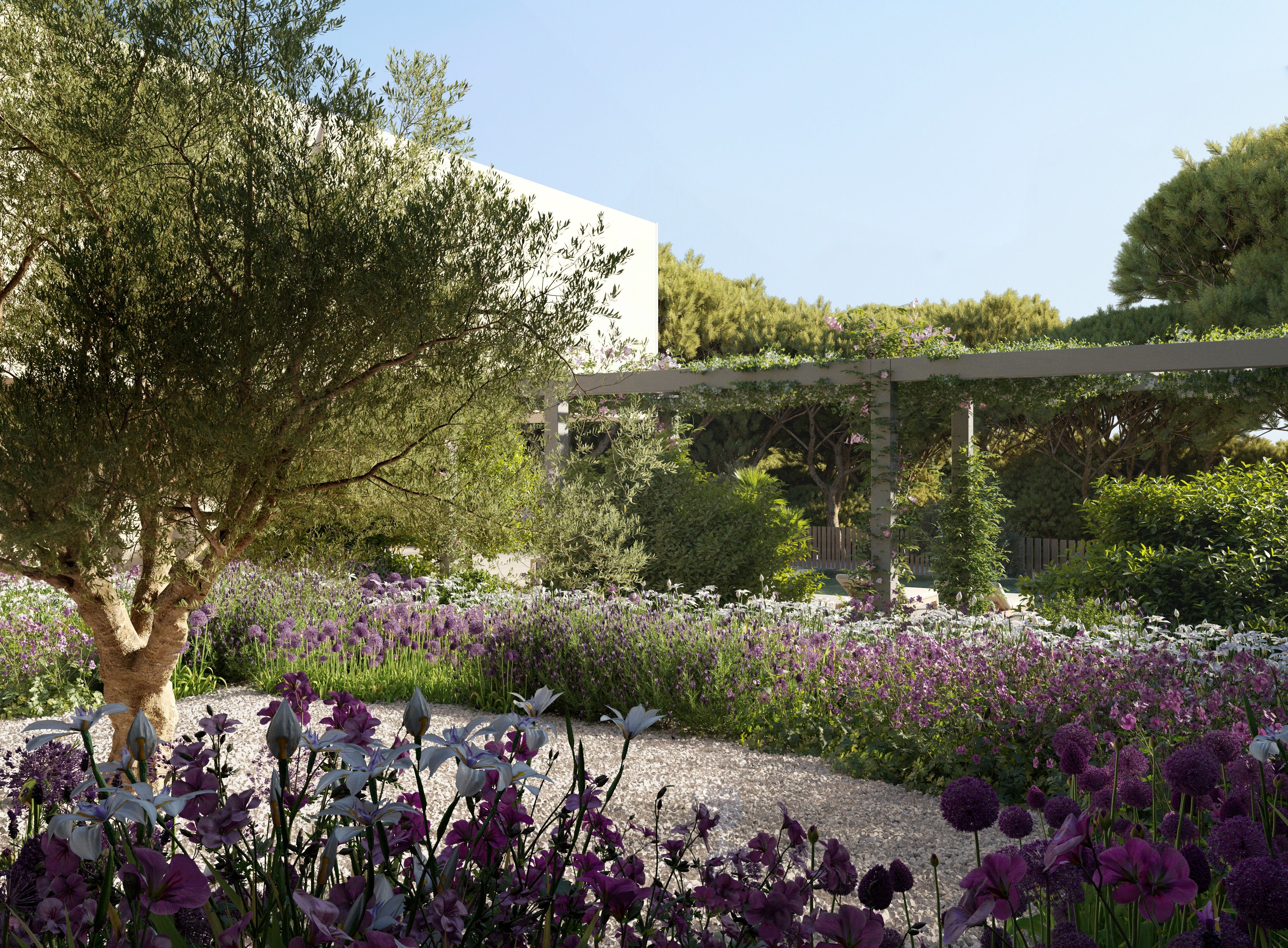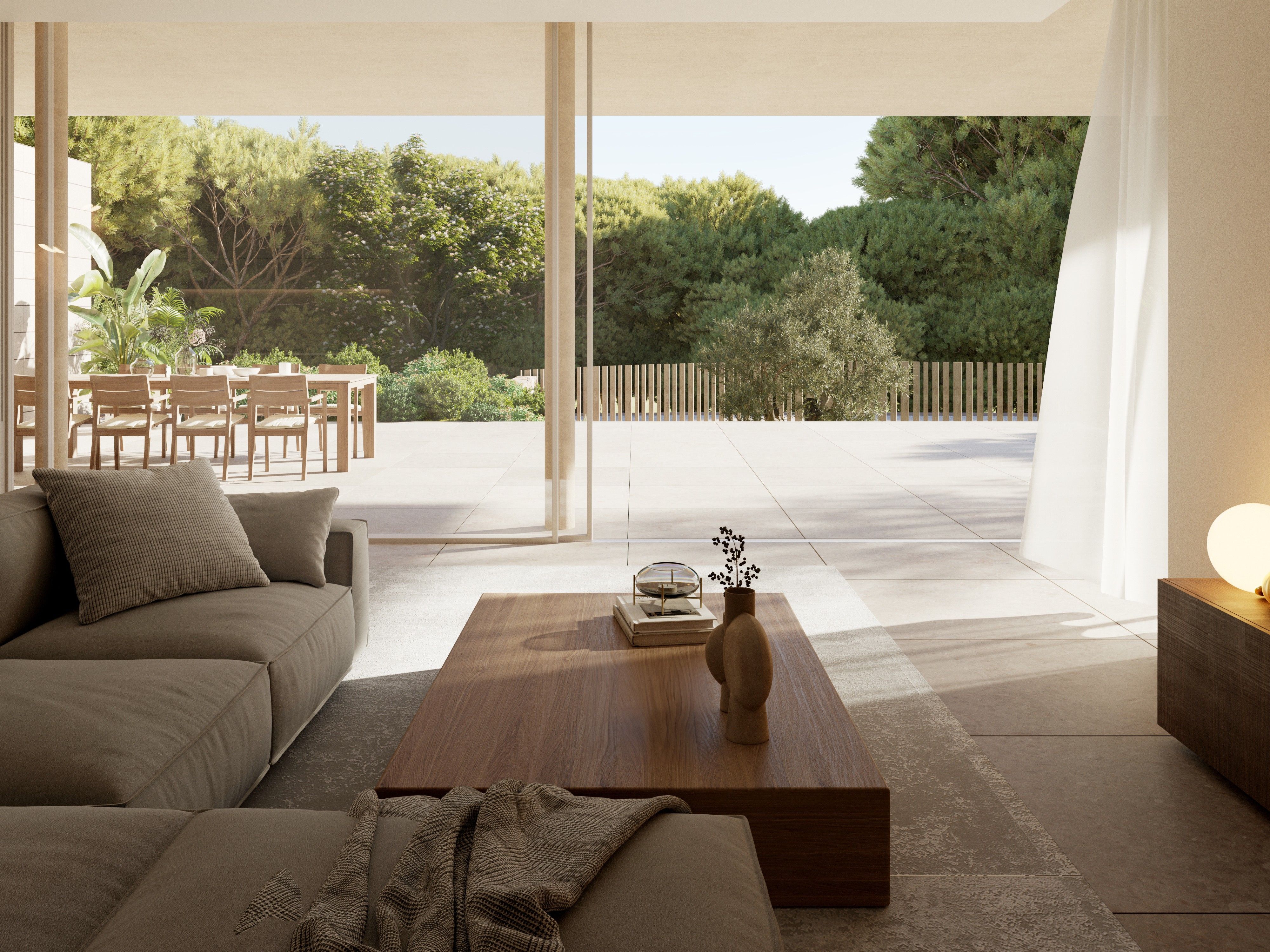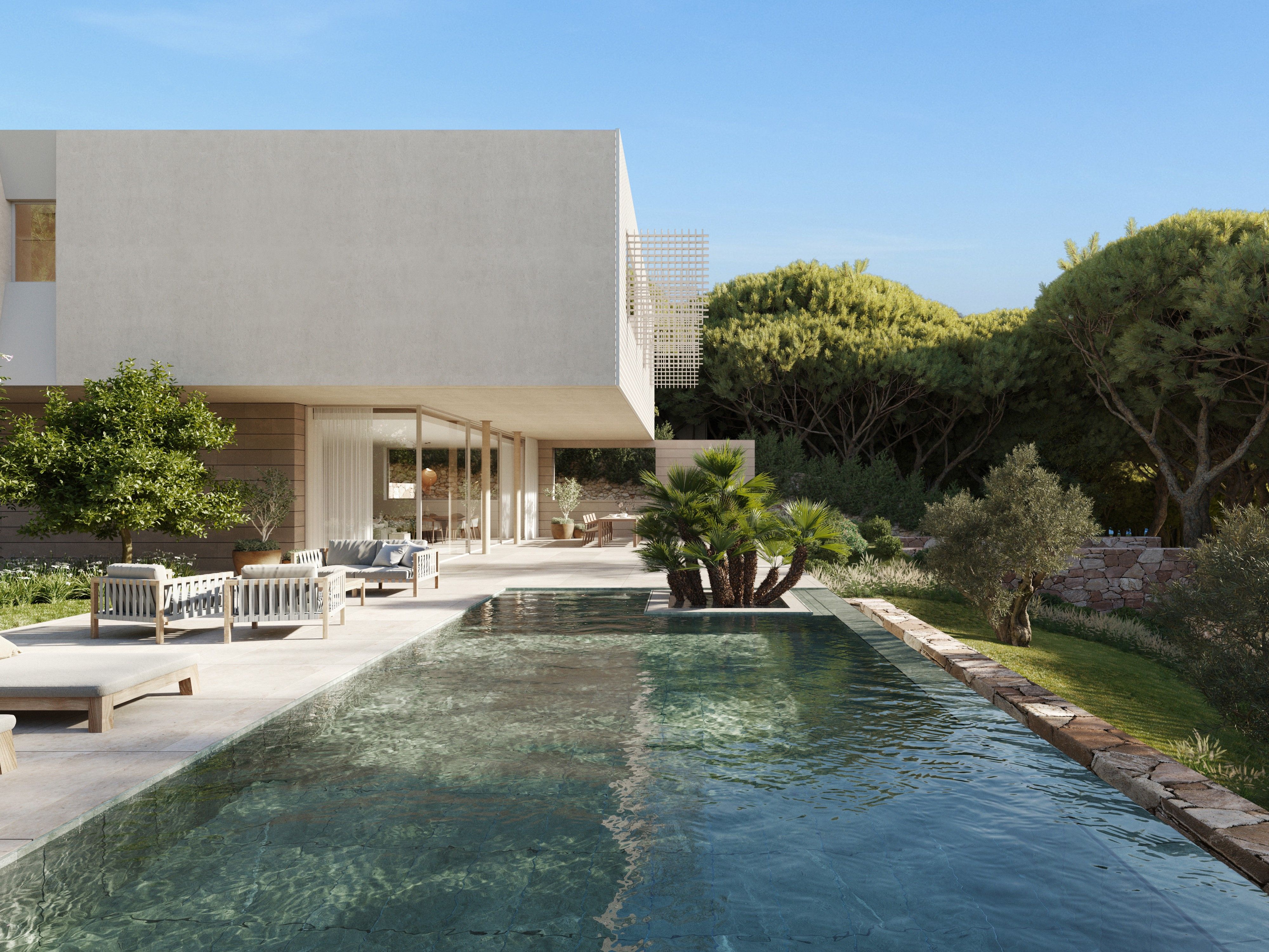 En el corazón del suroeste de Mallorca, rodeado de exuberante vegetación mediterránea, el complejo residencial VERDEMAR con 11 villas independientes con piscina infinita se está construyendo directamente junto al mar. La ubicación es tranquila y céntrica, a sólo 15 minutos de Palma y 25 minutos del aeropuerto. A playa de arena de Cala Vinyes con agua turquesa y un agradable chiringuito se puede llegar a pie en pocos minutos. La vida familiar cotidiana también se ve facilitada por la proximidad a colegios internacionales e instalaciones deportivas y recreativas. Los amantes del golf tienen el Club de Golf de Poniente a tiro de piedra y otros campos de golf en las inmediaciones. Las 11 villas comparten ciertos elementos de diseño y se caracterizan especialmente por una arquitectura de líneas limpias y una interpretación moderna de la celosía tradicional, así como por la fusión entre espacios interiores y exteriores. Disfrute de la intimidad y la tranquilidad que le ofrecen las villas. Durante el proceso de planificación, se tuvo especial cuidado en garantizar que la orientación de los edificios ofreciera la máxima privacidad. No obstante, se crea una sensación de comunidad gracias al camino que conecta todas las viviendas con la zona verde privada. También se prestó especial atención al uso de materiales locales y sostenibles. Además, la celosía metálica que rodea las 3 habitaciones delanteras de la planta superior no sólo es un impresionante elemento visual, sino que permite que el aire circule libremente al tiempo que filtra la luz solar, manteniendo frescas las viviendas. Al mismo tiempo, permite transformar los dormitorios y la terraza en un apartado oasis de tranquilidad. Todos los dormitorios (3-4) son amplios y están equipados con armarios empotrados y cuartos de baño. El dormitorio principal ofrece un cuarto de baño, con una enorme ducha de hidromasaje. La pieza central de las villas es la sala de estar y comedor con cocina abierta de bulthaup con isla de cocina y ventanas de suelo a techo que se abren completamente a la terraza y jardín privado con piscina, creando una transición suave de la vida interior a la vida al aire libre. El suelo de piedra natural de gran formato en toda la vivienda y en las terrazas crea una sensación adicional de amplitud. Varios elementos de madera y una iluminación cálida crean un ambiente acogedor. Otras características incluyen electrodomésticos empotrados Miele, grifería Gessi o similar, ventanas minimalistas de METRA, domótica KNX, aire acondicionado f/c con control individual y calefacción por suelo radiante. Cada villa cuenta con un garaje o aparcamiento cubierto para varios coches.