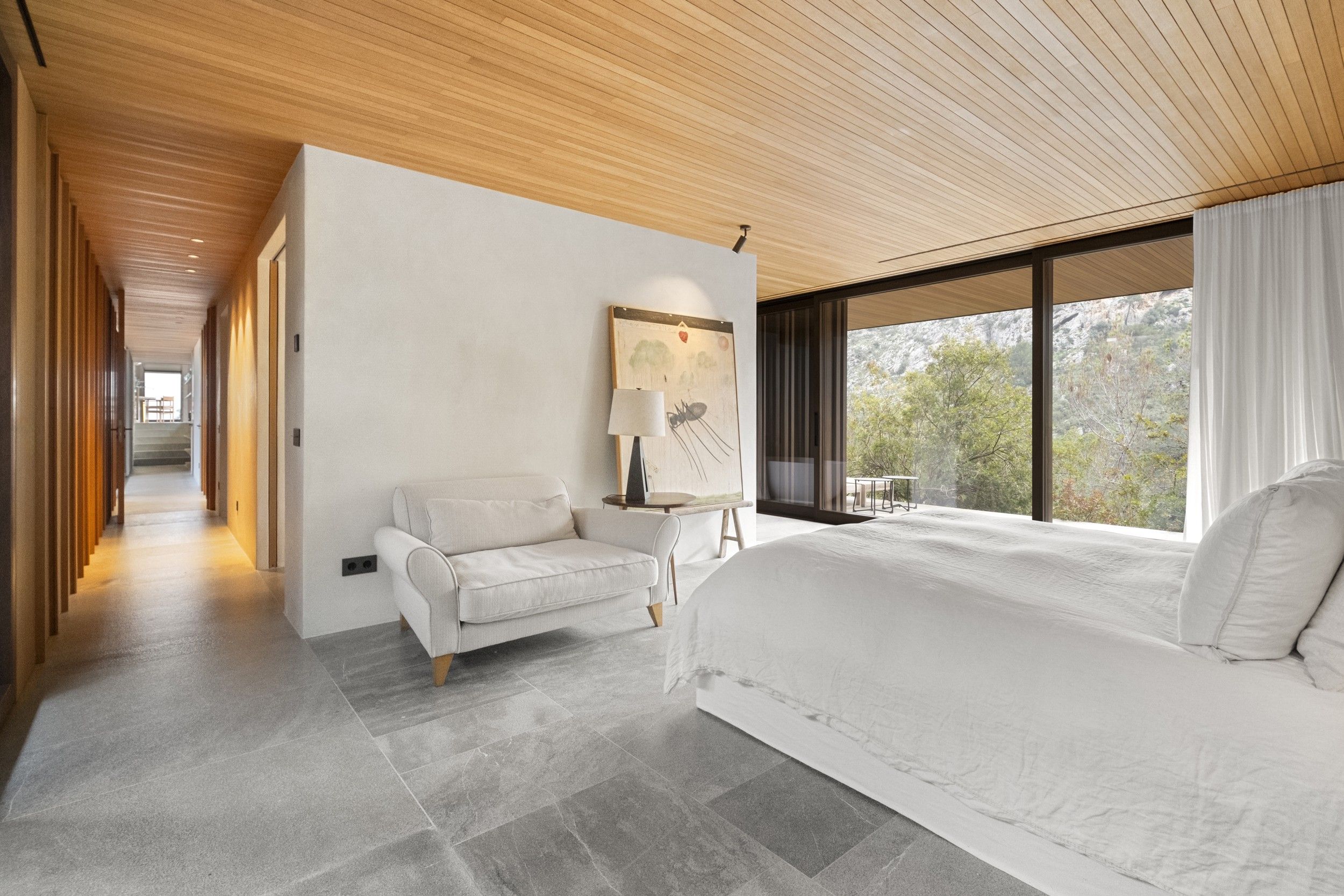 Ofreciendo total privacidad y, a la vez, estando a solo unos minutos de Palma, la villa ha sido diseñada para que la naturaleza entre en el hogar. Las ventanas de suelo a techo inundan los espacios de luz, mientras que el aroma a romero y cítricos, transportado por la suave brisa de la montaña, flota en el aire, convirtiendo la naturaleza en una presencia constante en la vida cotidiana. El paisaje preservado garantiza una conexión perfecta entre los espacios interiores y exteriores.