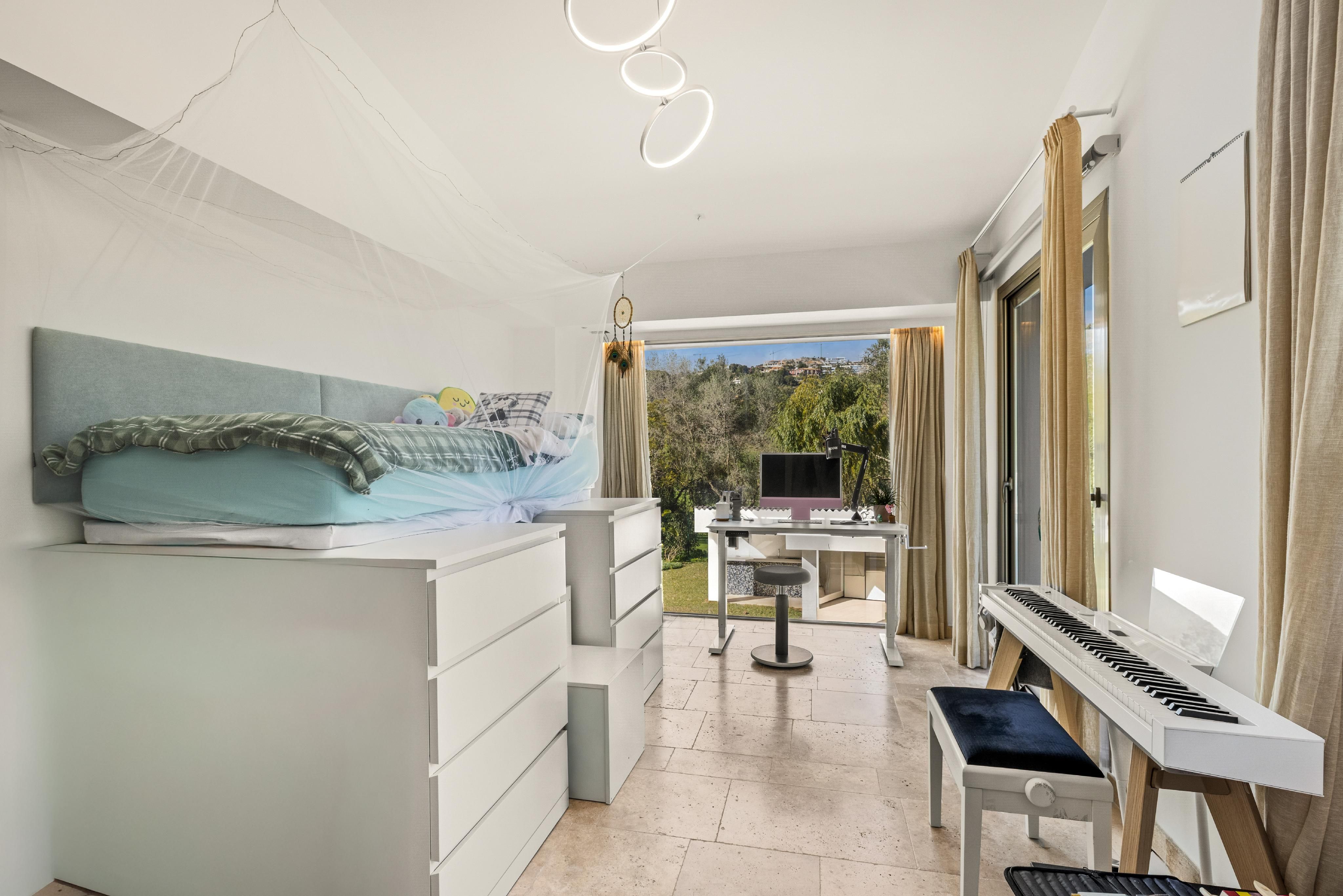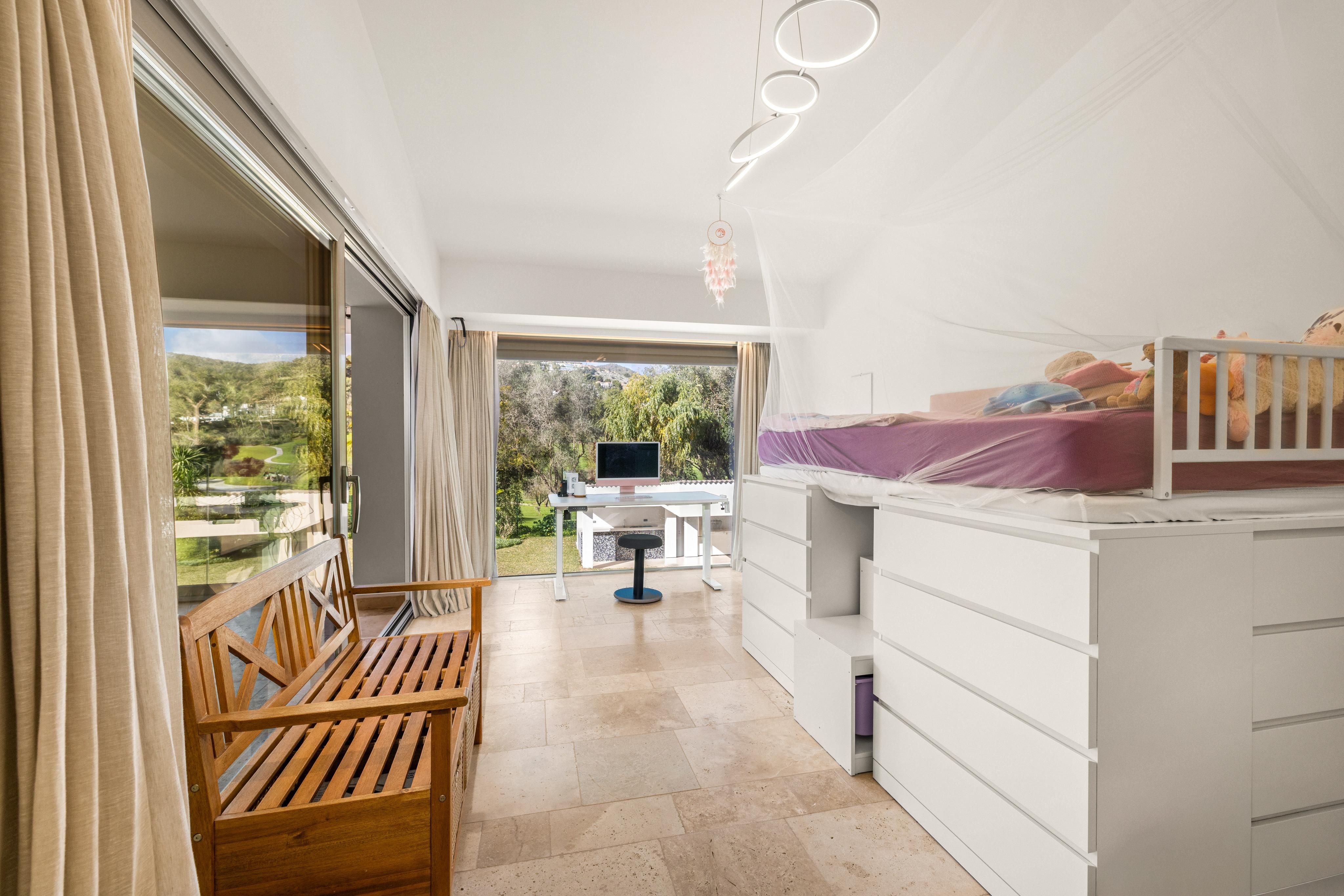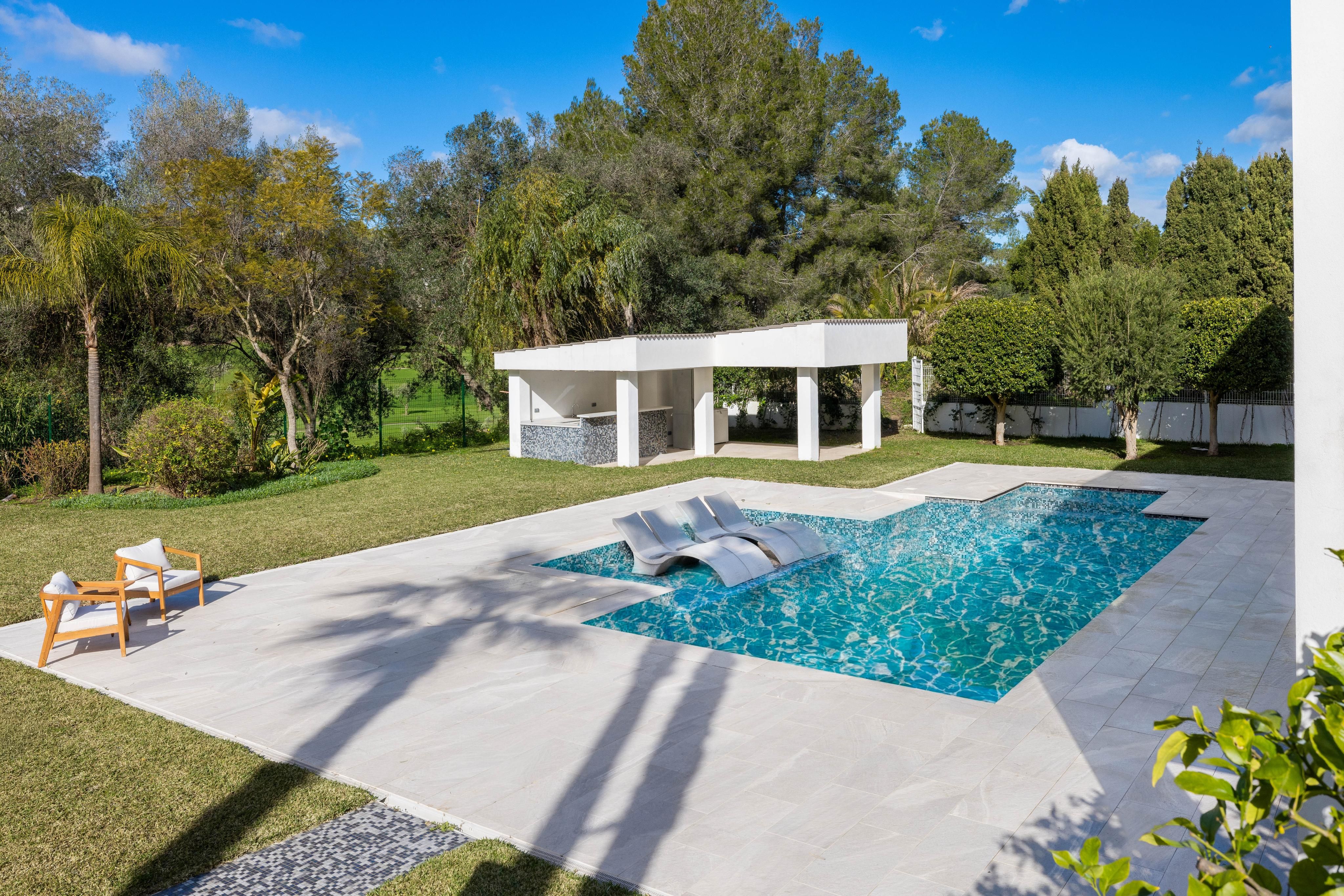 suite, tres dormitorios dobles con baño propio y un balcón cubierto con vistas al campo de golf. Todas las habitaciones tienen grandes ventanas panorámicas que ofrecen unas vistas fantásticas al campo de golf. El jardín cuenta con una amplia piscina y una zona exterior con cocina de verano, ideal para realizar diversas actividades. Otras características