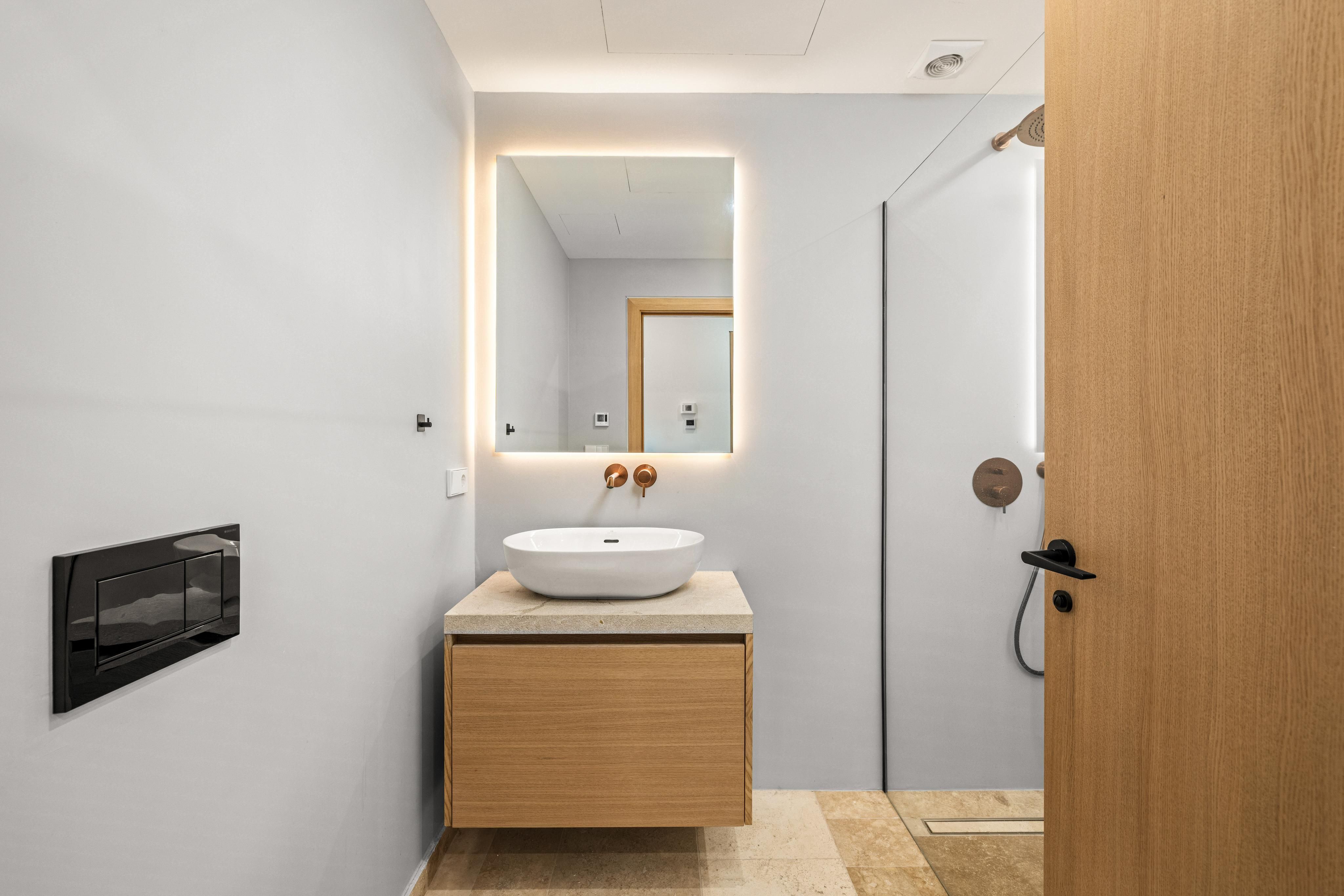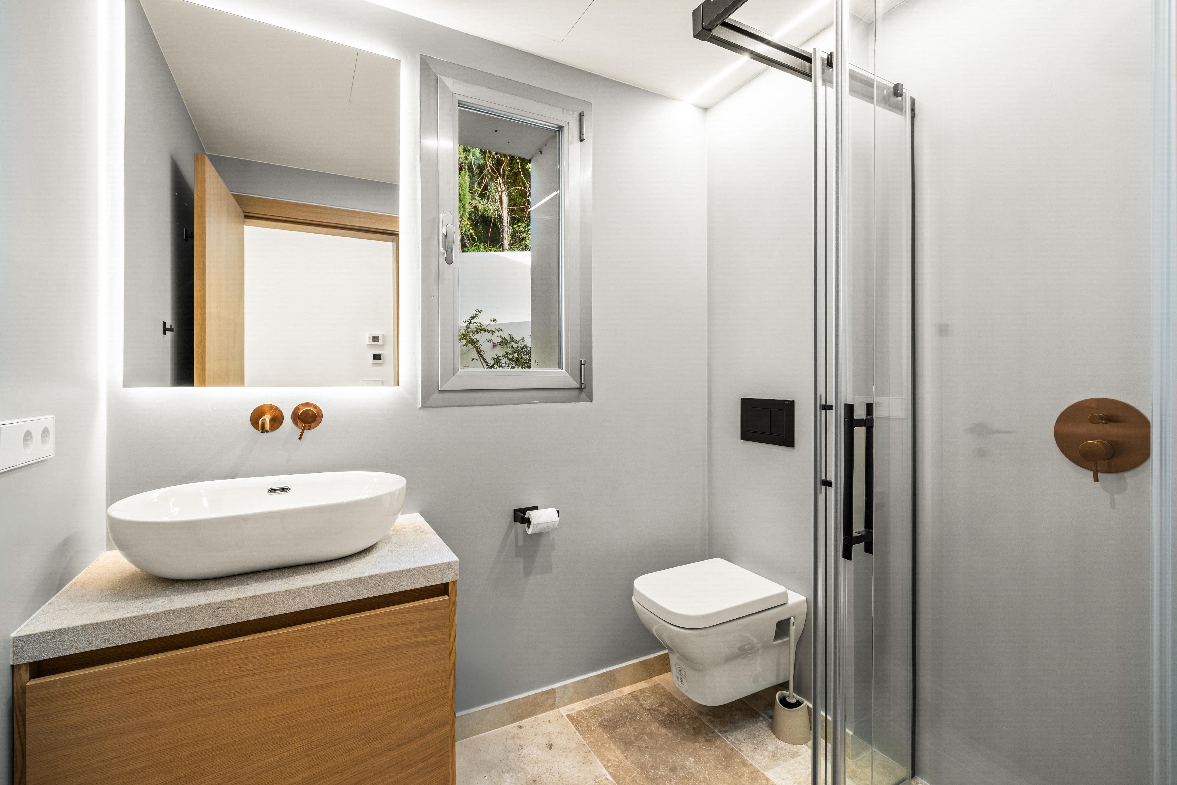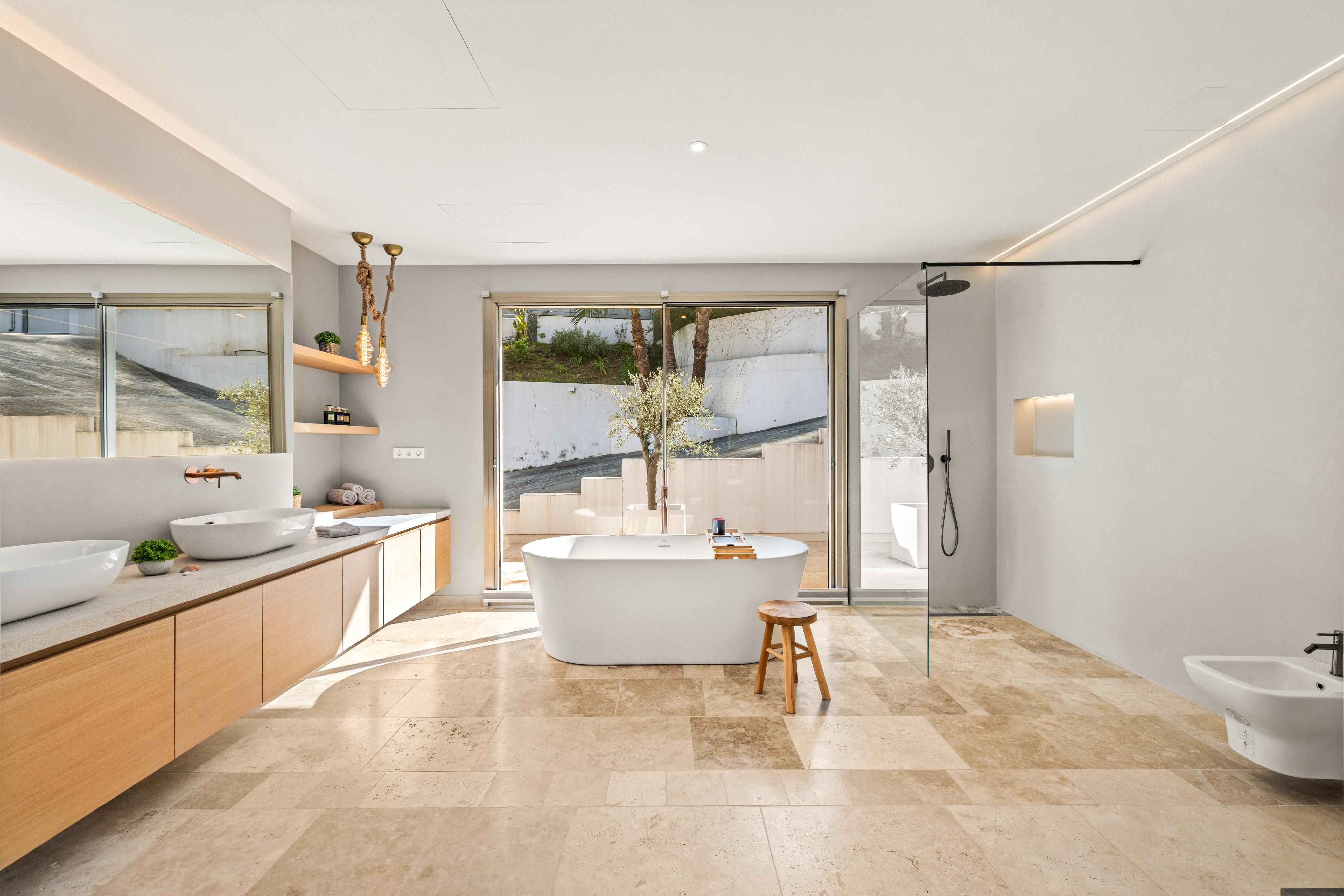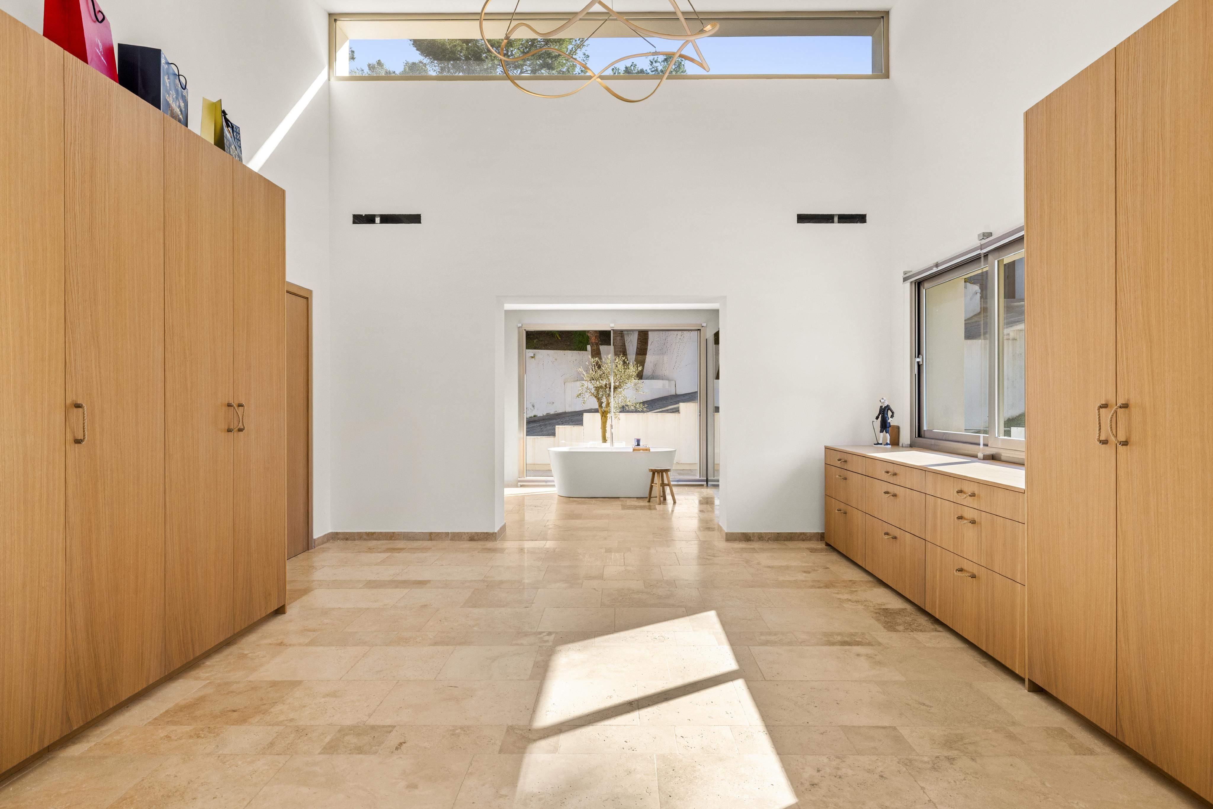 una superficie habitable de aproximadamente 547 m2. La planta principal, a la altura del jardín y la piscina, se distribuye en un amplio salón, comedor, una cocina completamente equipada y un aseo, así como un lavadero y una habitación de invitados. En la planta superior se encuentra el dormitorio principal con vestidor y baño en